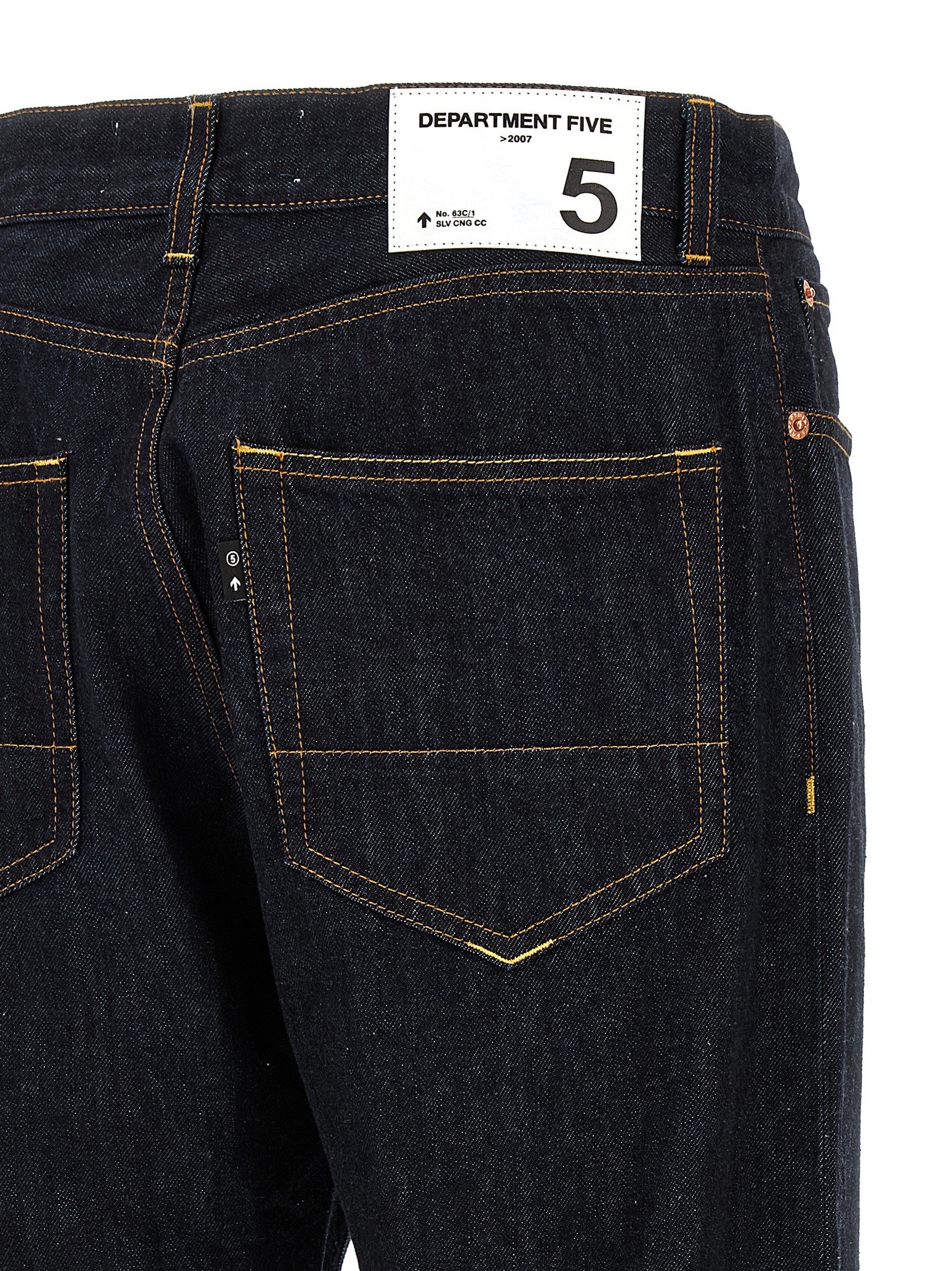 13 1/4 oz non-stretch cotton denim ‘Bowl’ jeans, contrast stitching, wide straight leg, medium waist, front button closure, five pockets, back logo tag.