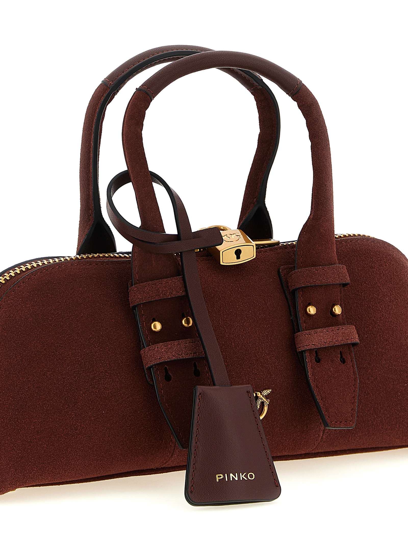 ‘Bowling Baguette’ suede shoulder bag, metal ‘Love Birds’ logo on the front and embroidered on the back, double adjustable handle, top zip closure with padlock detail, rigid base with metal feet, adjustable and removable shoulder strap.