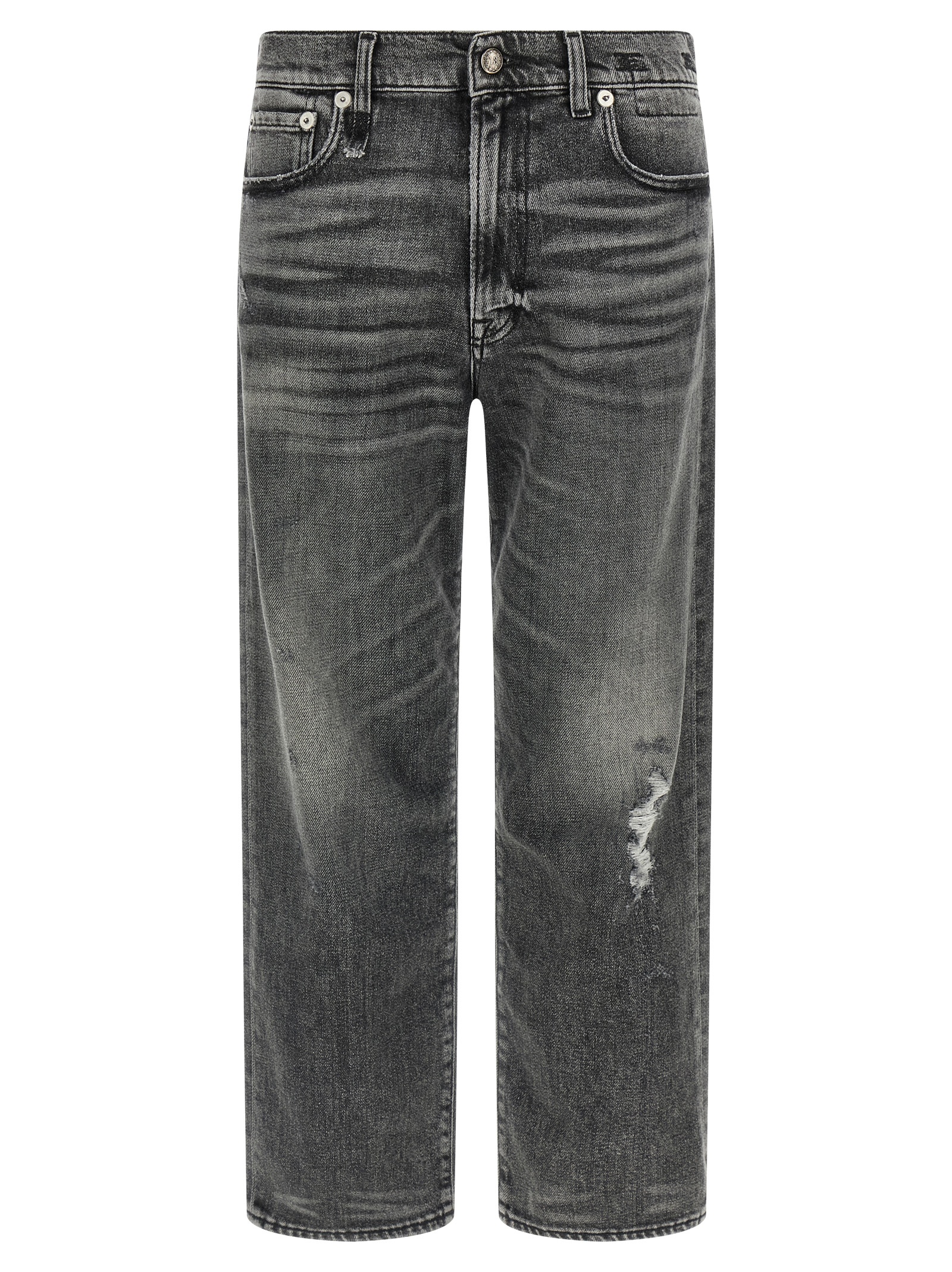 ‘Boyfriend’ stonewashed cotton denim jeans with rips, straight leg, front zip and button closure, five pockets, back logo tag.