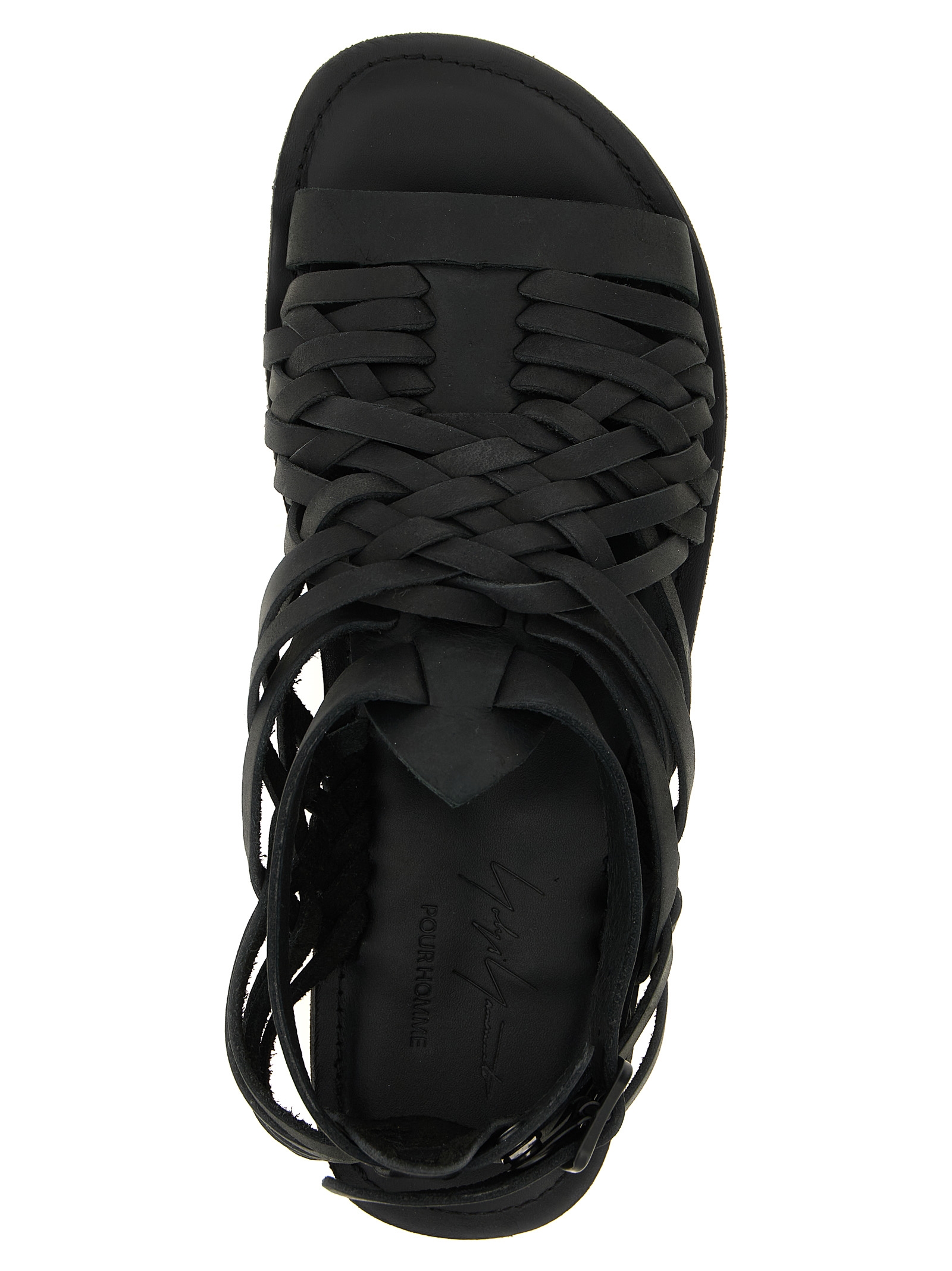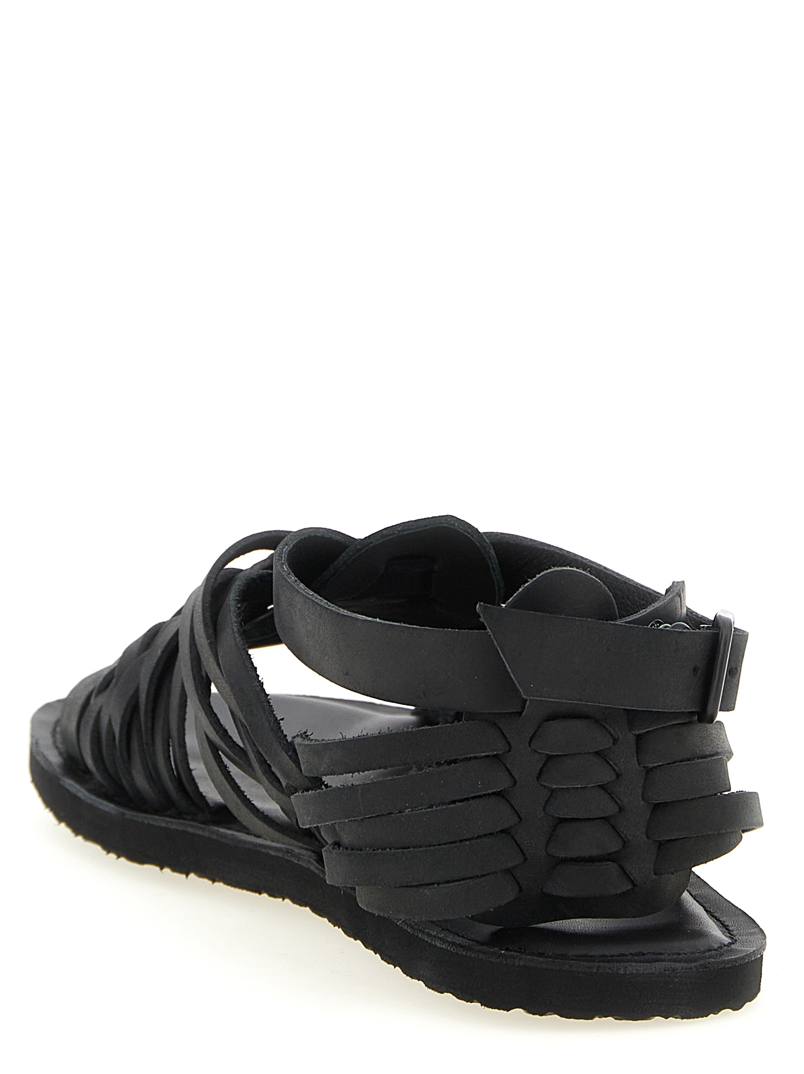 Oiled cowhide leather sandals inspired by traditional Mexican handcrafted footwear, woven strips, adjustable strap, rubber sole.