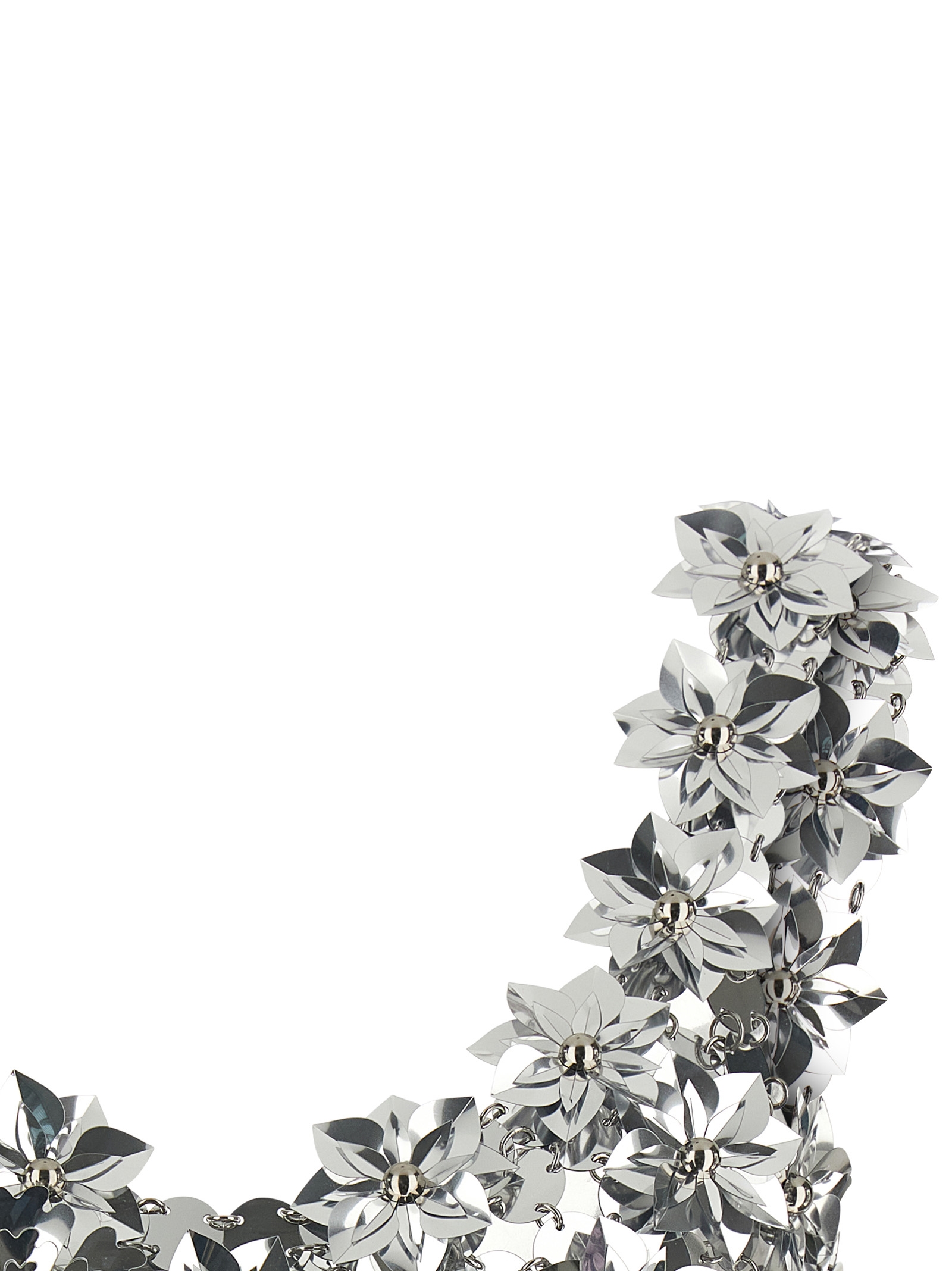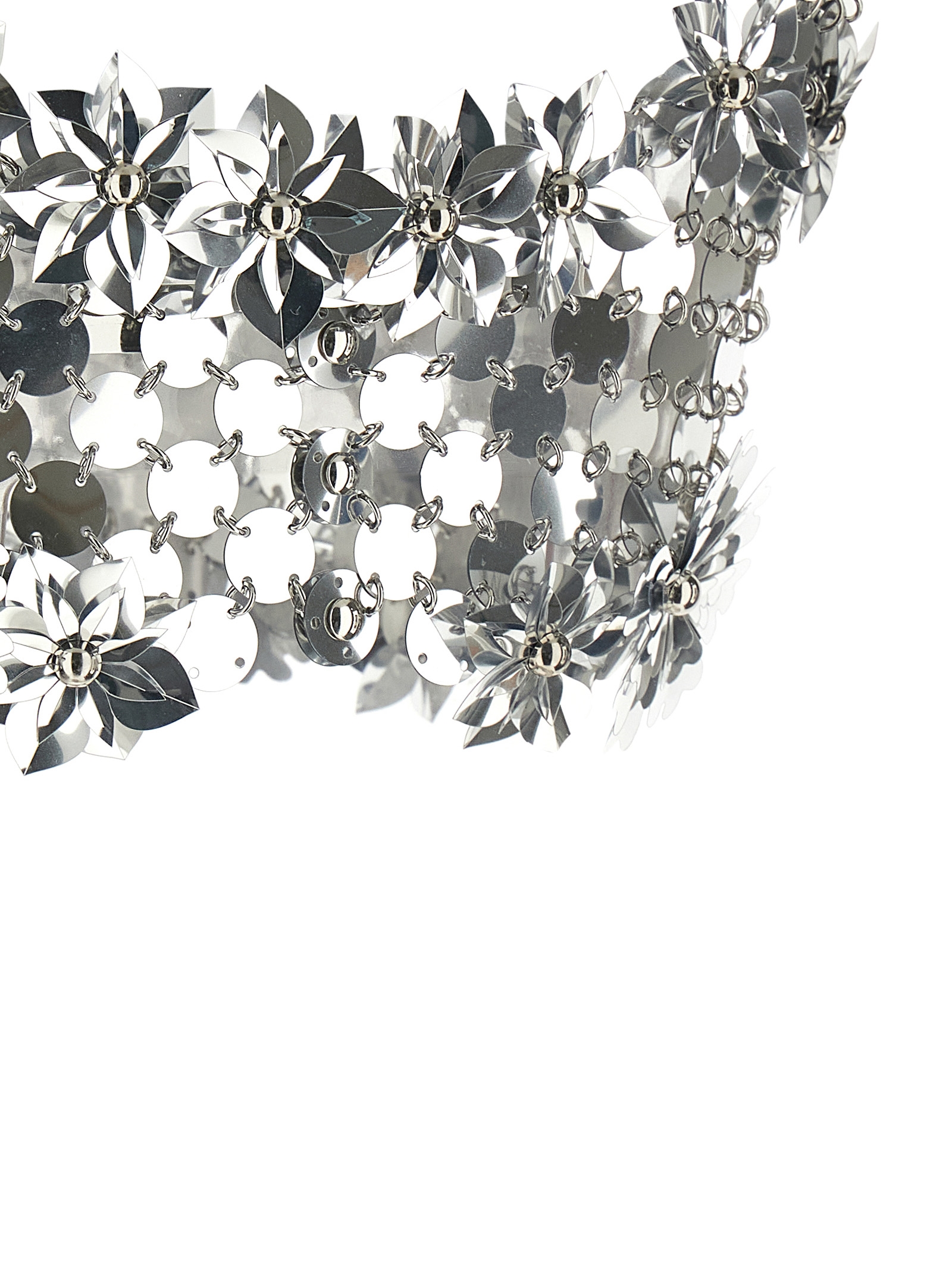 Hand assembled top with discs, metal rings and 3D floral elements, crop bralette model, wide round neckline front and back, back snap button closure.