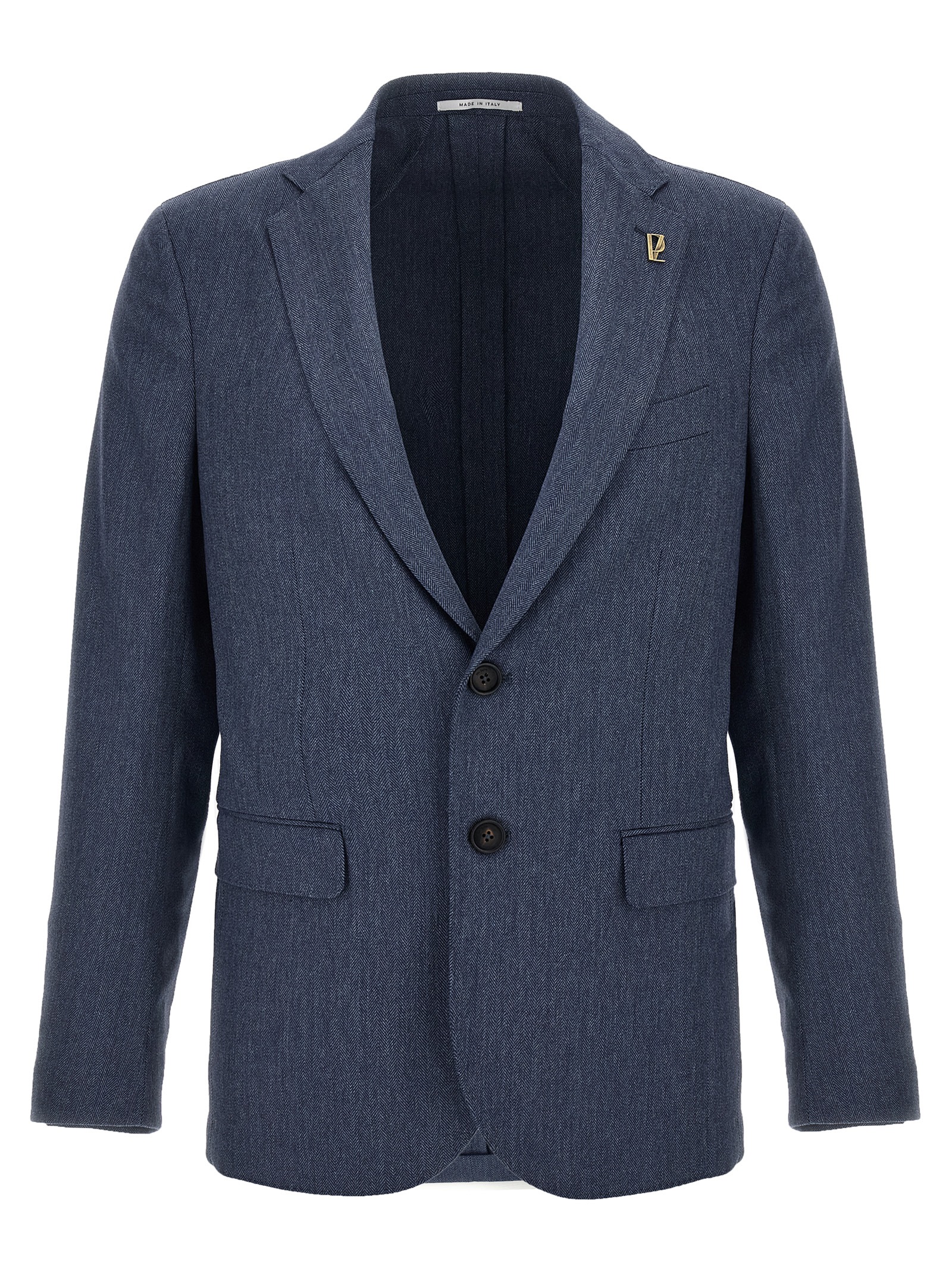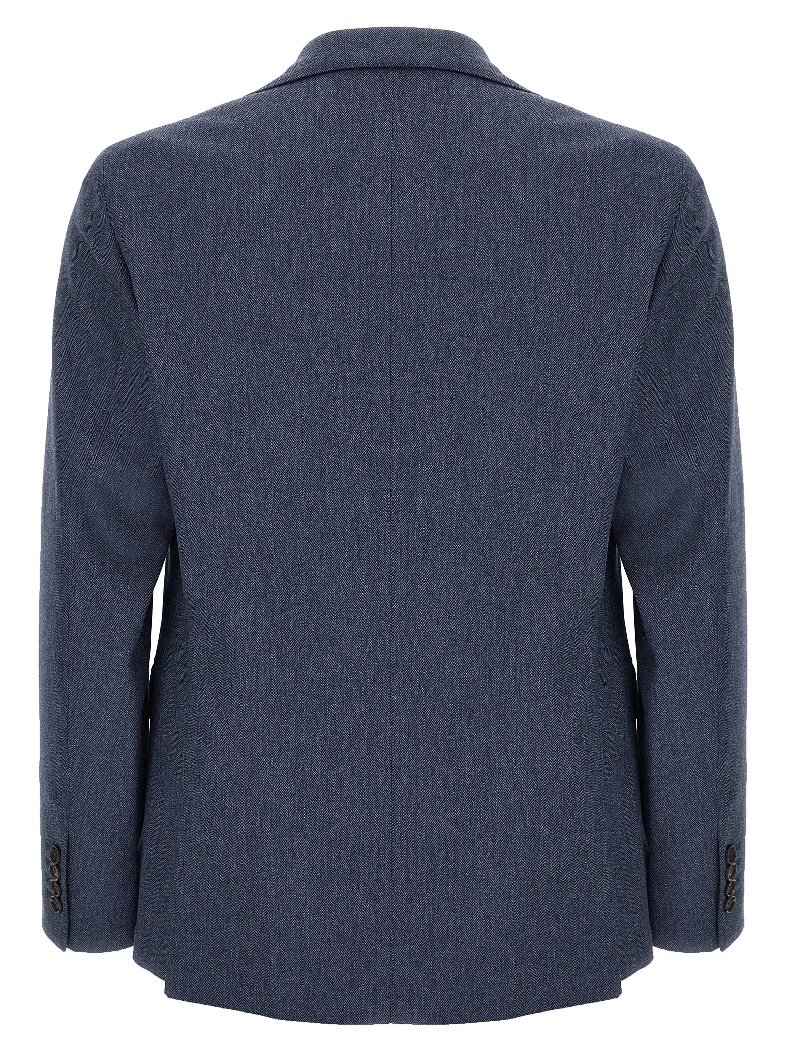‘Brera’ single-breasted blazer in herringbone wool with front button closure, peak lapels with removable metal brooch, breast pocket, patch pockets, two inner pockets, cuffs with opening buttonholes, back vents.