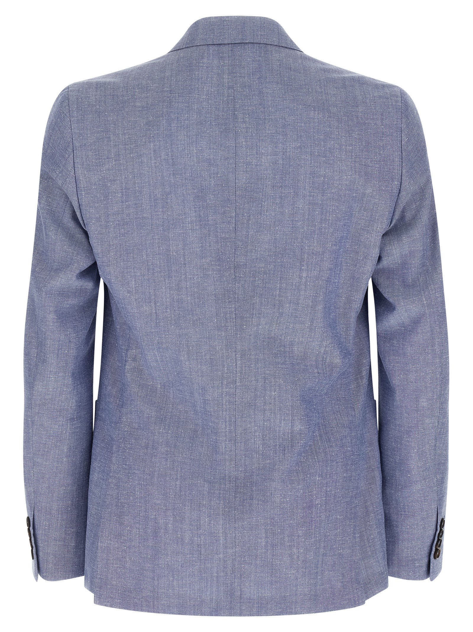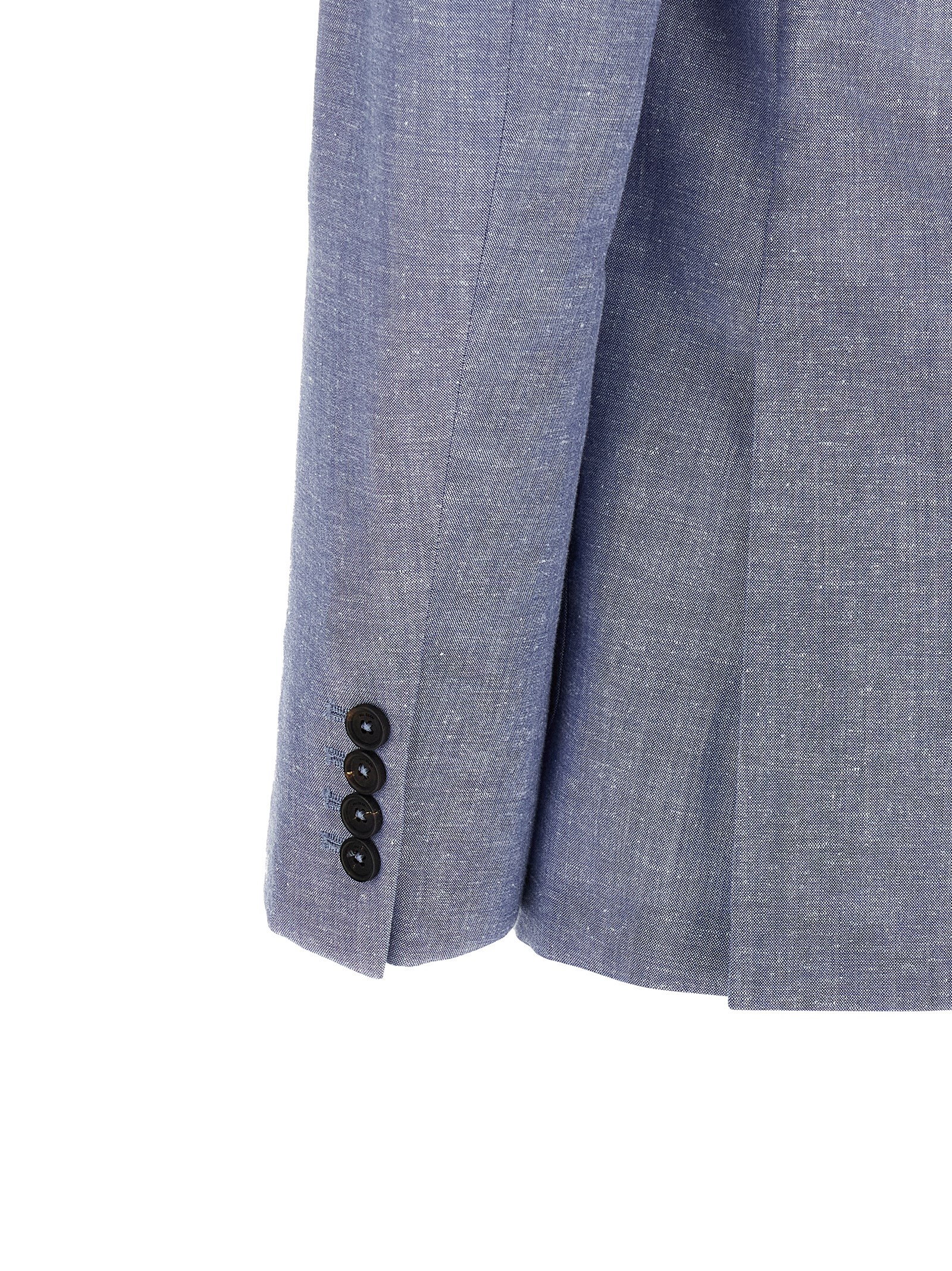 ‘Brera’ single-breasted blazer in wool, cotton and linen blend with front button closure, mirror lapels with removable metal pin, chest pocket, patch pockets, unlined, two inner pockets, cuffs with opening buttonholes, back vents.