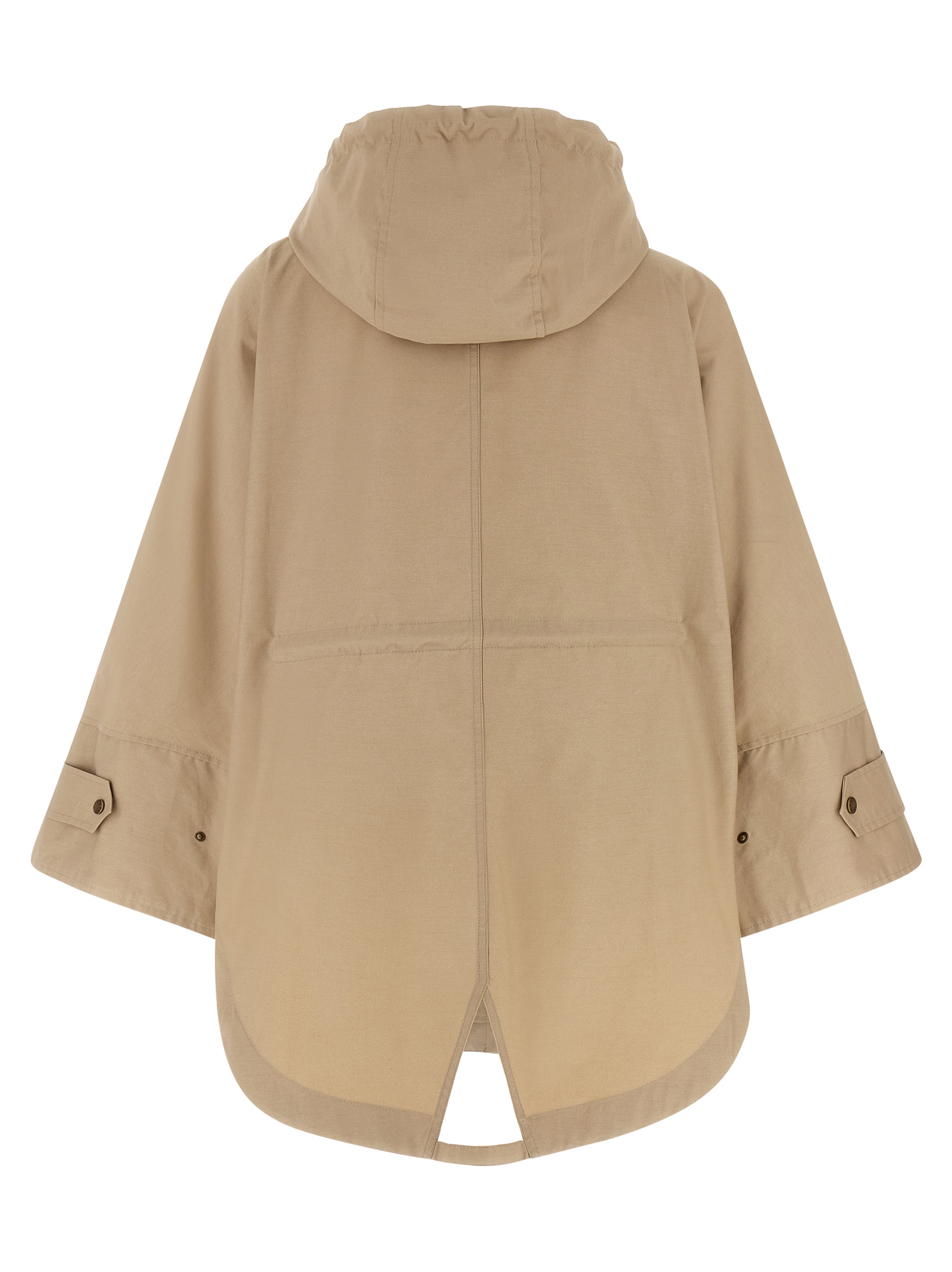 ‘Brunnera’ cotton parka with water repellent treatment, adjustable hood, high neck, zip closure and front snap buttons, long wide bat sleeves with adjustable cuffs and felt logo patch, drawstring at the waist, rounded hem with back cut-out, unlined.