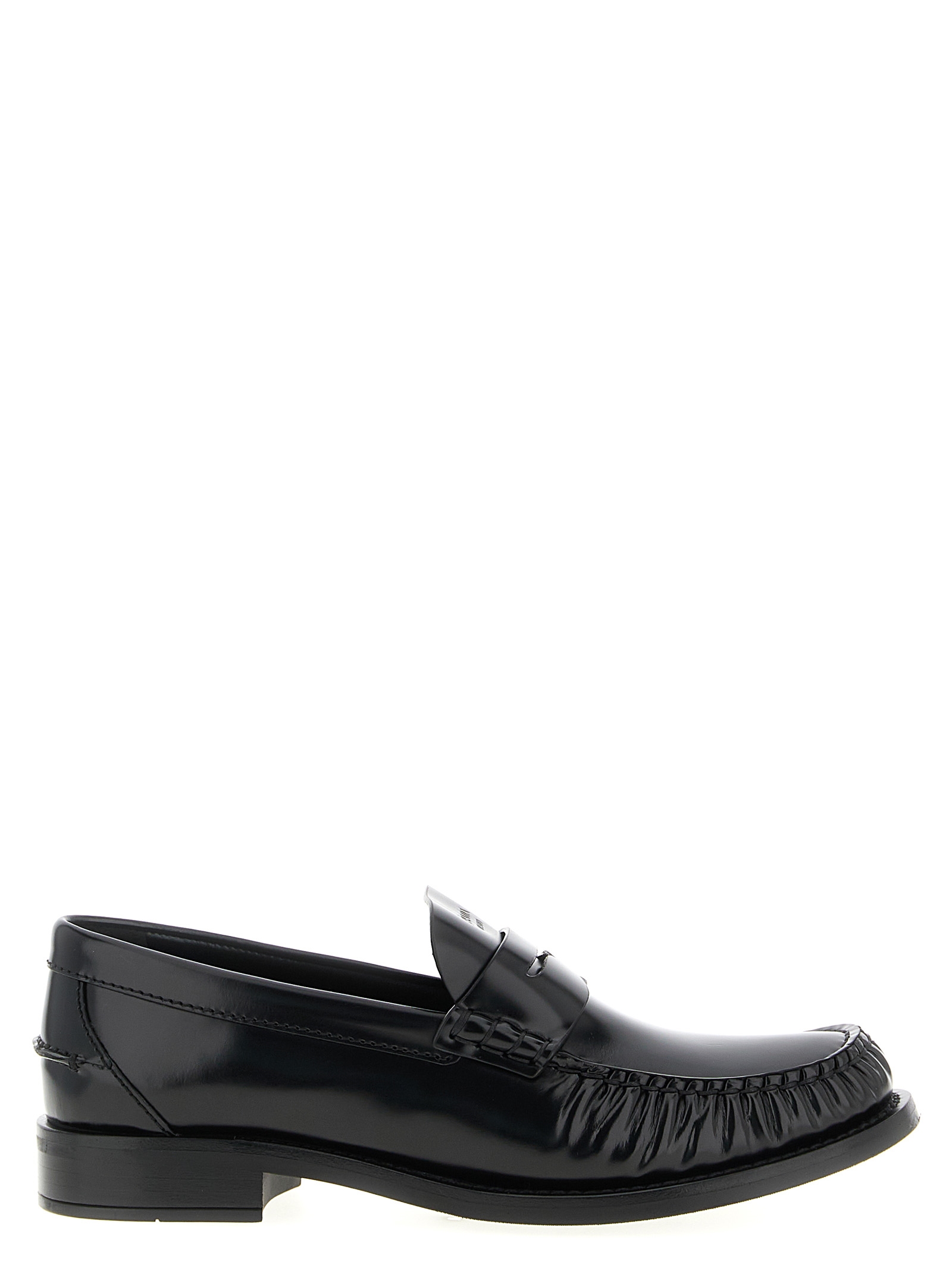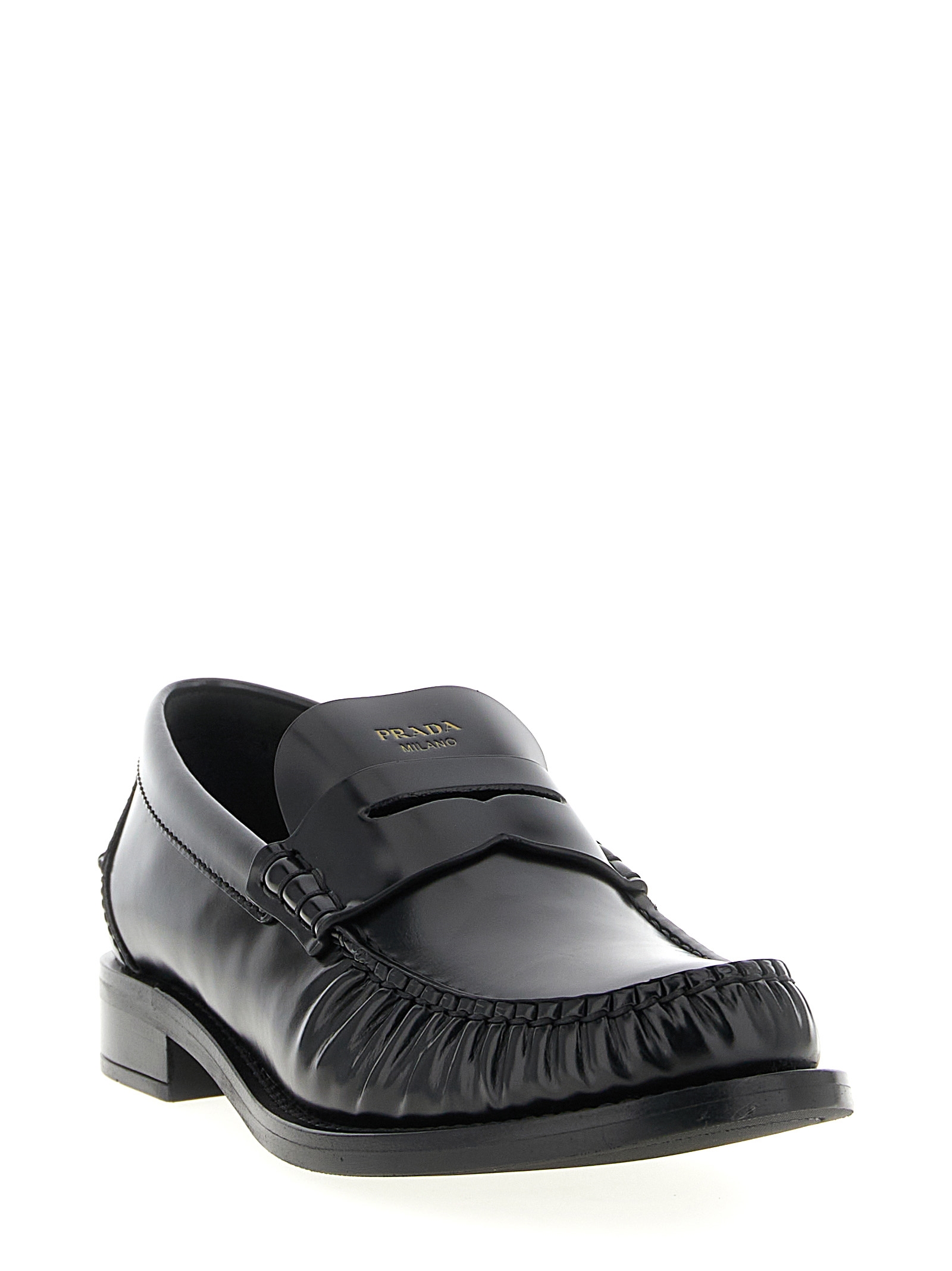 Brushed leather loafers with front embossed logo, monobloc rubber sole with logo on fire.
