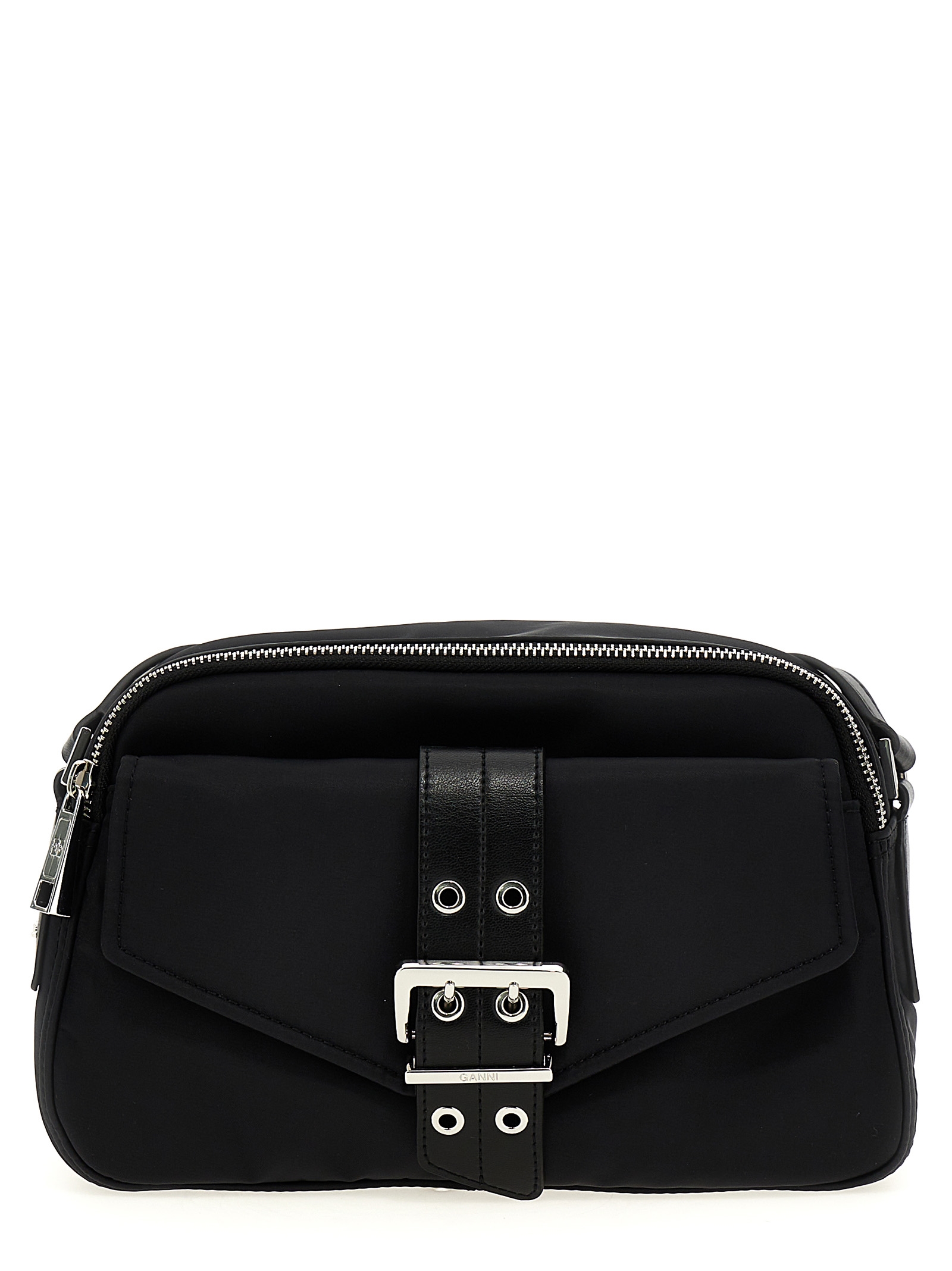 ‘Bucky’ canvas crossbody bag with leather-effect details, metal details, zip closure, front flap pocket, adjustable shoulder strap.