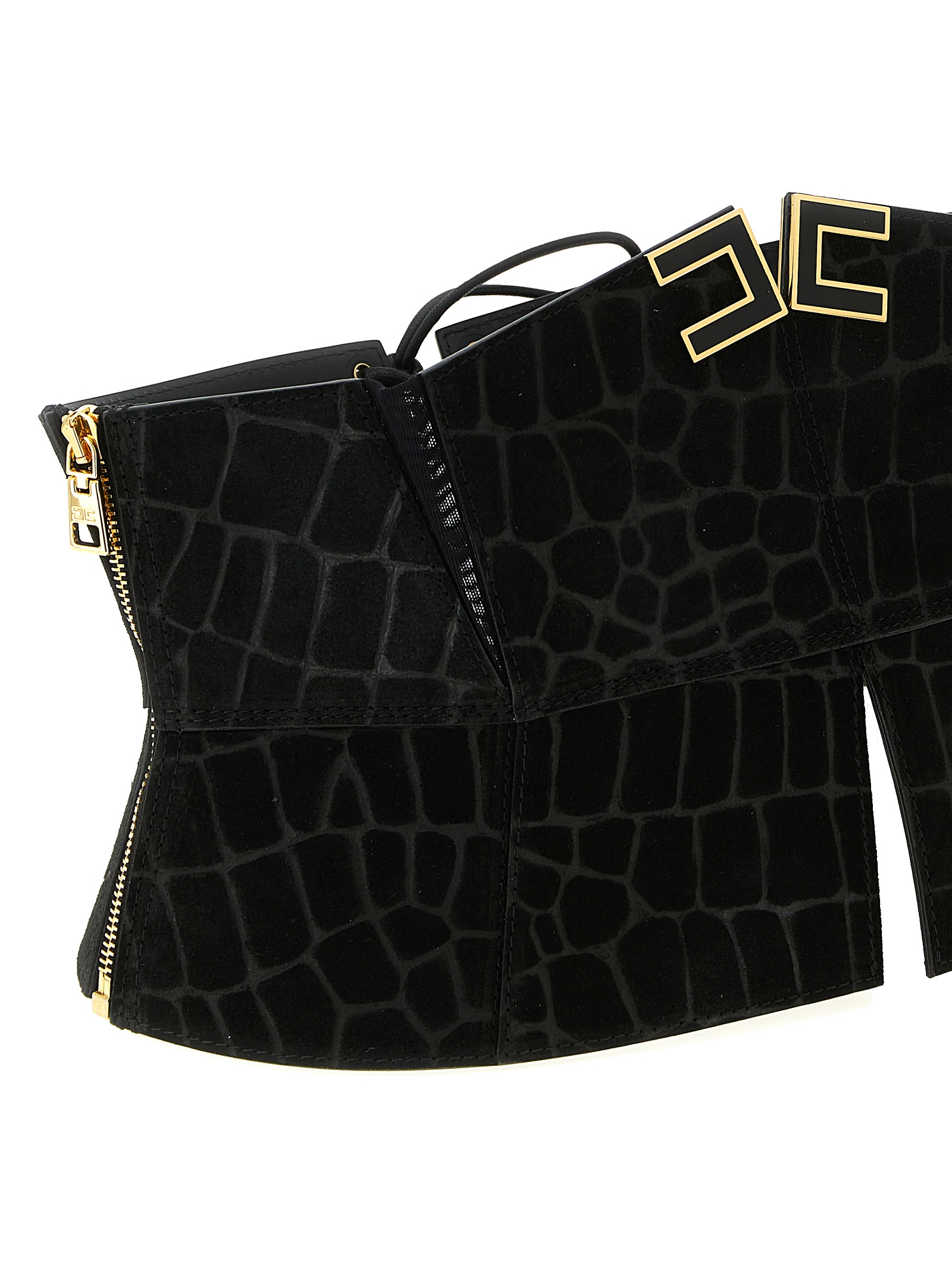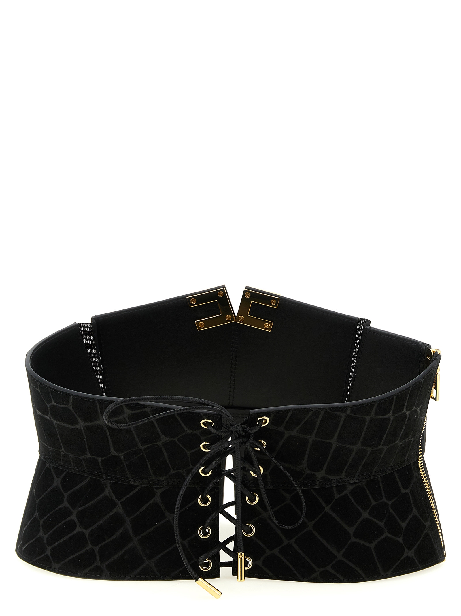 Coconut-effect nubuck leather belt with cut-out and semi-transparent tulle inserts, front enamelled metal logo, adjustable criss-cross laces at the back.