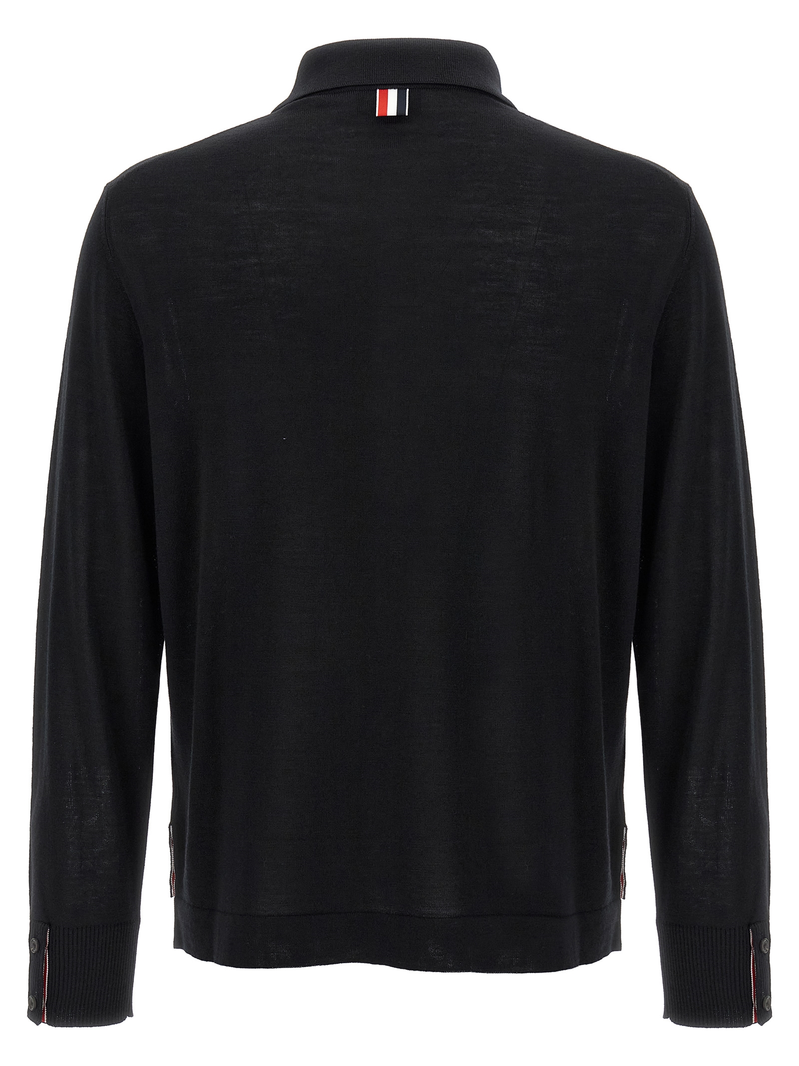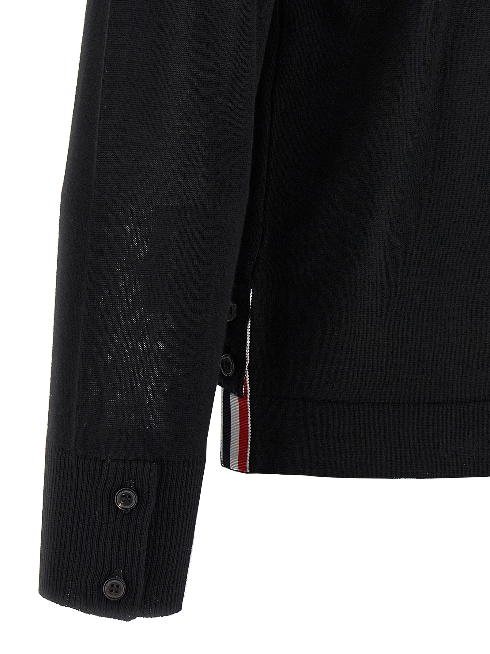 ‘Button Down’ wool cardigan with shirt collar, button closure, patch pocket, side slits with ‘RWB’ detail, long sleeves with cuffs and buttons, asymmetrical length.