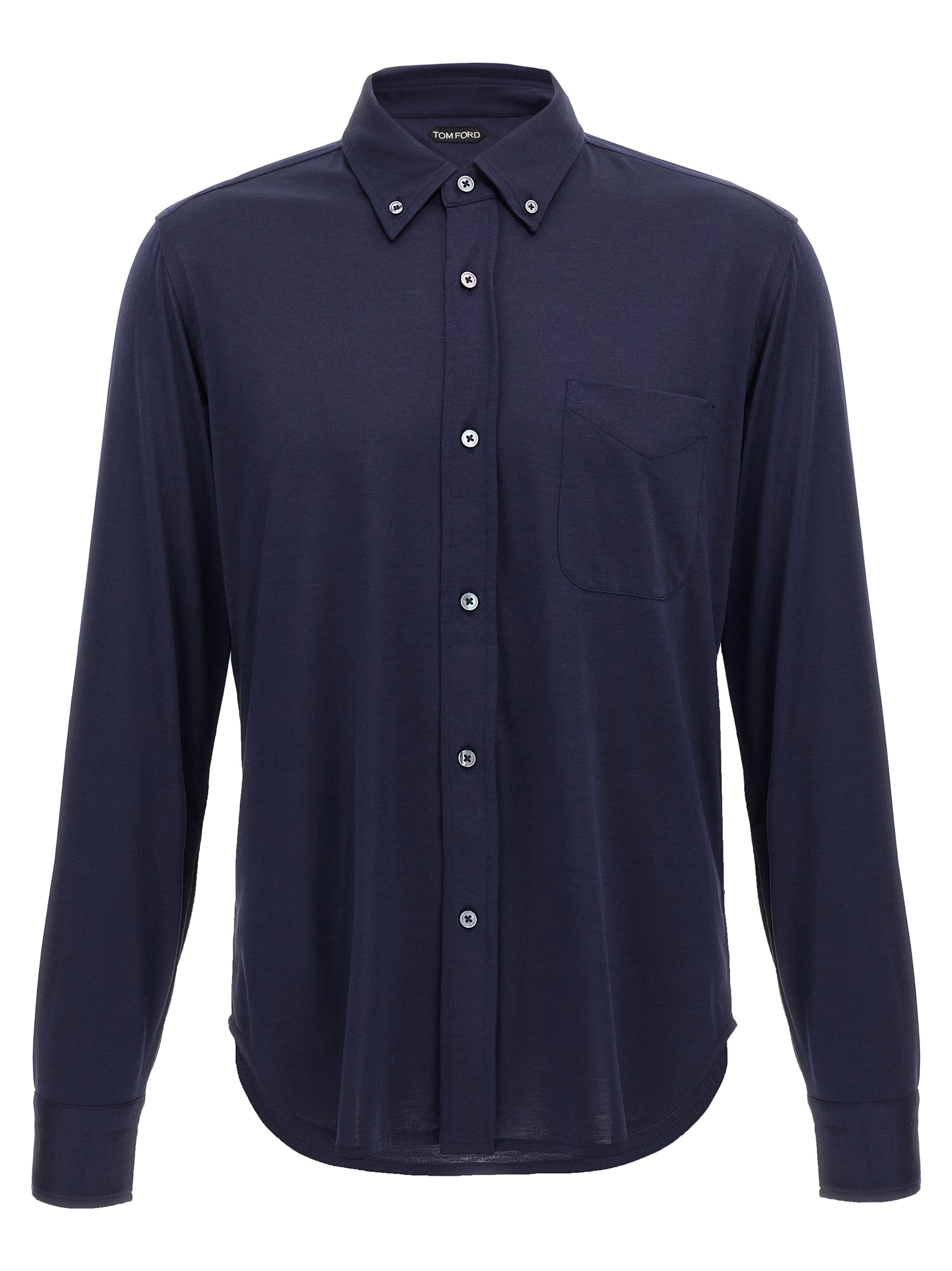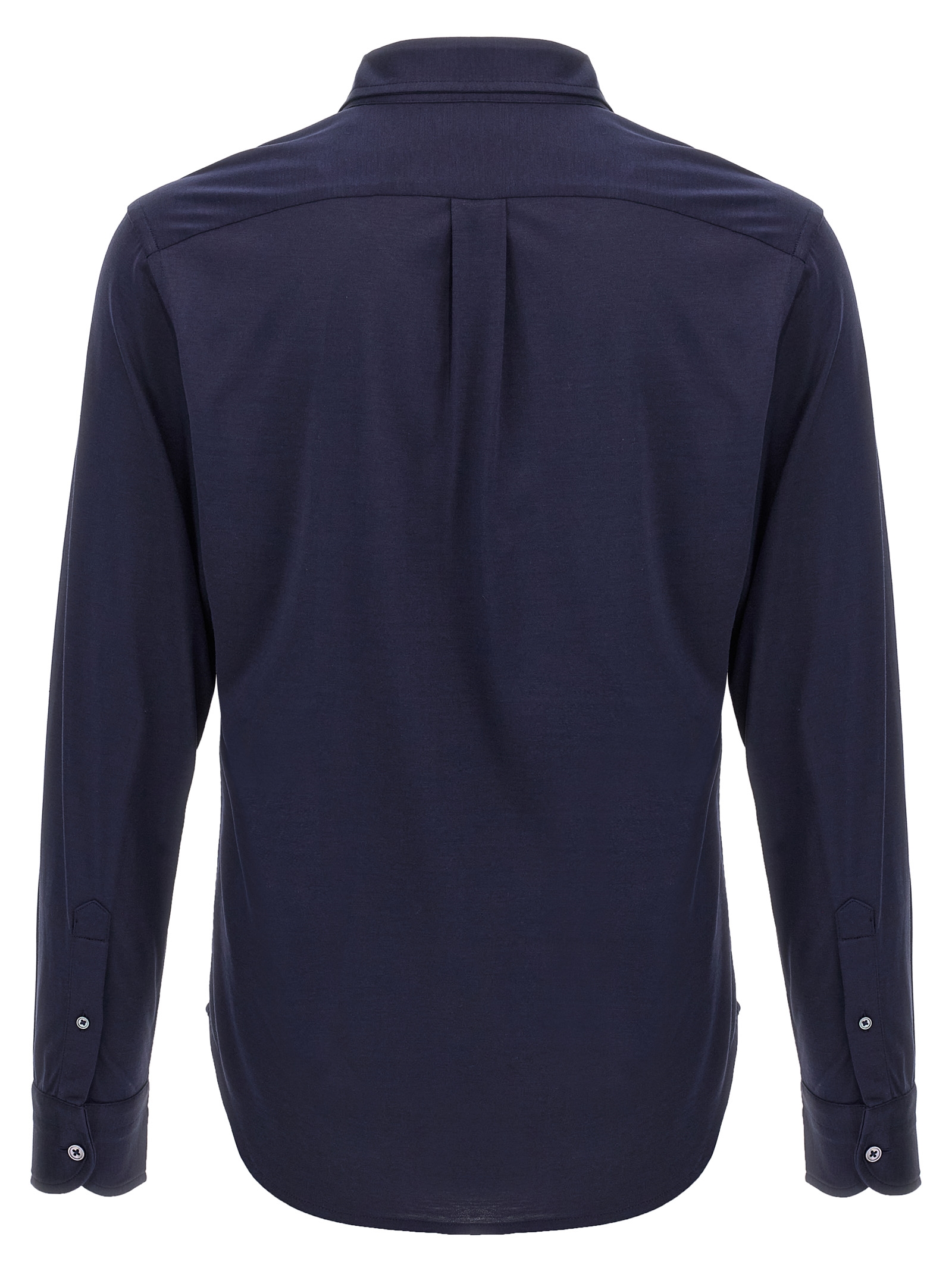 Silk and cotton blend shirt with button-down style, front button closure, chest pocket, long cuffed sleeves.