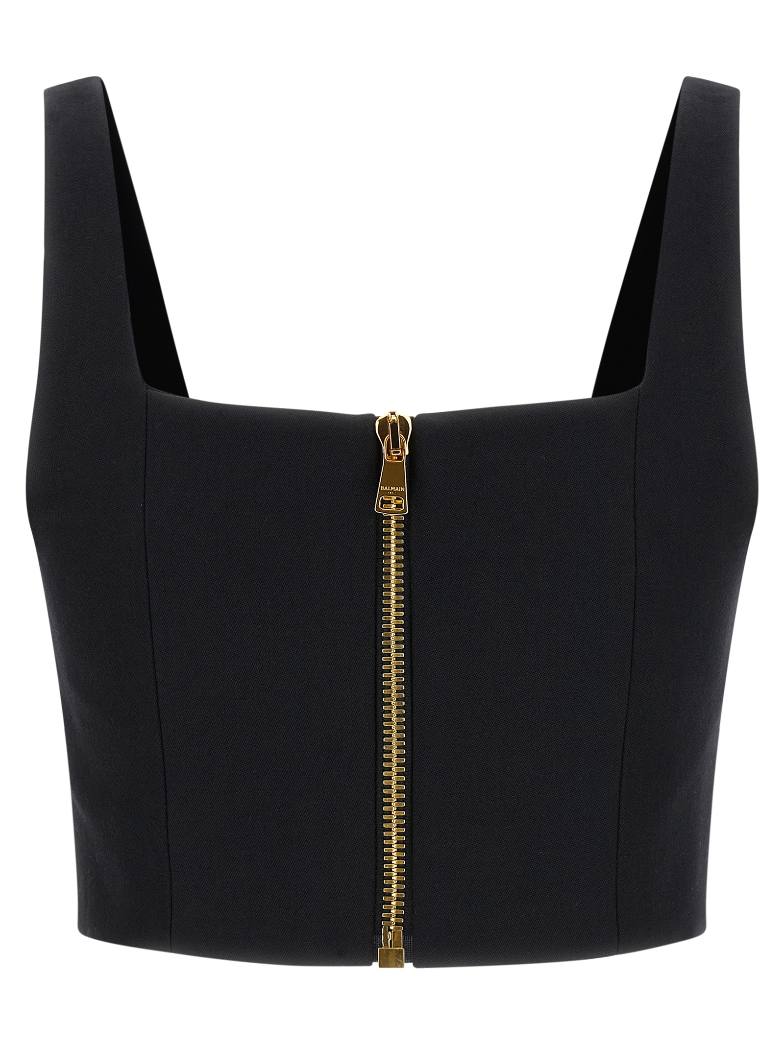 Cropped wool top with ‘Leone doppia catena’ buttons, round neckline, and center zip closure at the back.