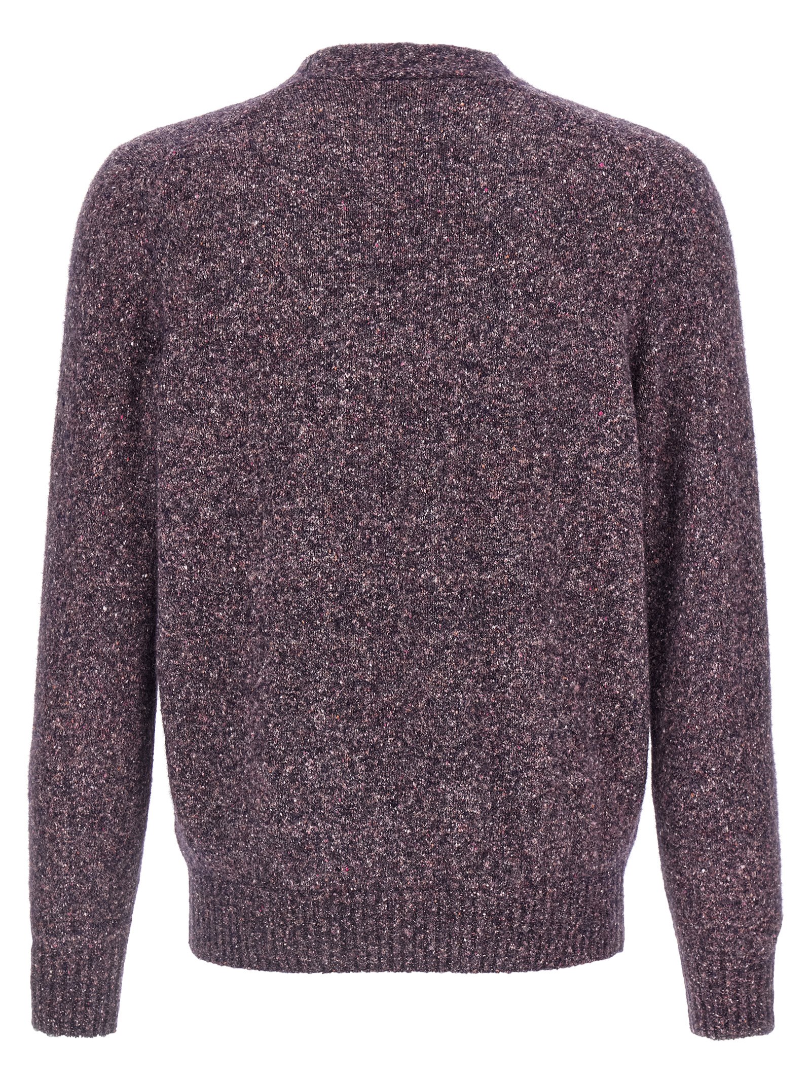 Cardigan in fluffy and buttoned alpaca yarn, wool, silk and cotton, V-neck, front metal button closure, long cuffed sleeves.