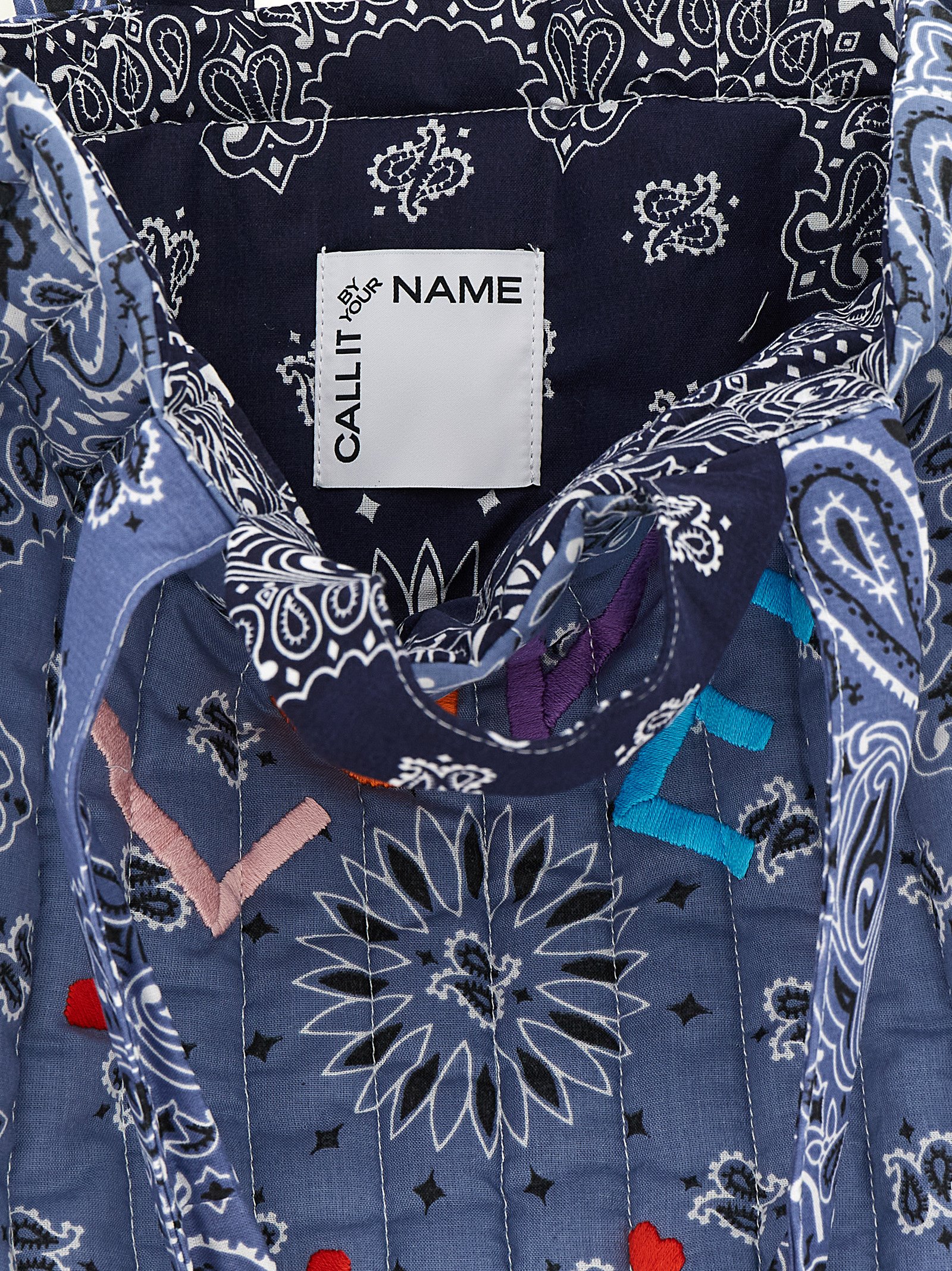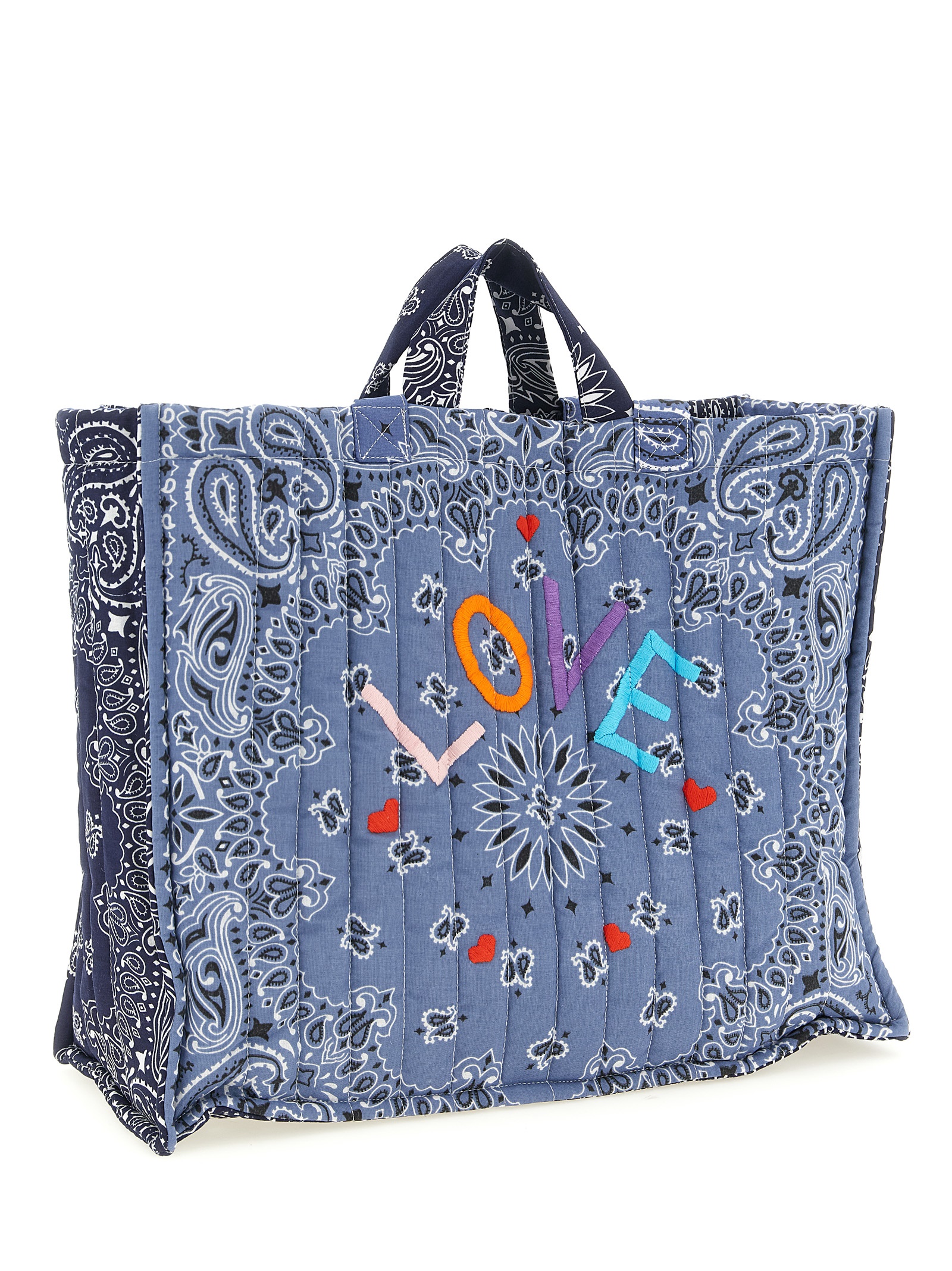 ‘Cabas’ maxi shopping bag in quilted and padded cotton with ‘Bandana’ print, front embroidery, short hand handle, long shoulder handle.