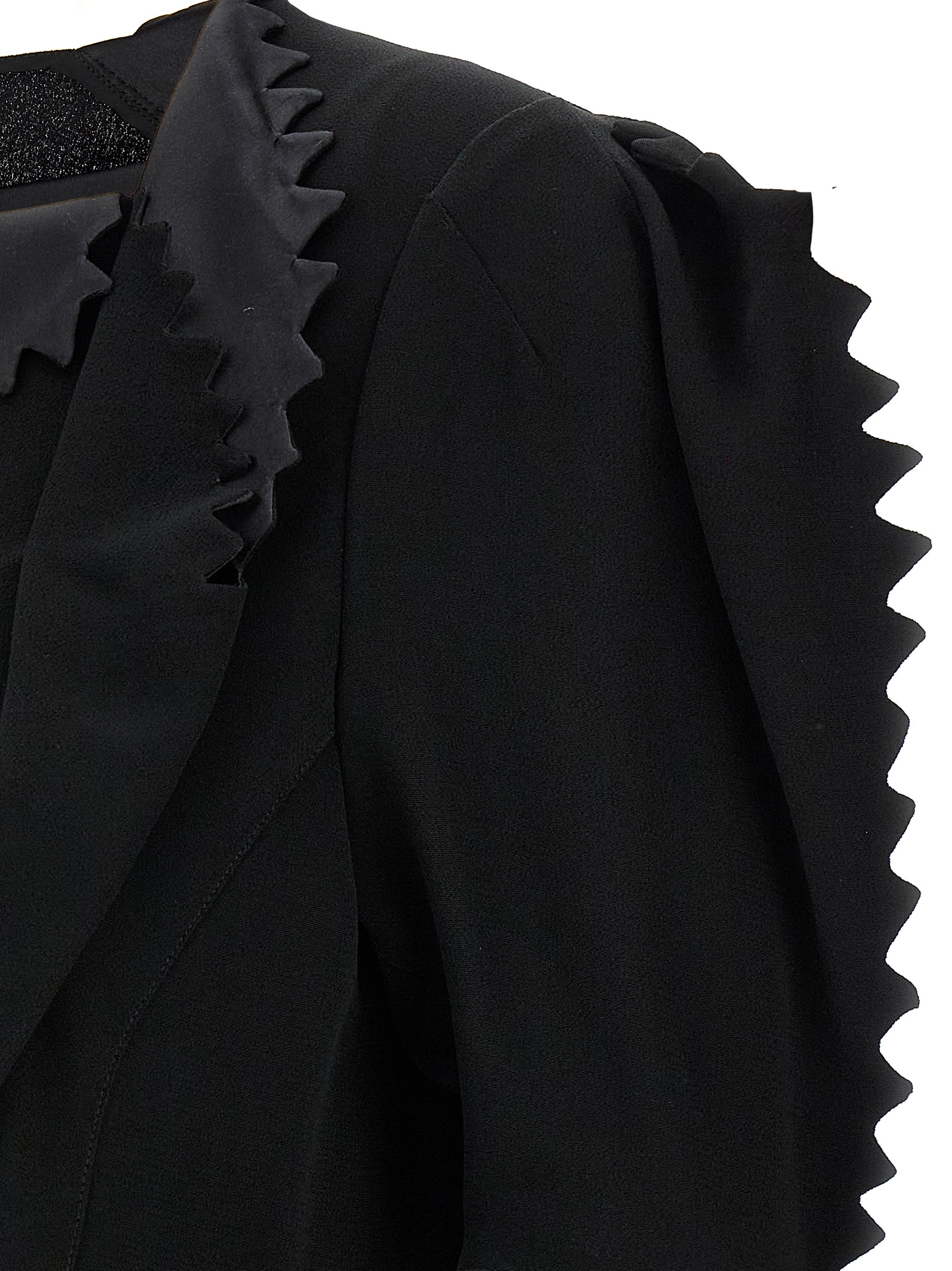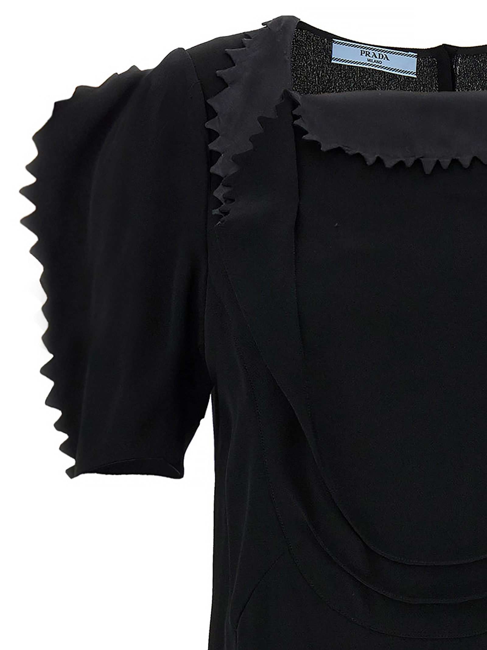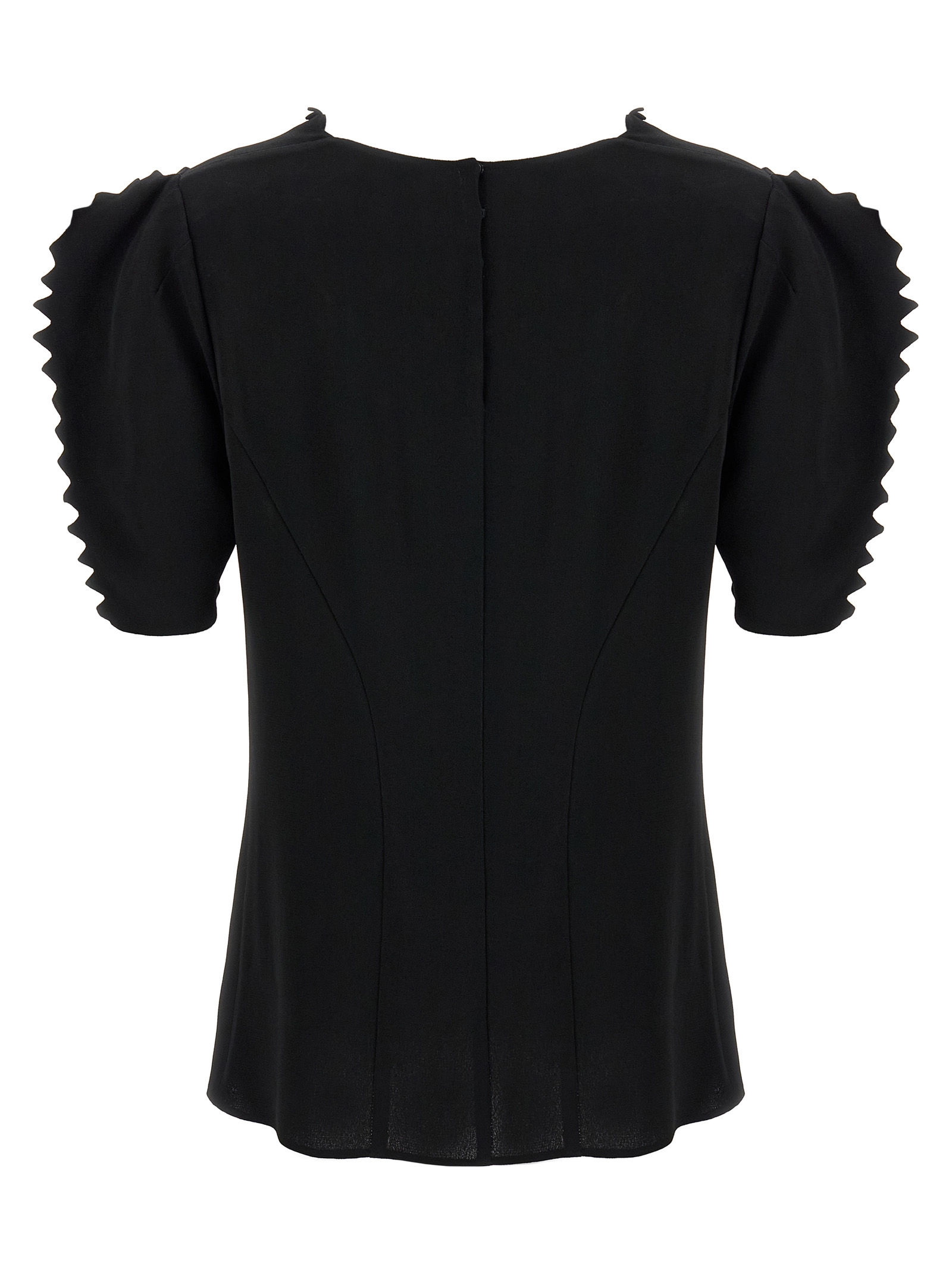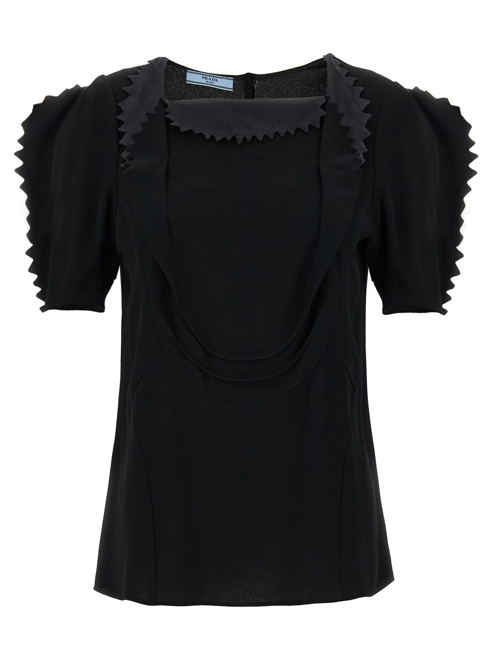 Crêpe cady top with front pleats and draping, square neckline, back snap button closure, and short balloon sleeves.