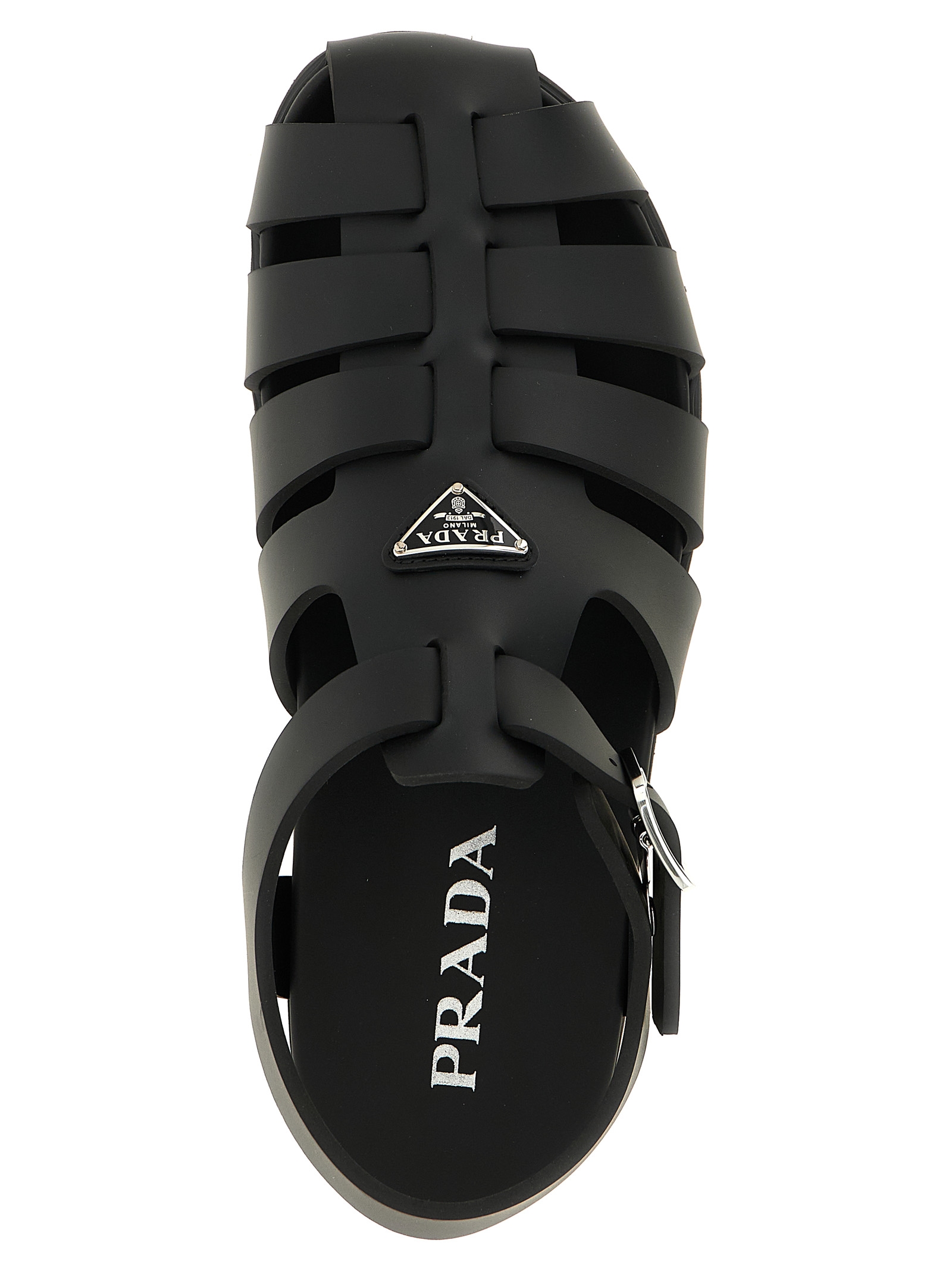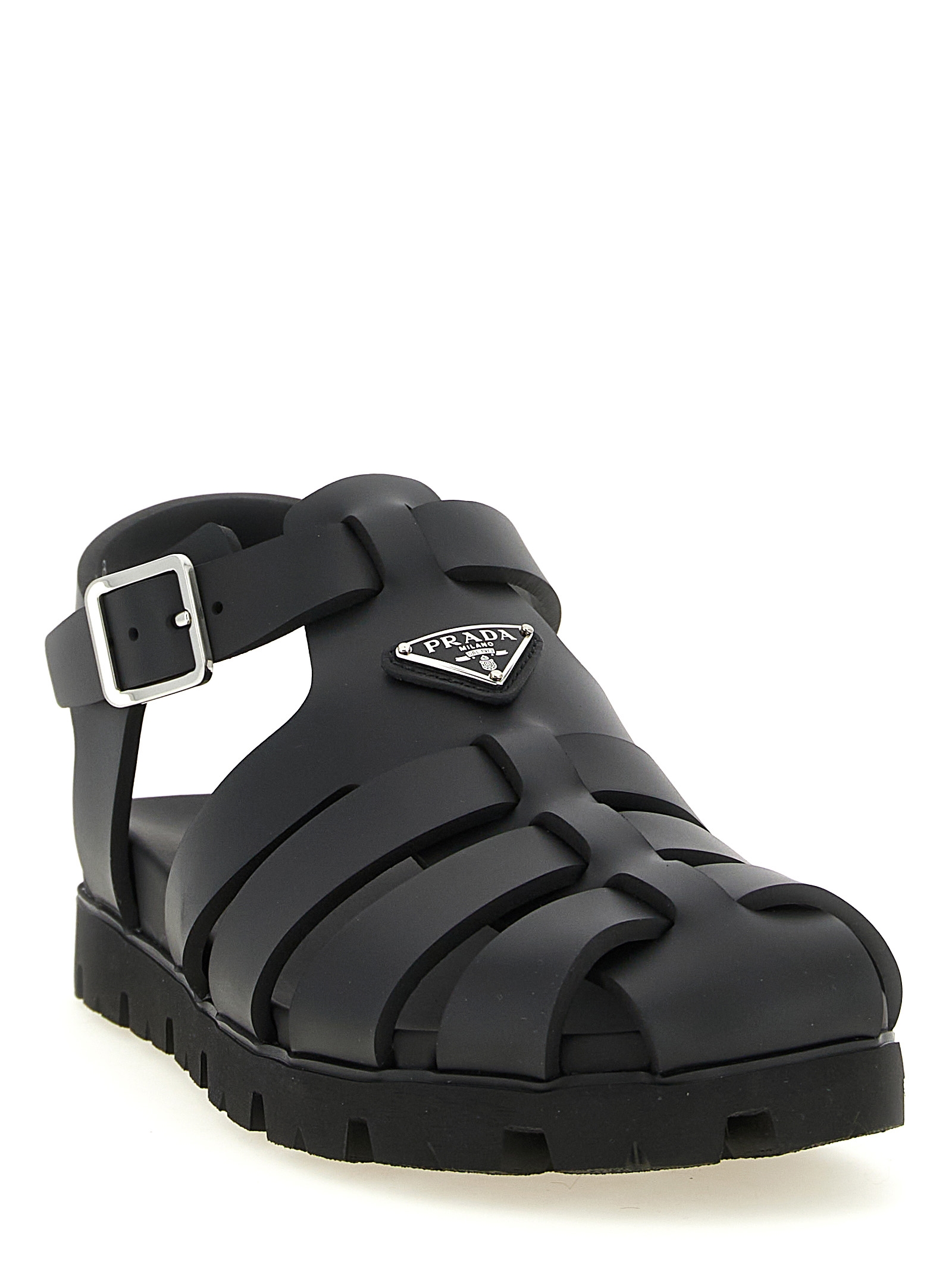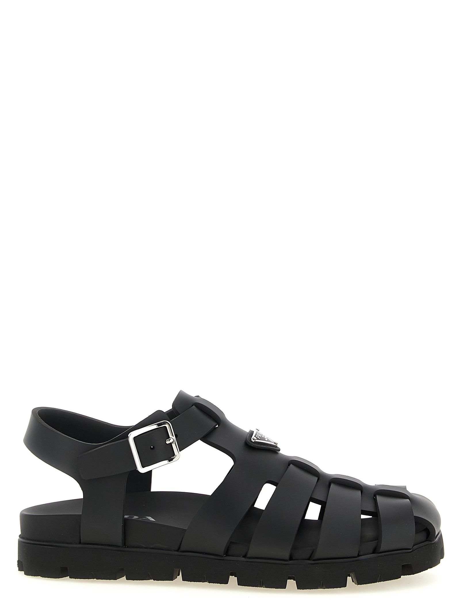 Rubber sandals, cage design, triangle logo in enameled metal on the front, wrapped leather insole, adjustable strap, rubber sole with notched tread.