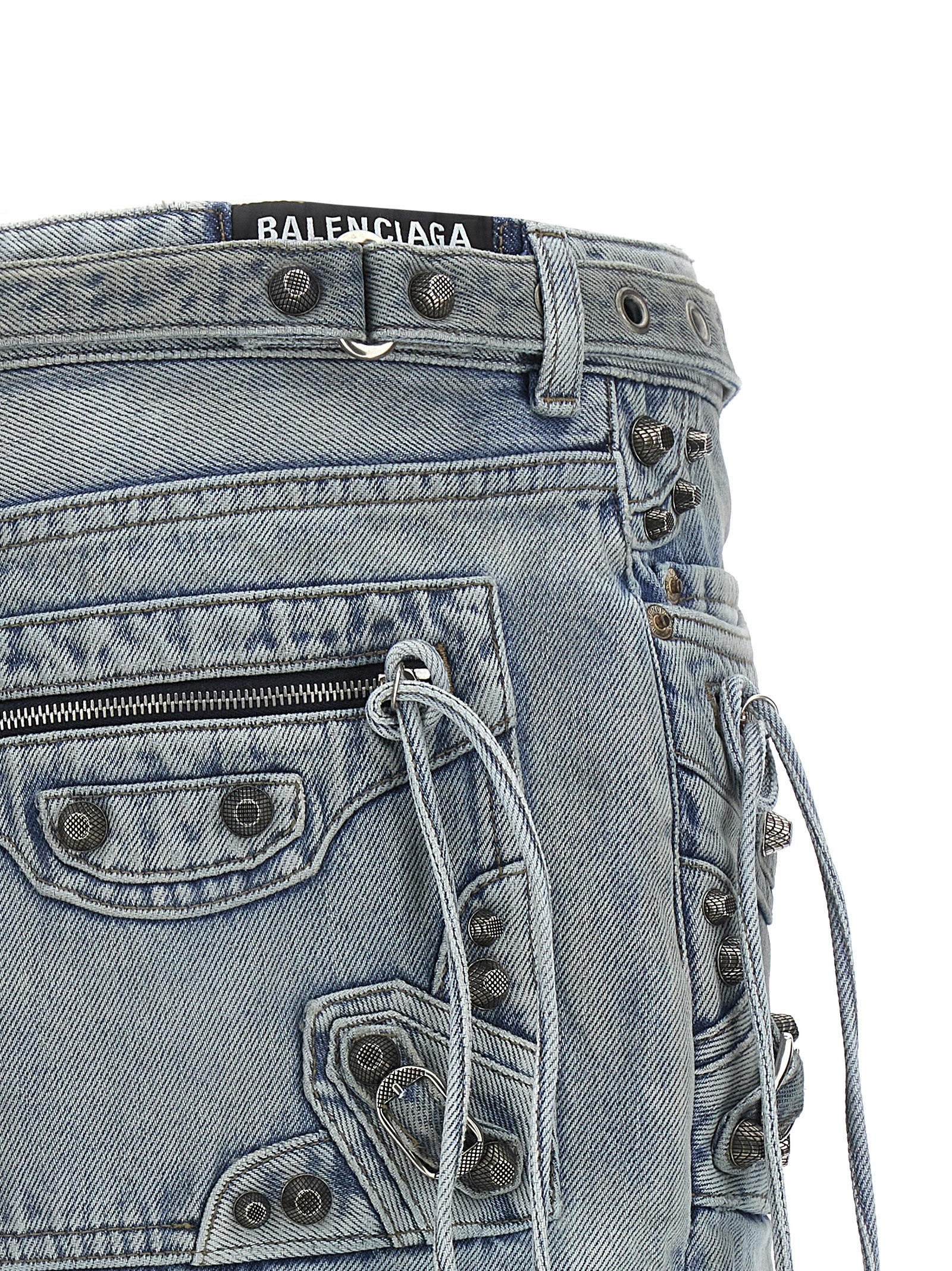 ‘Cagole Mini’ skirt in Japanese cotton denim with stud and buckle appliqué, mid-rise model with matching belt, zip and button closure, pockets, frayed hem.