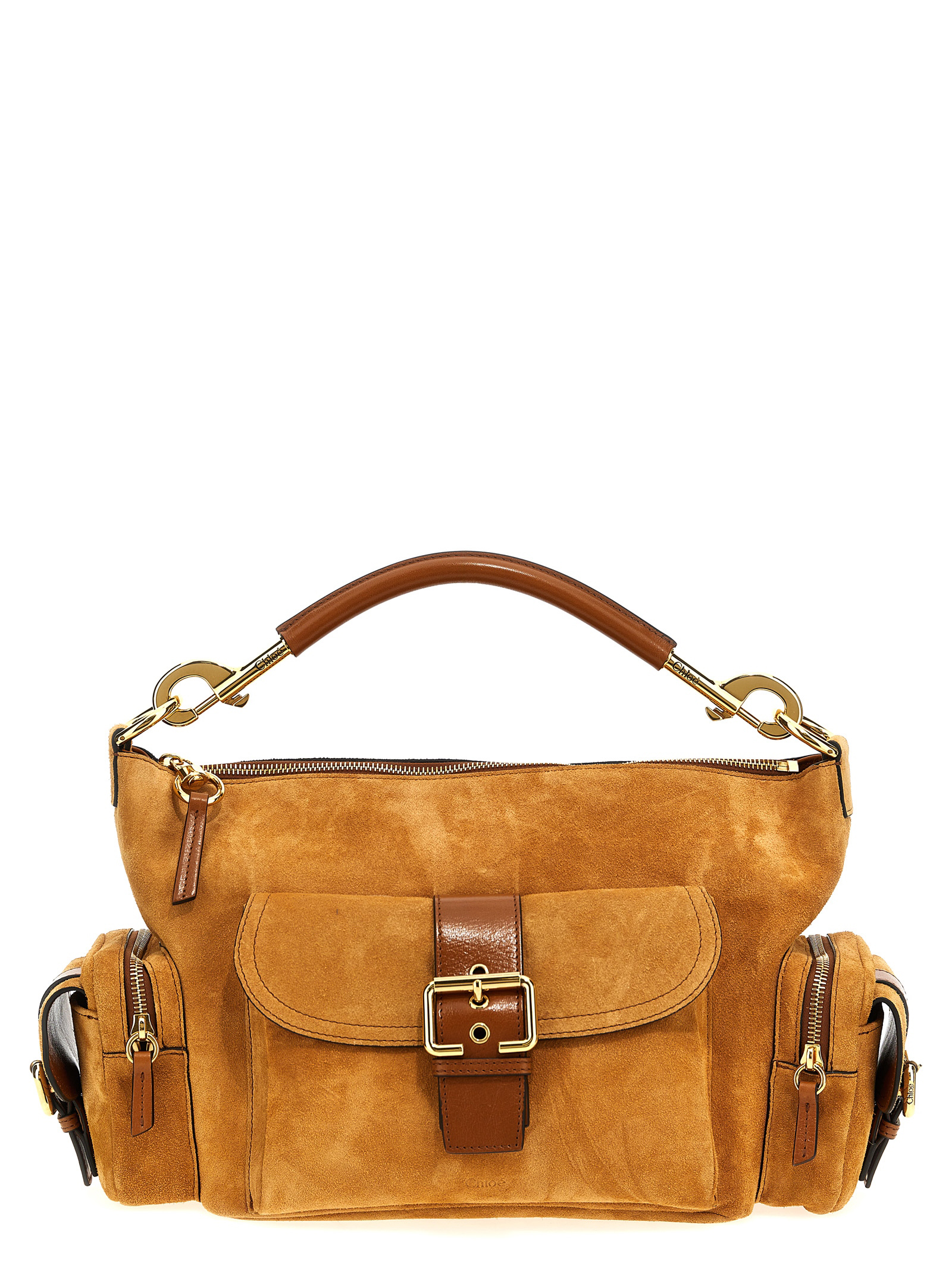 ‘Camera Bag’ suede shoulder bag with leather details, zip closure, removable handle, magnetic flap pockets and pockets with zip closure, metal details, removable shoulder strap.
