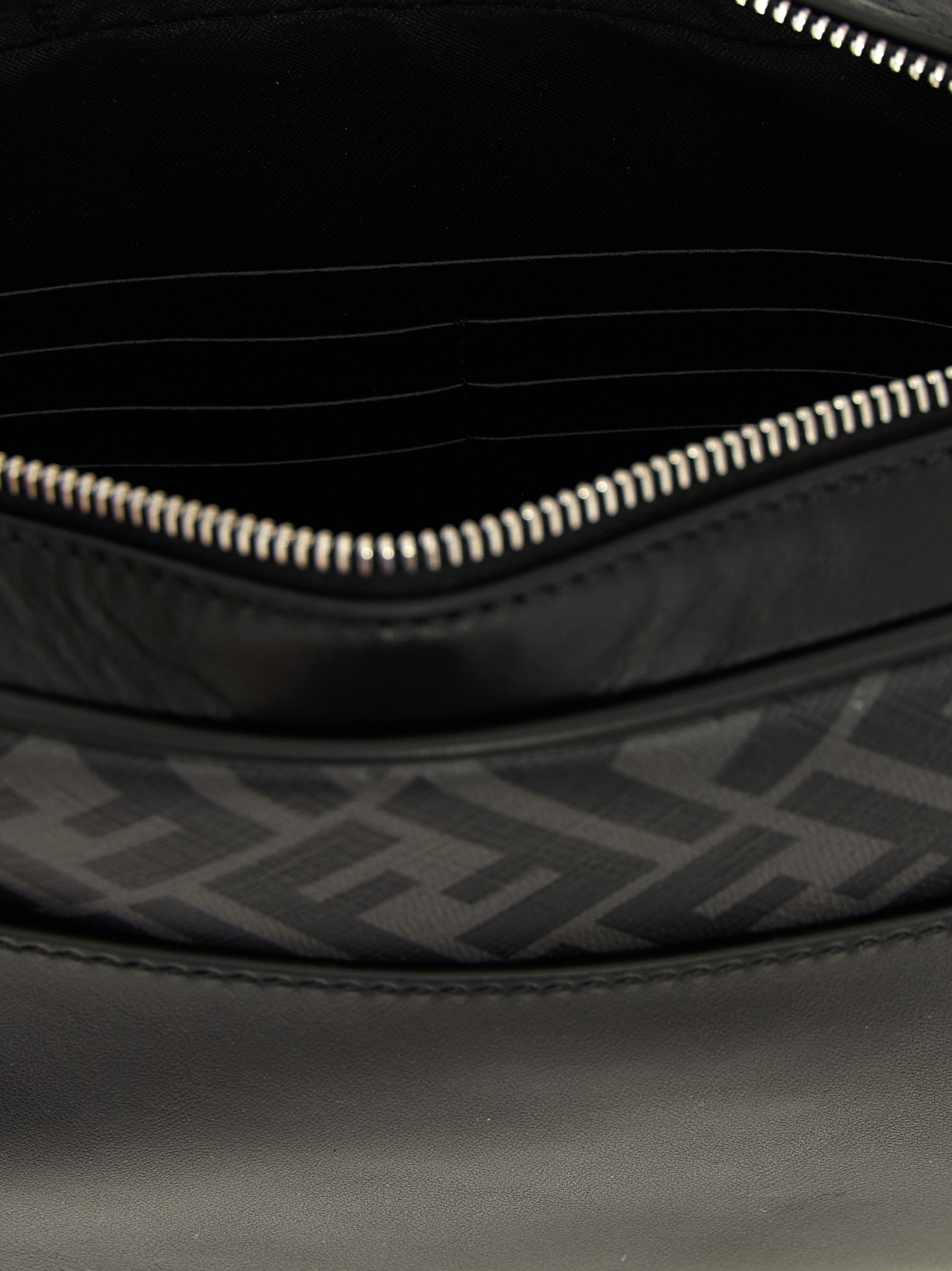 ‘Camera Case Squared FF’ shoulder bag in smooth leather and FF canvas, front metal logo, top zip closure, back pocket, technical fabric shoulder strap with adjustable and removable Fendi lettering.