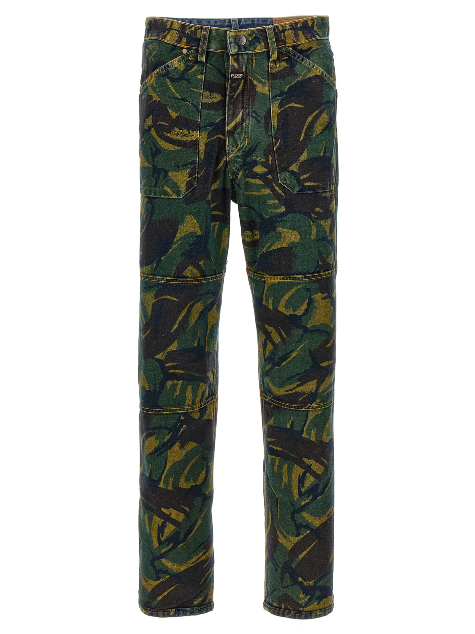 Reversible blue organic cotton jeans with camouflage print, contrast stitching, five pockets, paper logo tag, zip and button closure.