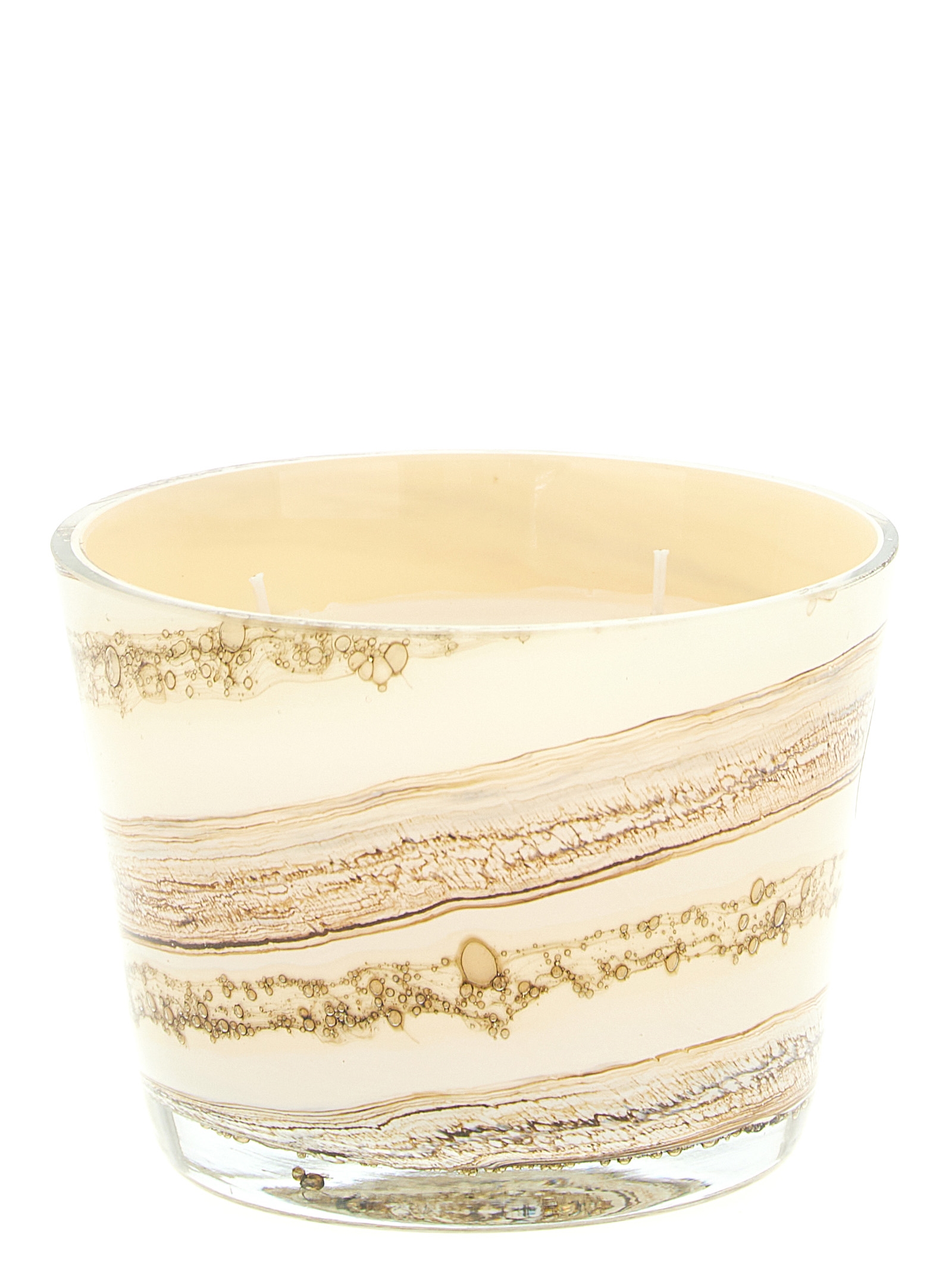 The hand-blown glass of Siloli candles has shades of beige and brown, with horizontal lines formed by small random organic spots. Each glass container is unique, as the sand color dissolves into the material with the breath of the craftsman.