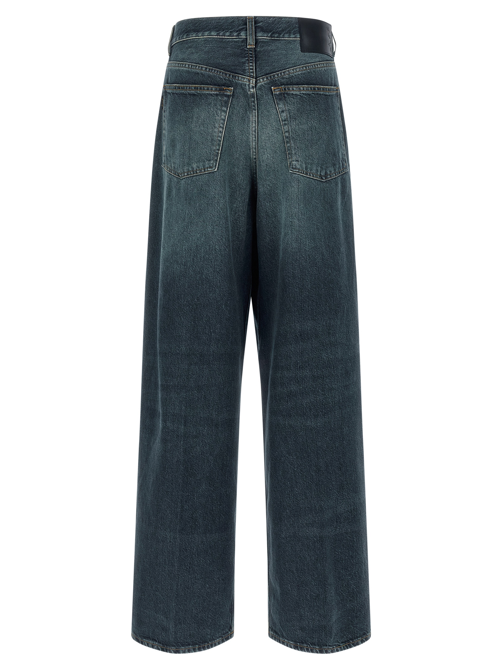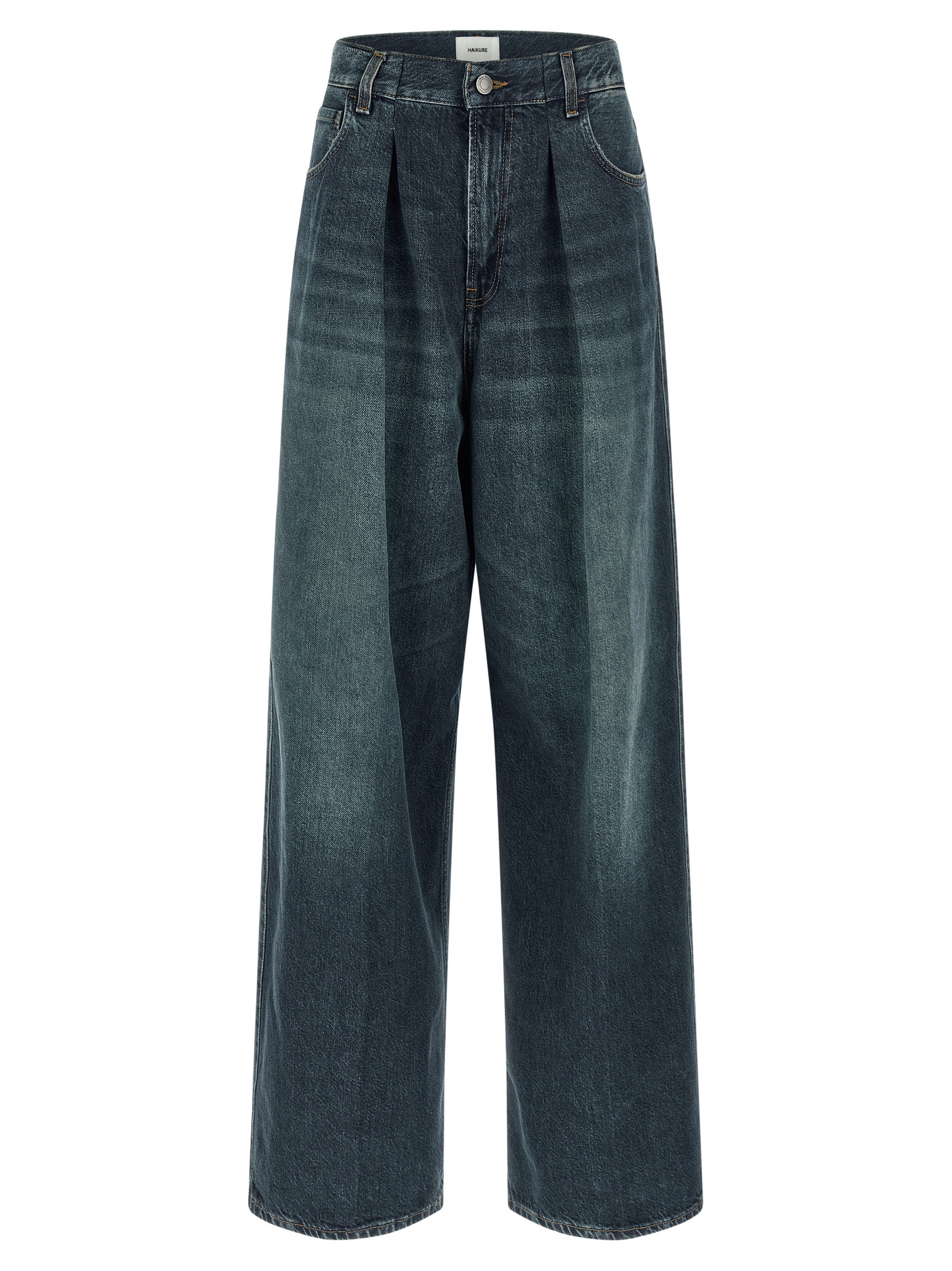 ‘Candy Intense Blue’ jeans in delavé cotton denim, front pin tucks, wide leg, zip and button closure, back logo tag