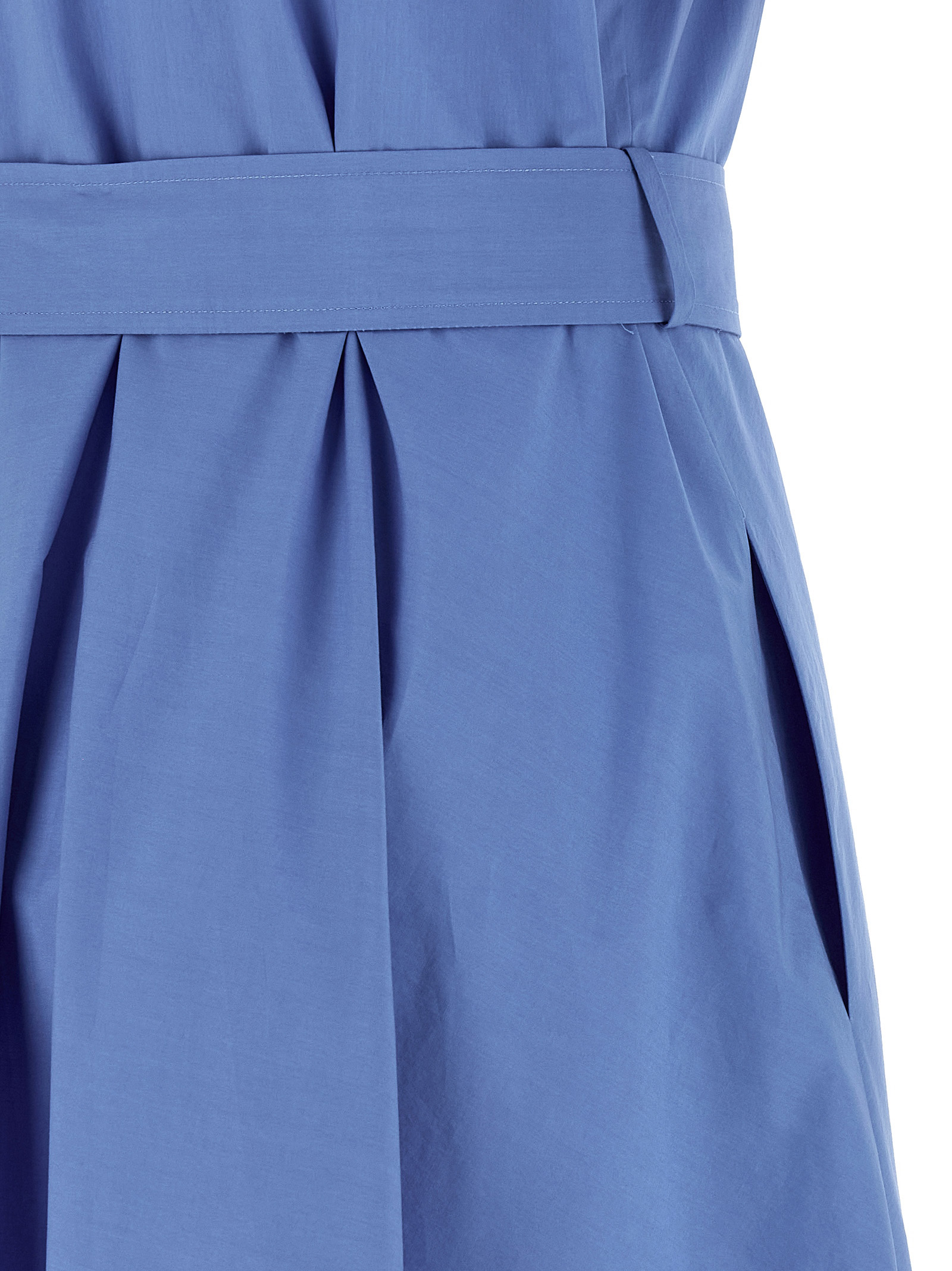‘Canyox26’ cotton poplin midi dress with pleated and front button closure, pointed collar, short sleeves, flared silhouette skirt, removable belt.
