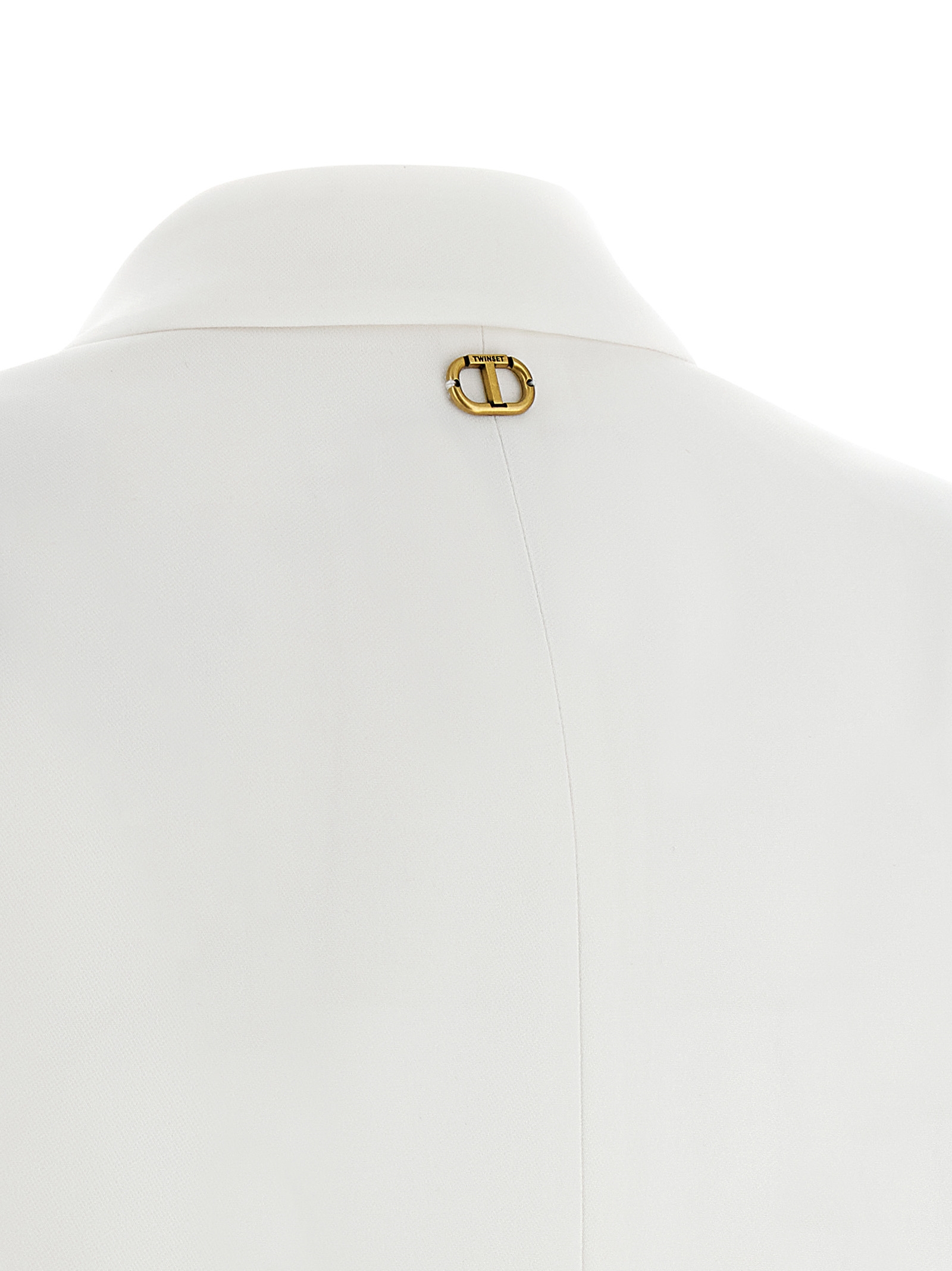 Single-breasted crêpe blazer with front hook closure, mirror lapels, flap pockets, wide open sleeves with cape effect, and metal Oval T logo plaque on the back.