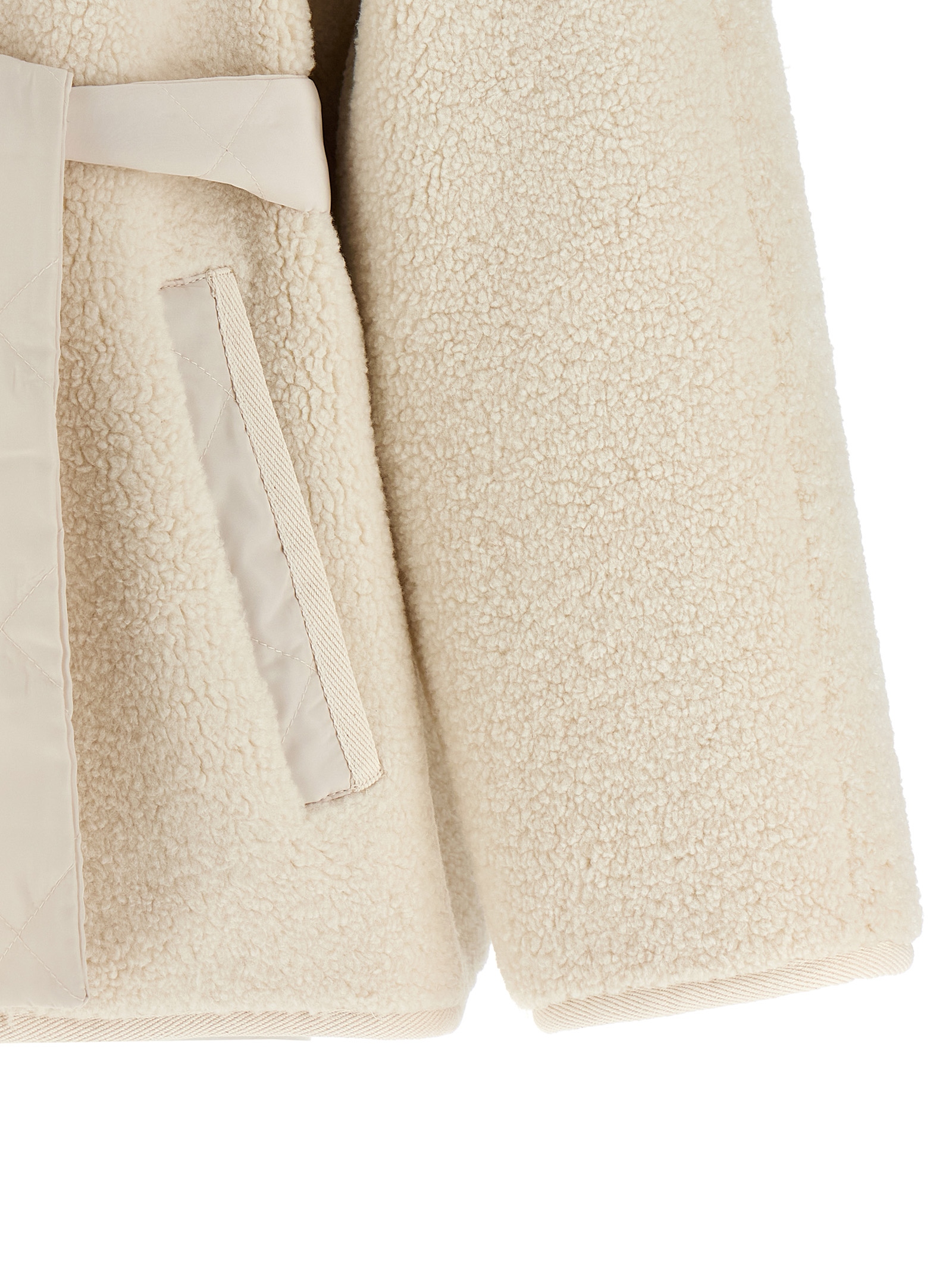 Capperi’ sheepskin jacket with quilted nylon insert on the front, suede effect fabric lining, hood, high neck, front snap button closure, pockets, long sleeves, removable belt.