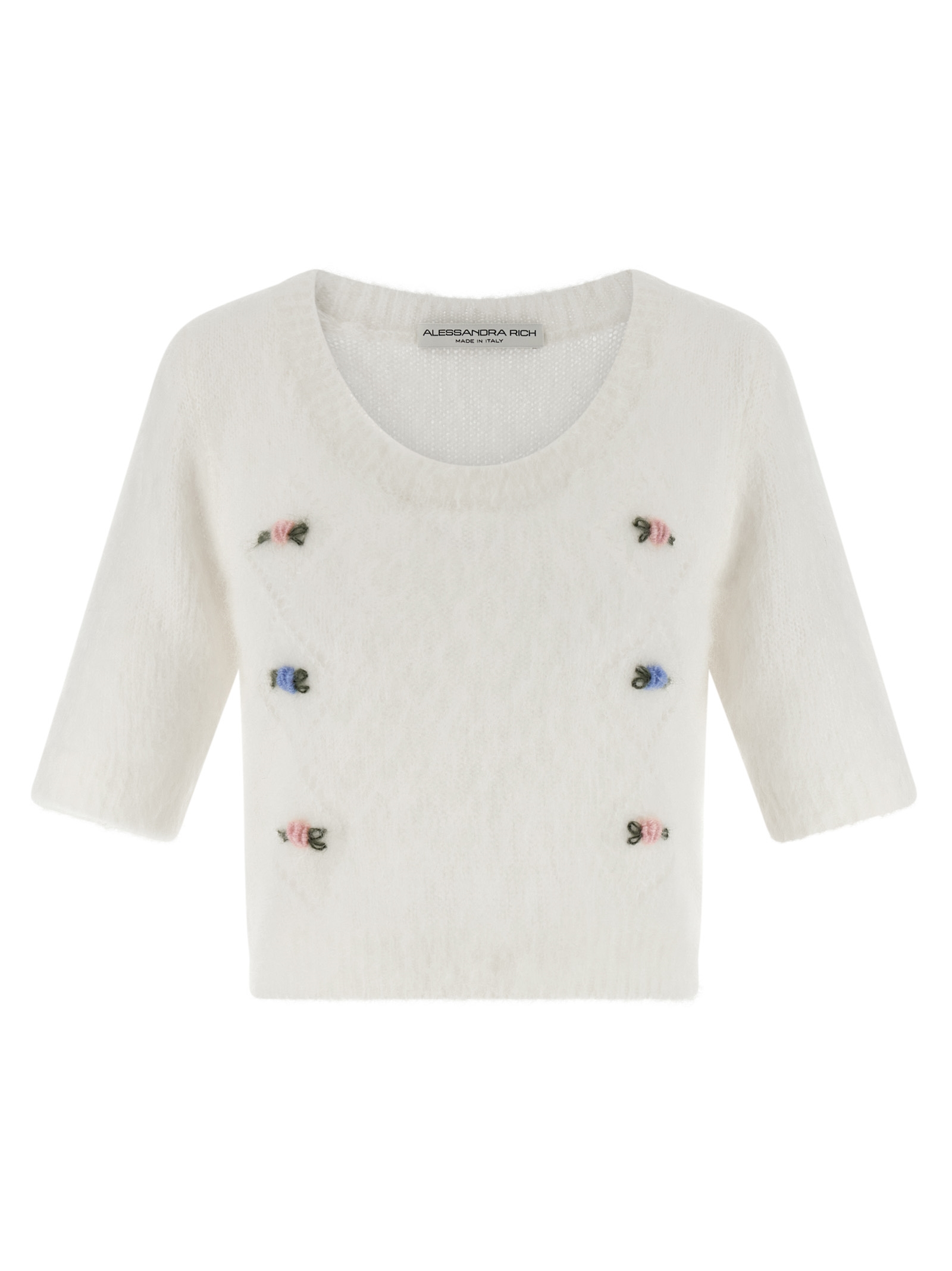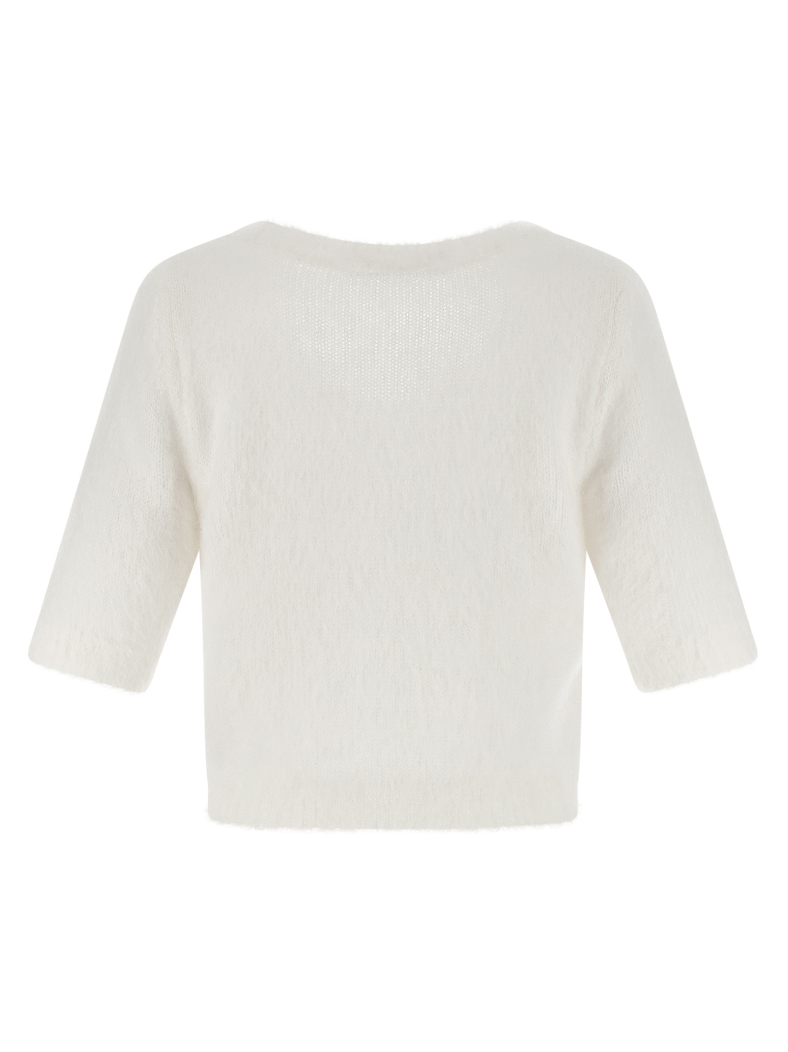 ‘Carded Mohair’ cardigan in alpaca and wool blend with embroidery and cut-out details, crop model, wide round neckline, short sleeves.
