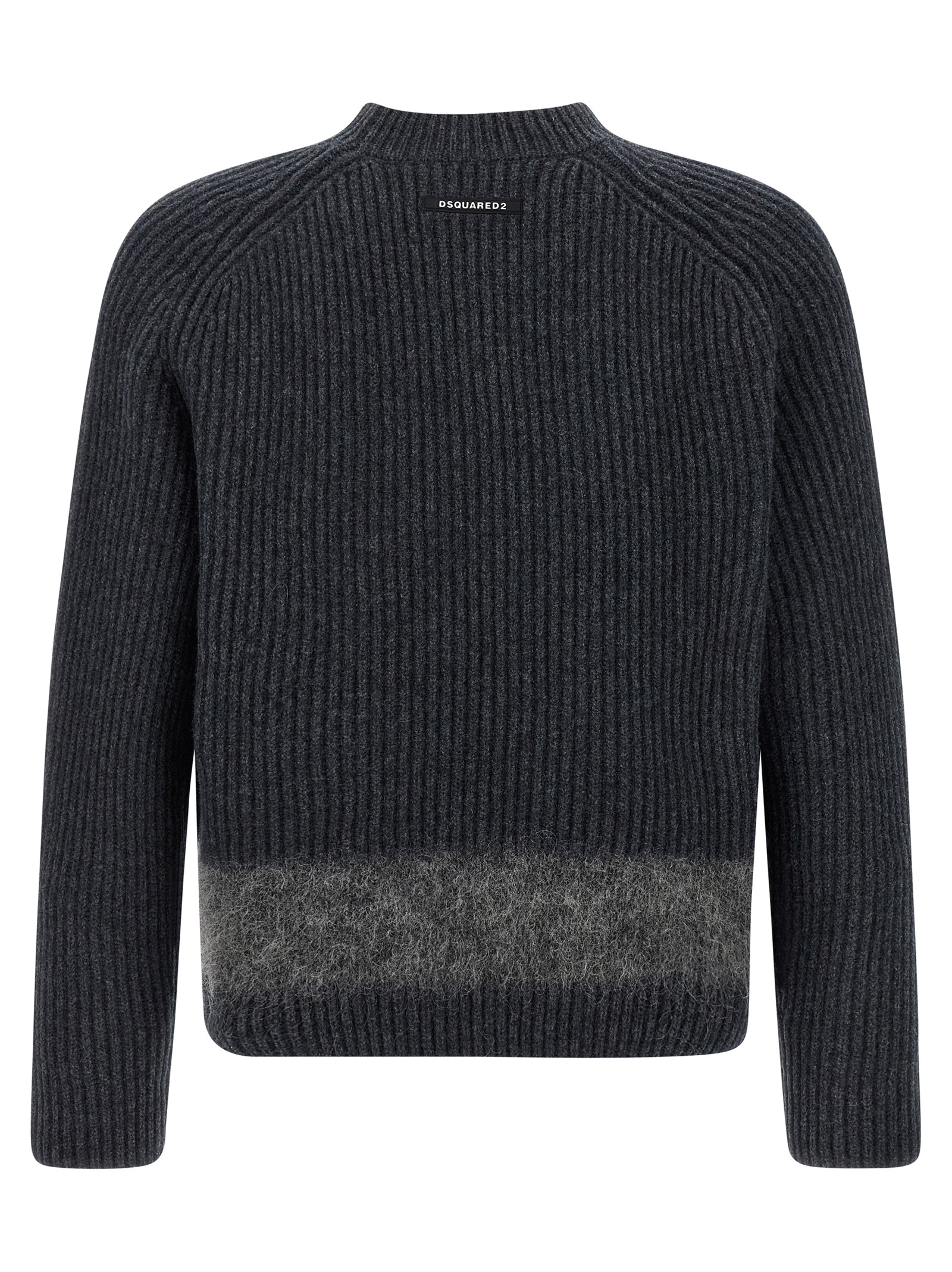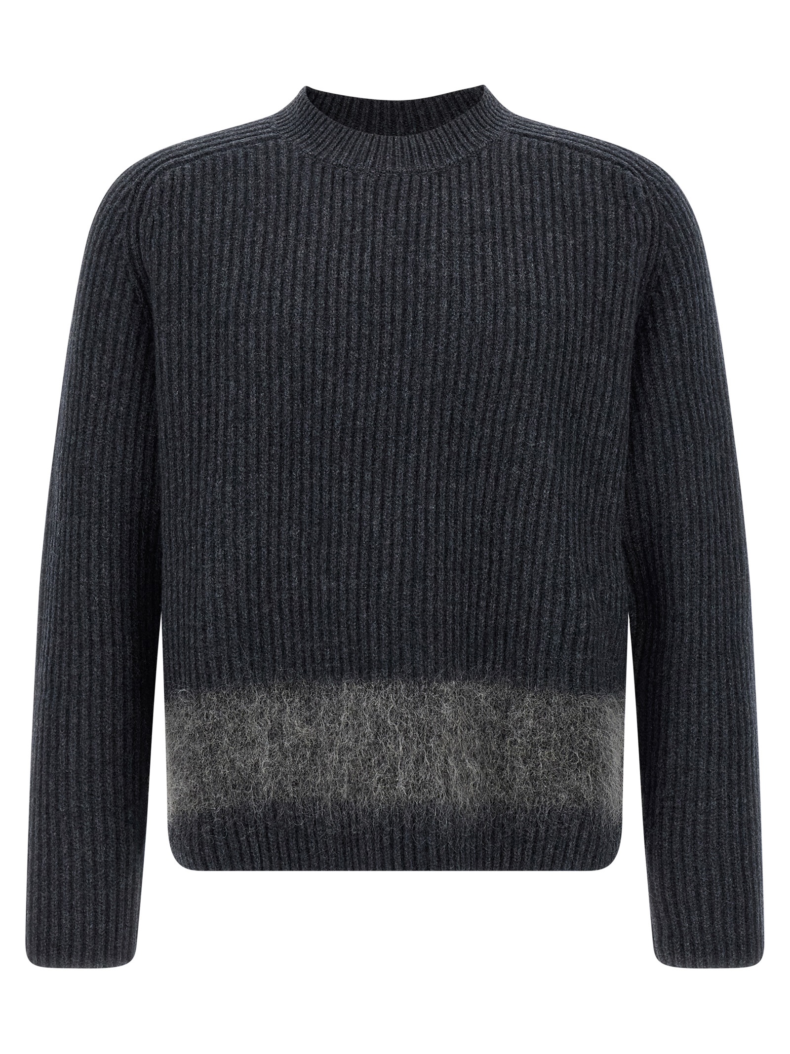 Ribbed knit wool sweater with tone-on-tone carded wool insert, back silicone logo patch, crew neck, long sleeves.