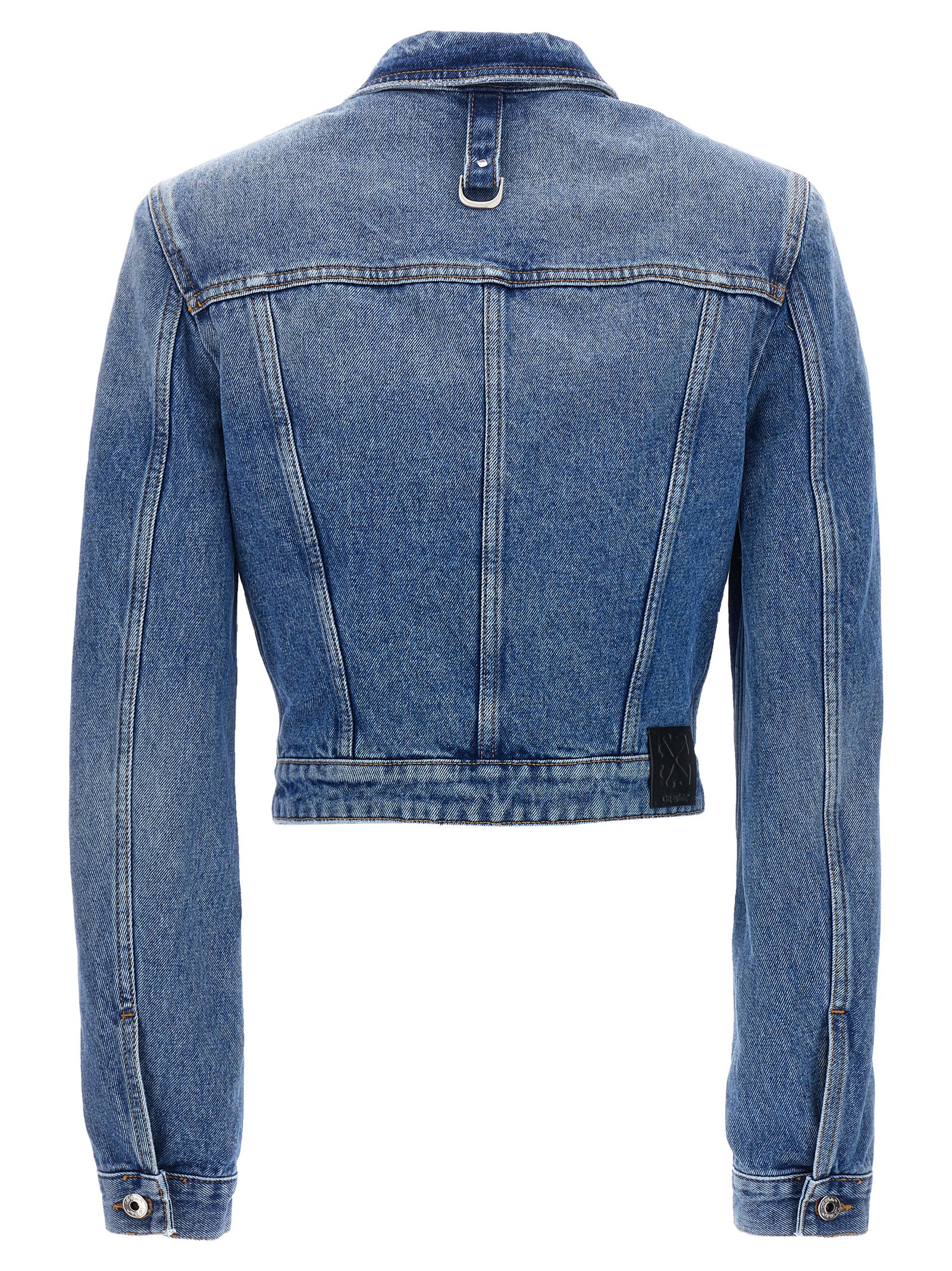 Cropped ‘Cargo Crop’ cotton denim jacket with chest strap detail, button closure and long cuffed sleeves.
