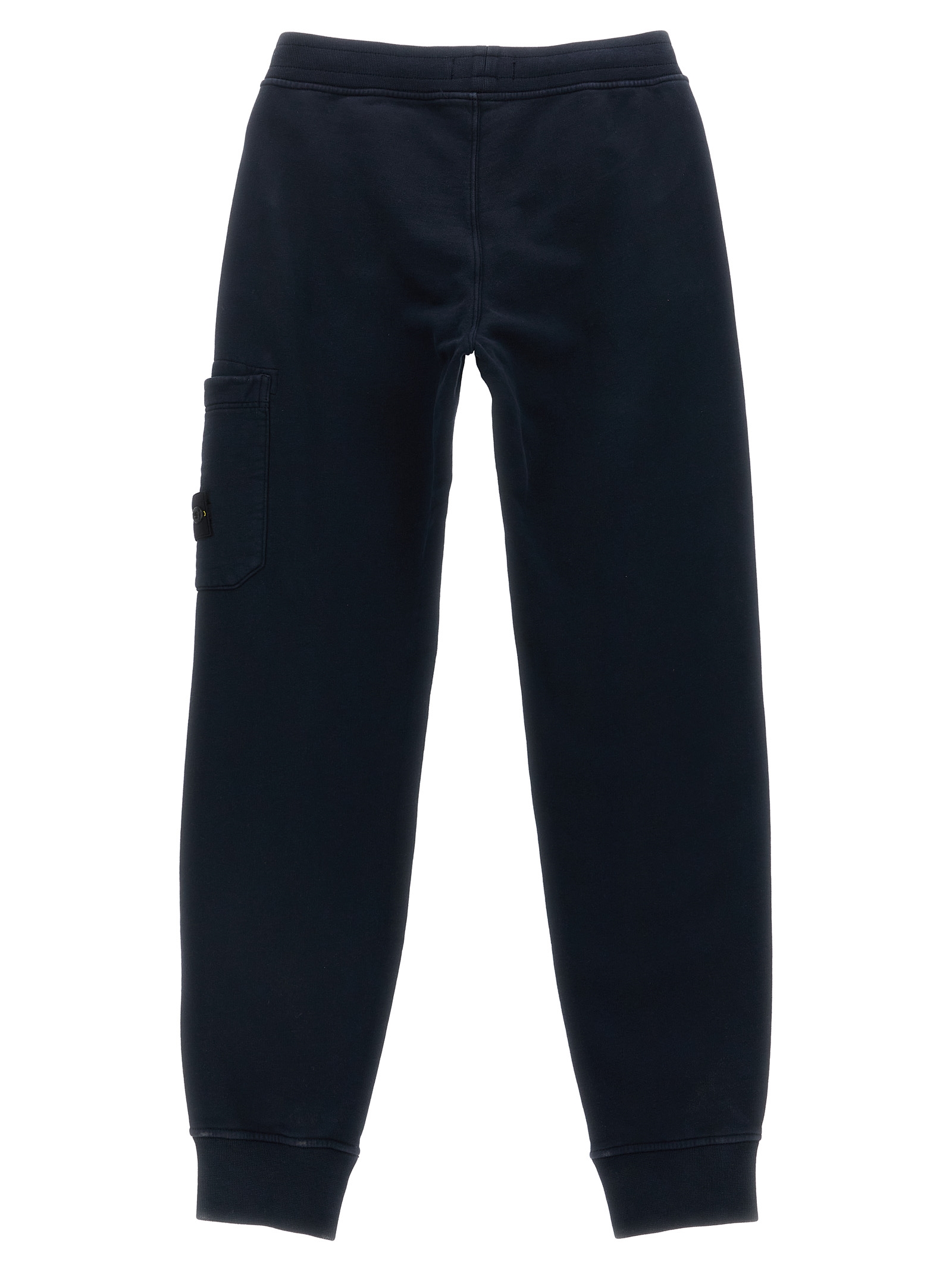 Brushed cotton joggers with cargo pocket and logo badge, drawstring elastic waistband, pockets, ankle cuffs.