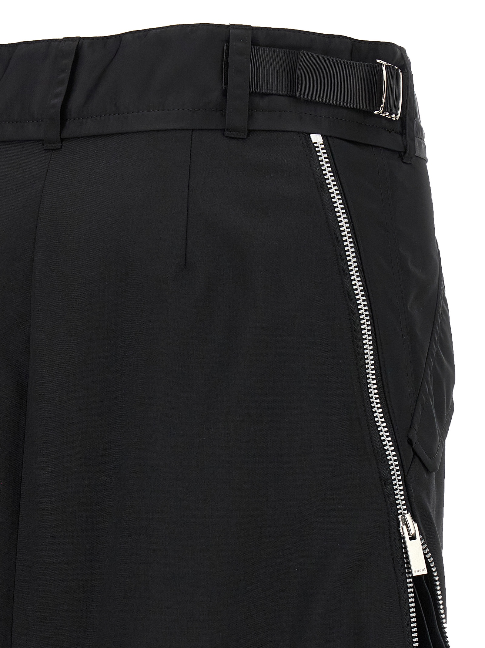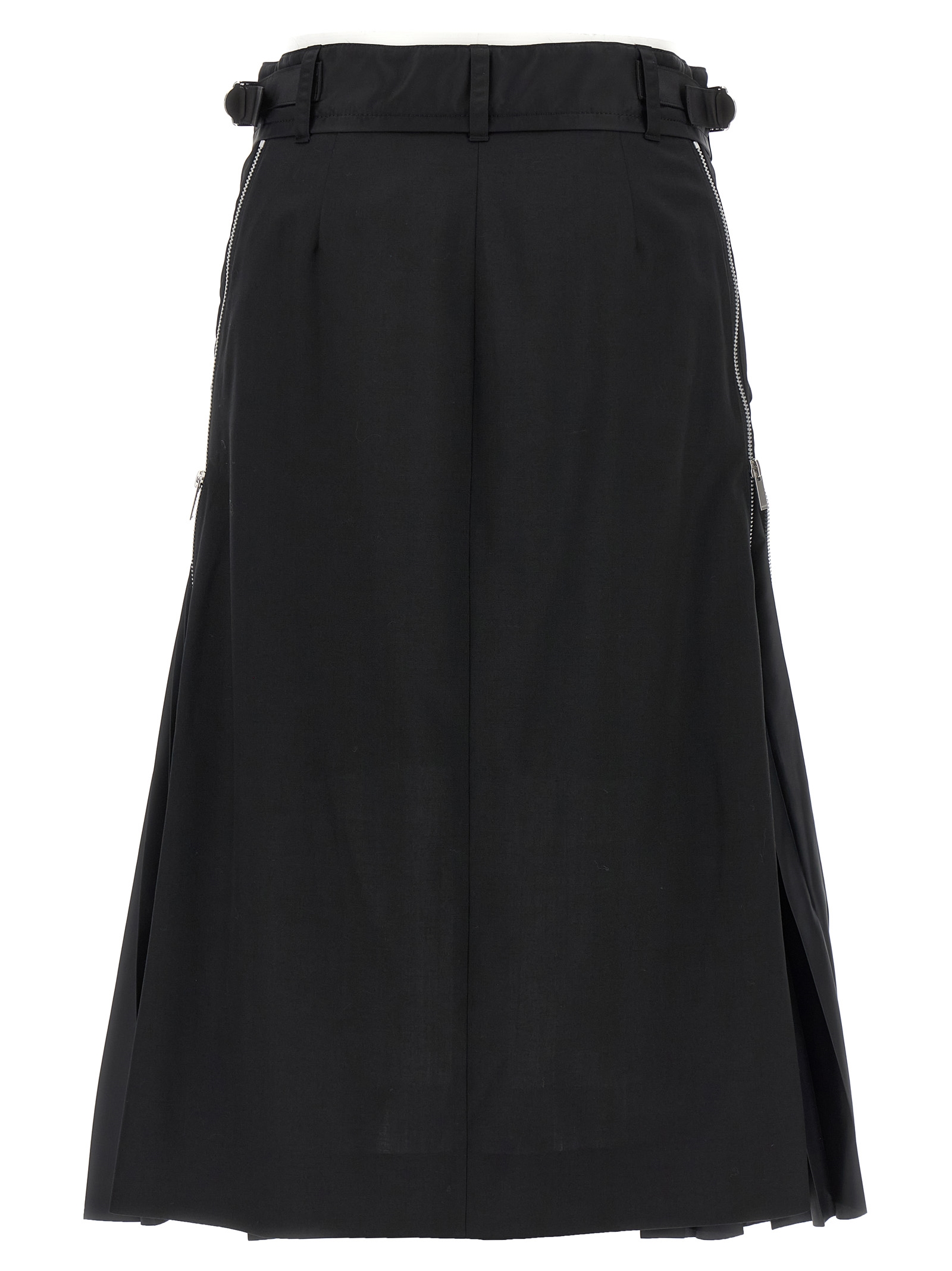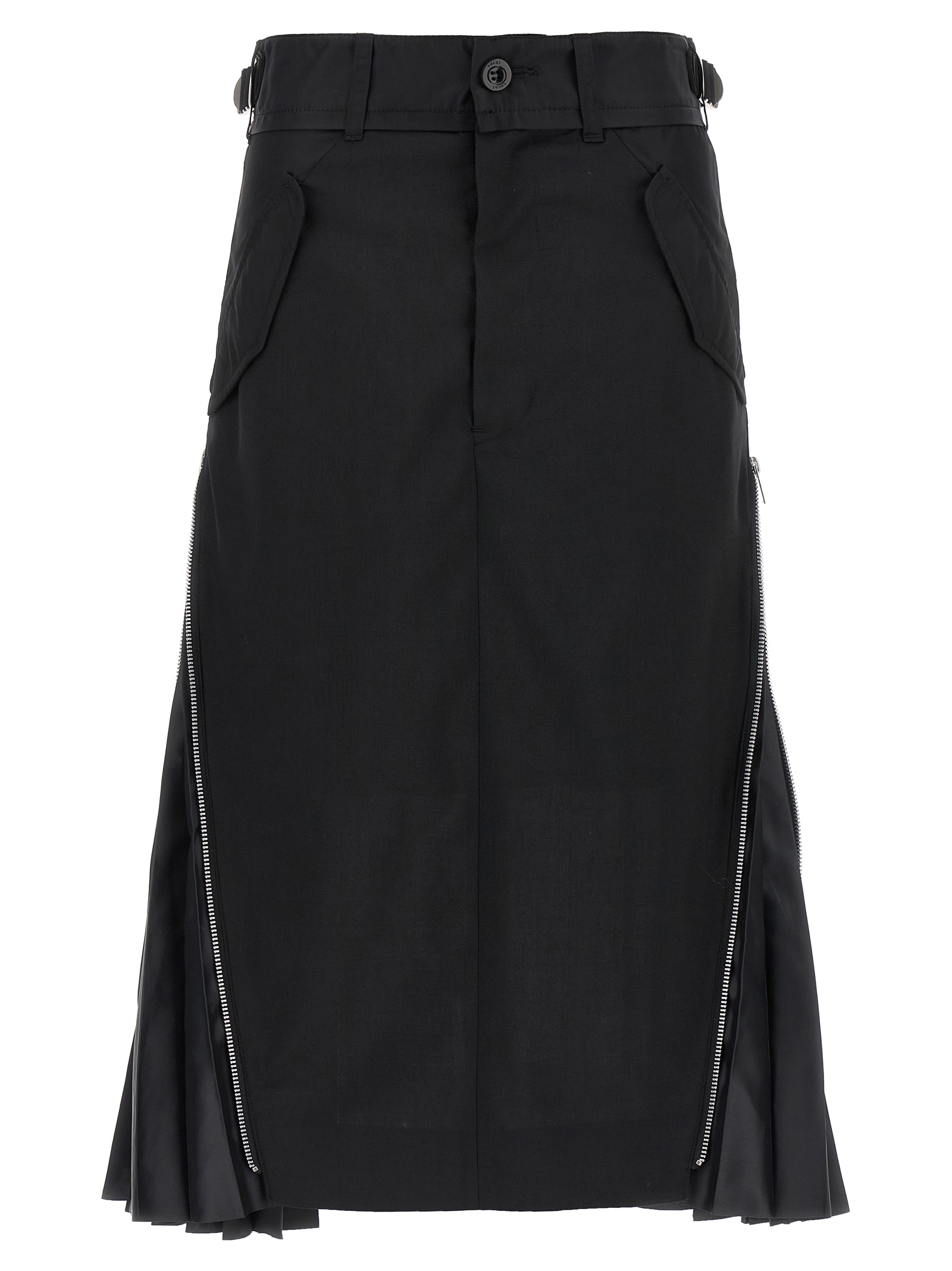 Midi wool ‘Cargo Mix’ skirt, side inserts in pleated nylon fabric with zip closure, pockets, front button and zip closure.