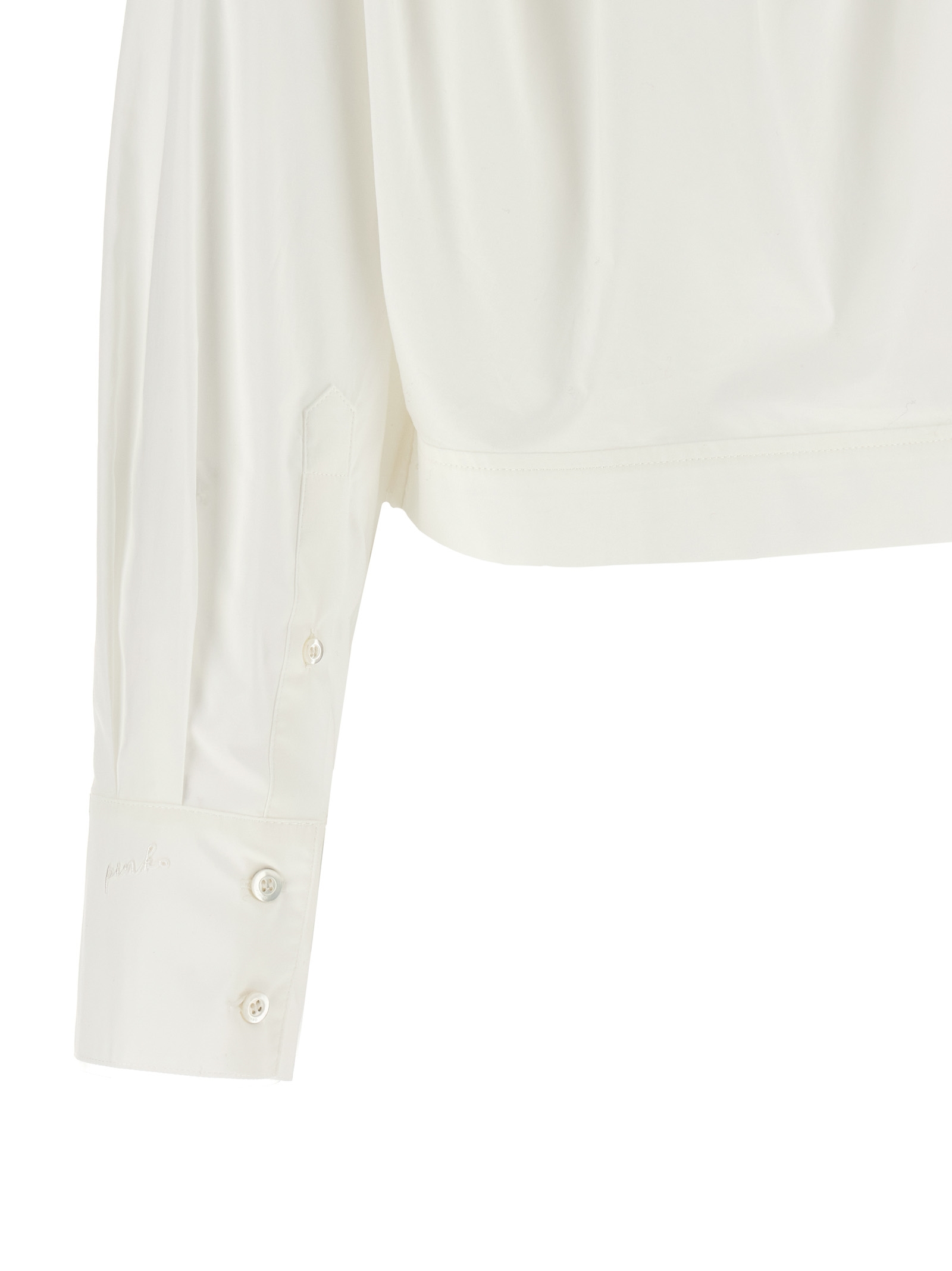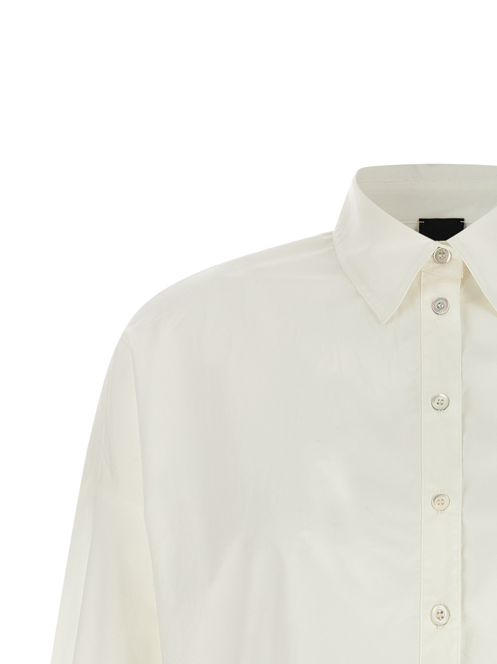 ‘Carne’ crop shirt in cotton poplin with back curls, pointed collar, front mother-of-pearl button closure, long cuffed sleeves with tone-on-tone embroidered logo and dropped shoulders.