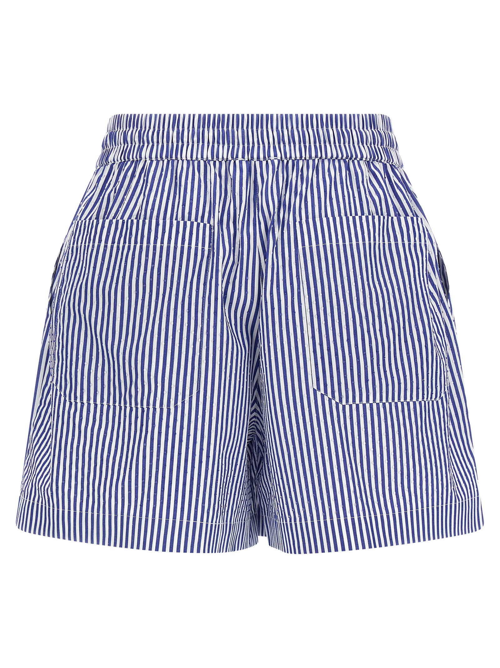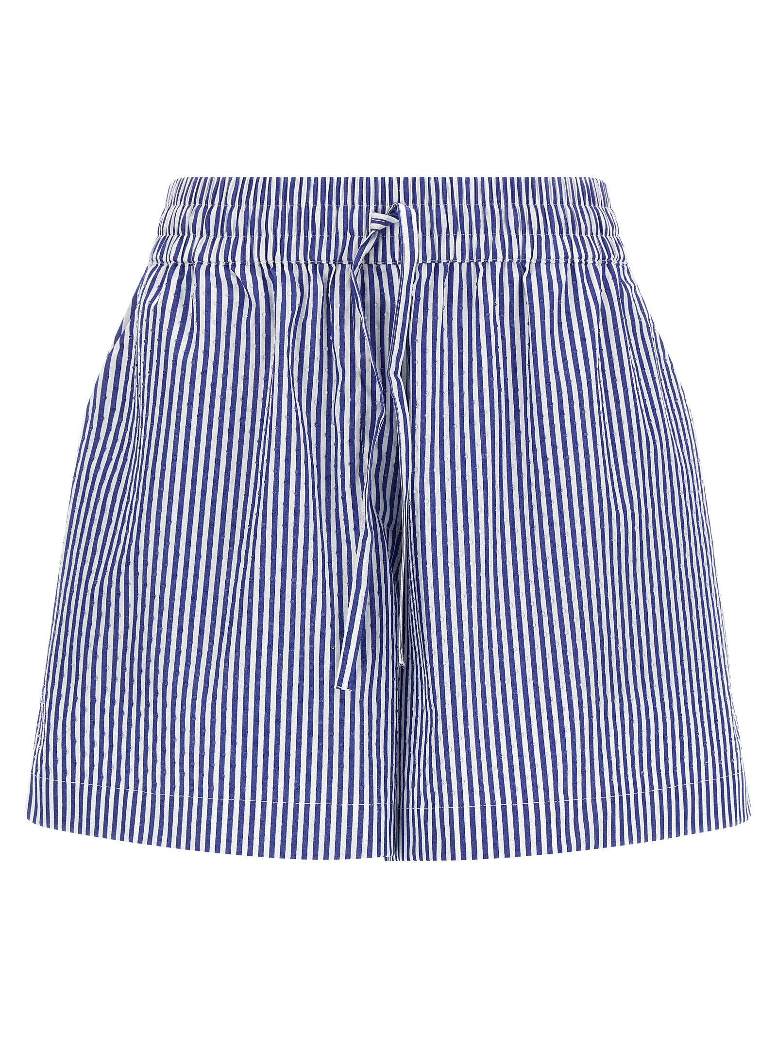 ‘Cashine’ striped cotton poplin shorts with all-over rhinestones, wide leg, drawstring elastic waistband, pockets.