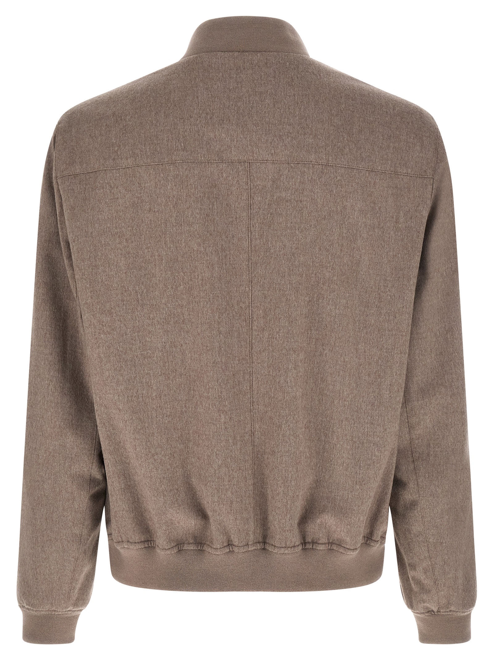 Light cashmere flannel bomber jacket with tone-on-tone micro ribbed stretch knit details, high neck, front zip closure, pockets, long cuffed sleeves, unlined.