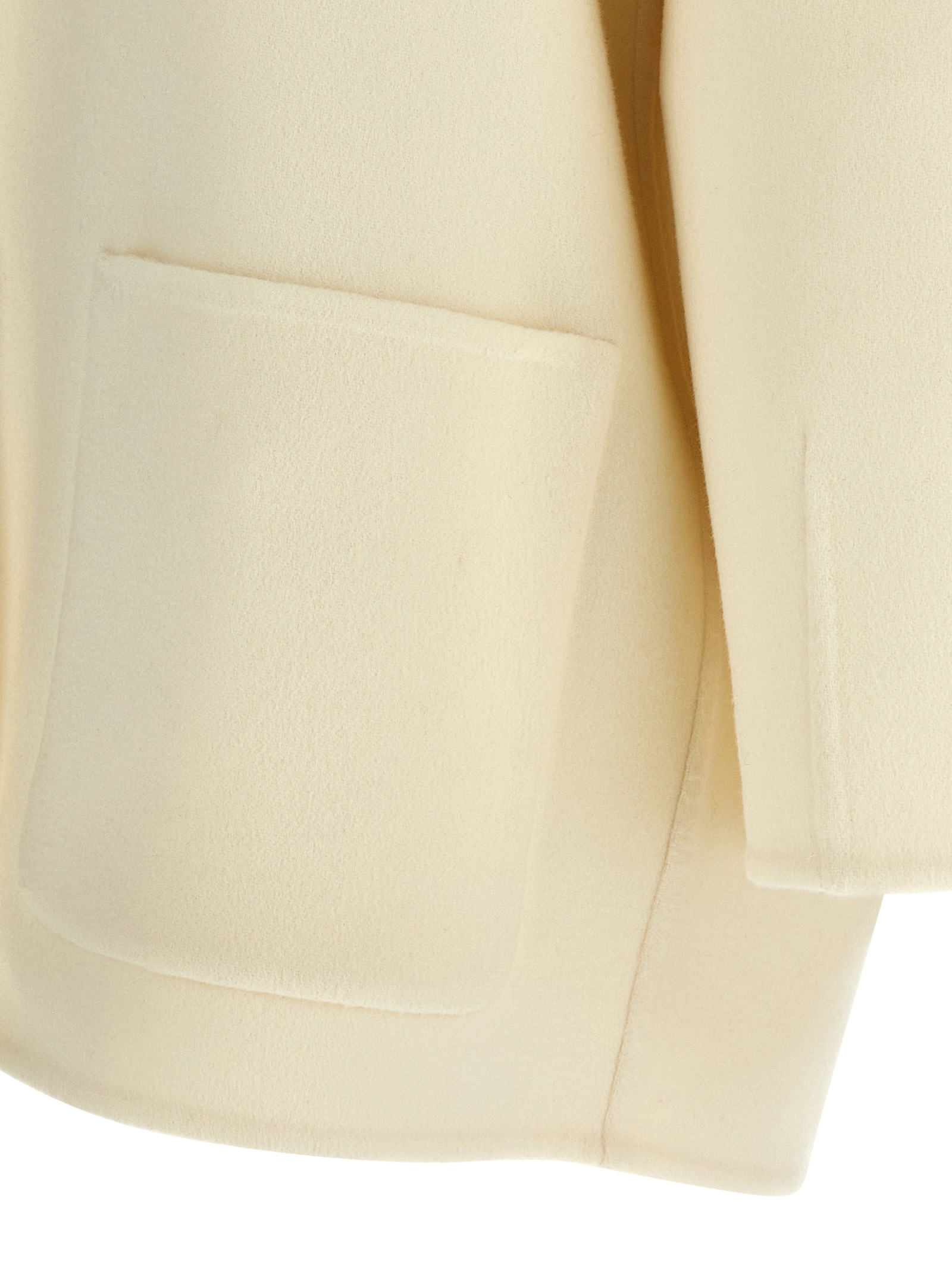 Unlined, unlined cashmere coat with single-breasted unstructured style with front snap button closure, lapel collar with jewel detail at the back, pockets, long sleeves with dropped shoulder, drawstring at the back waist.