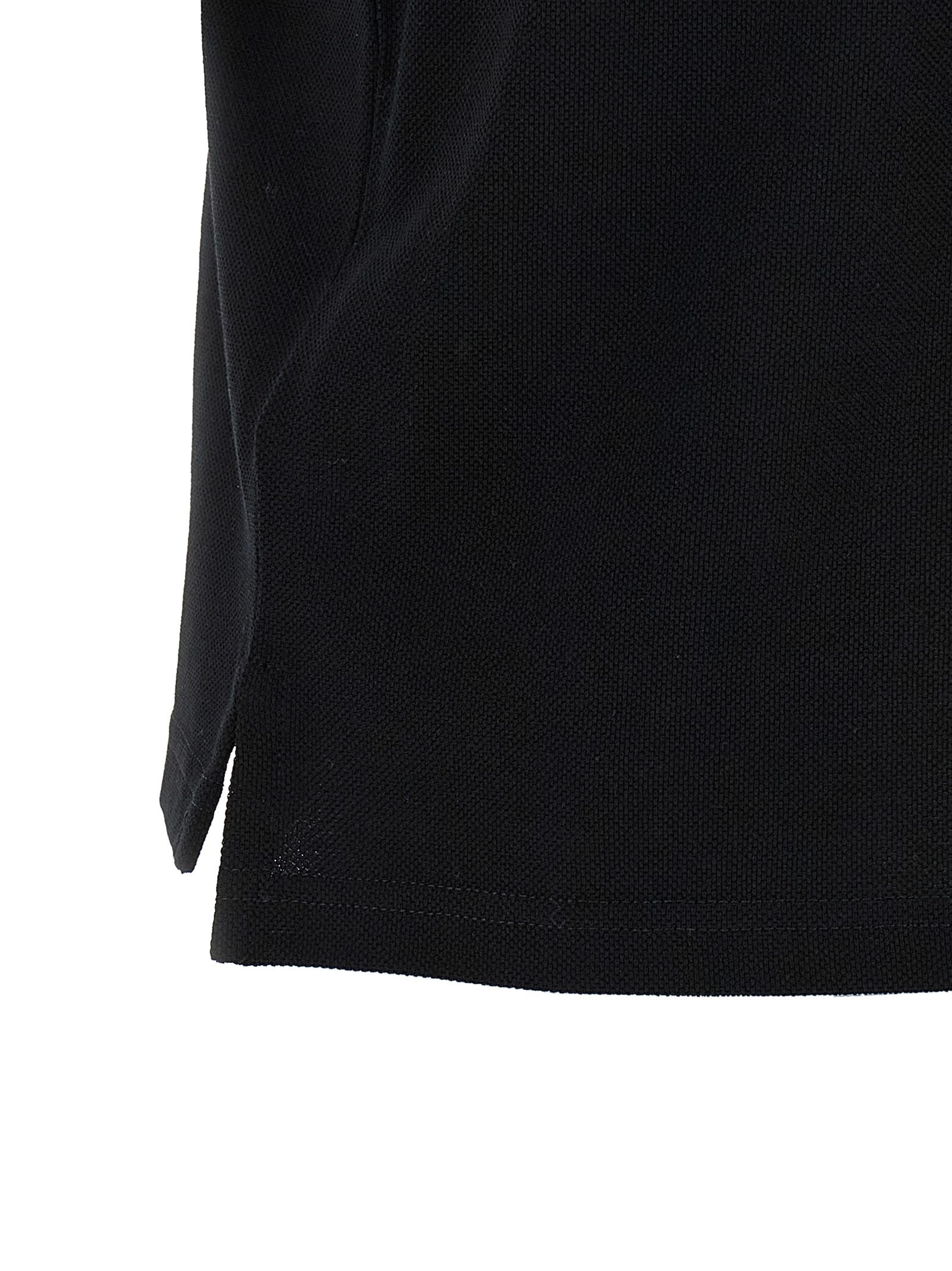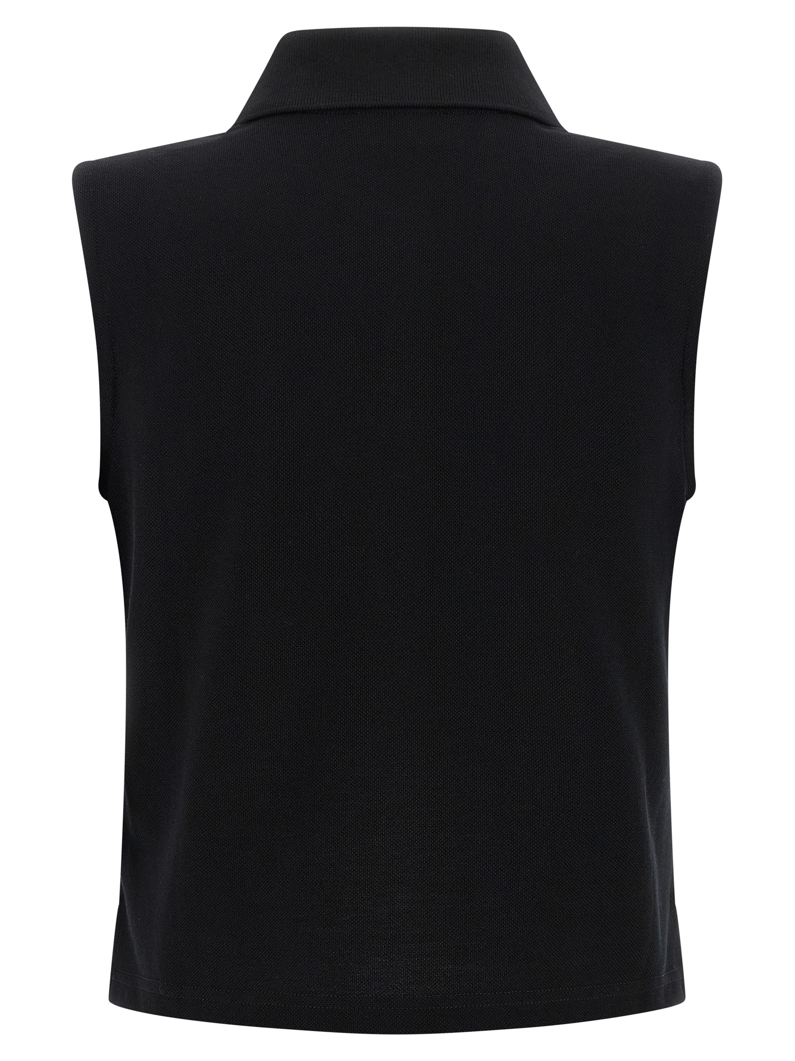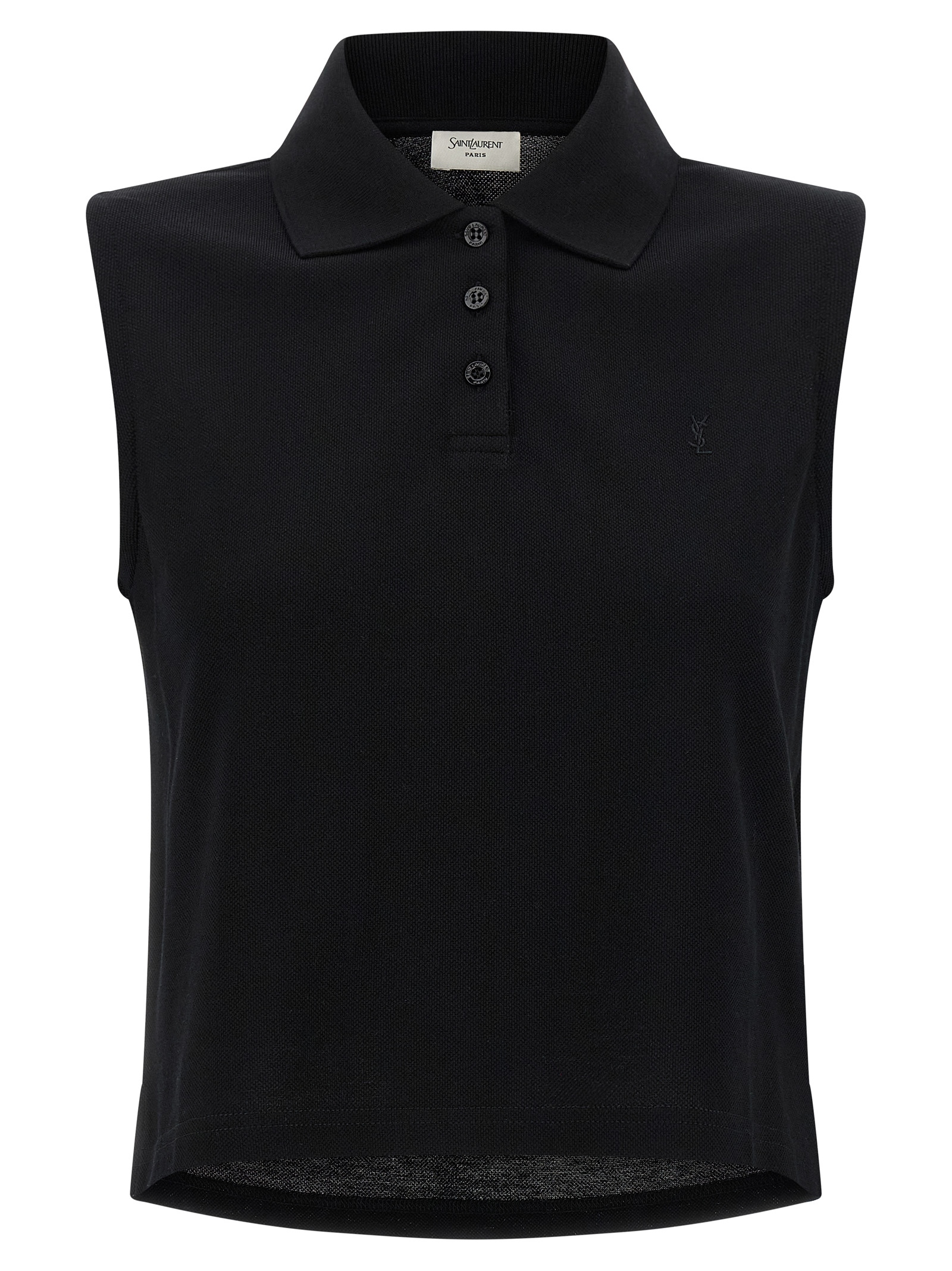 Polo shirt in piqué cotton with tone Cassandre-on-tone embroidered logo on the front, slightly cropped model, collar and buttons, sleeveless, side slits, and asymmetrical hem.