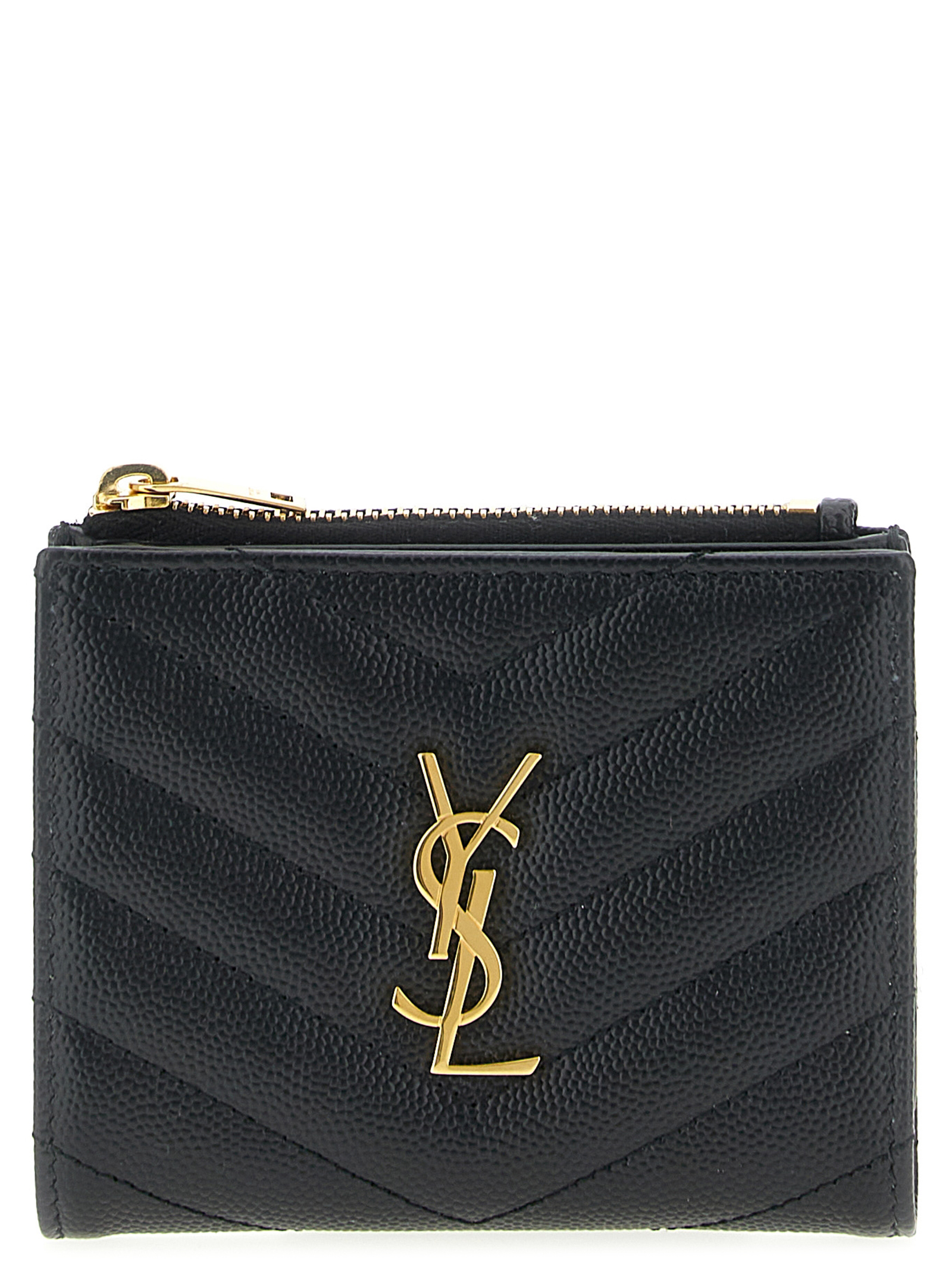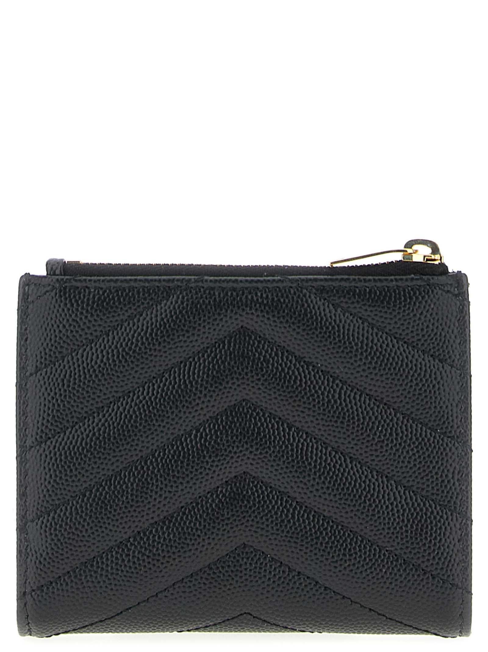 Quilted grain de poudre embossed leather wallet, bi-fold style, front metal ‘Cassandre’ logo, flap closure with snap button, zip pocket.