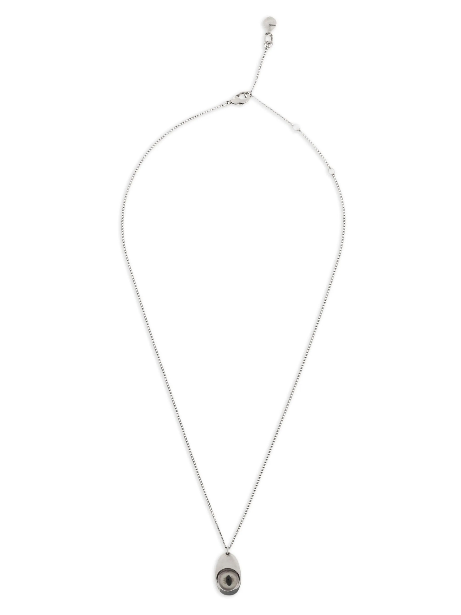 Cat Eye’ necklace in silver-plated brass with adjustable cat’s eye glass pendant and snap hook closure.