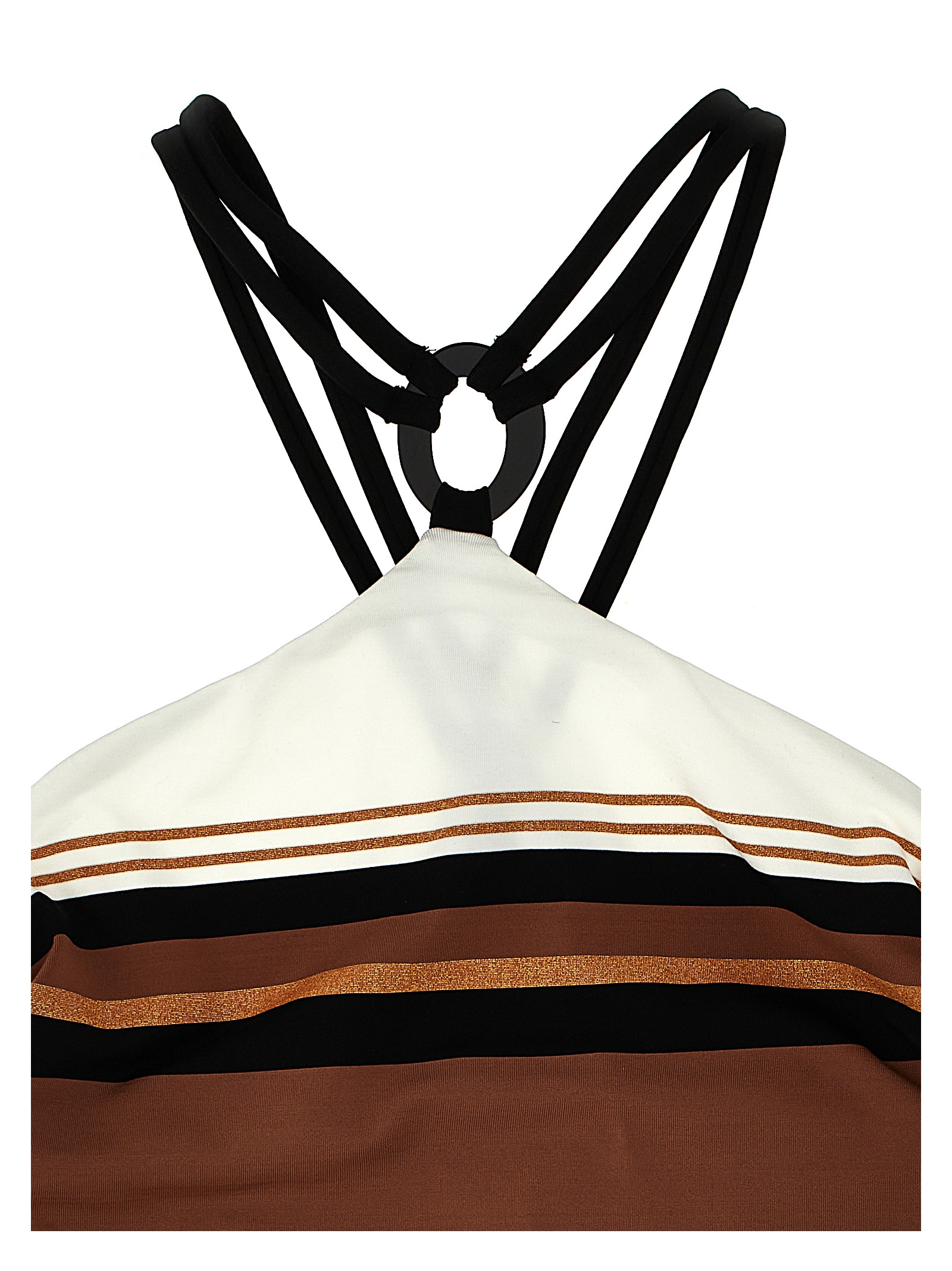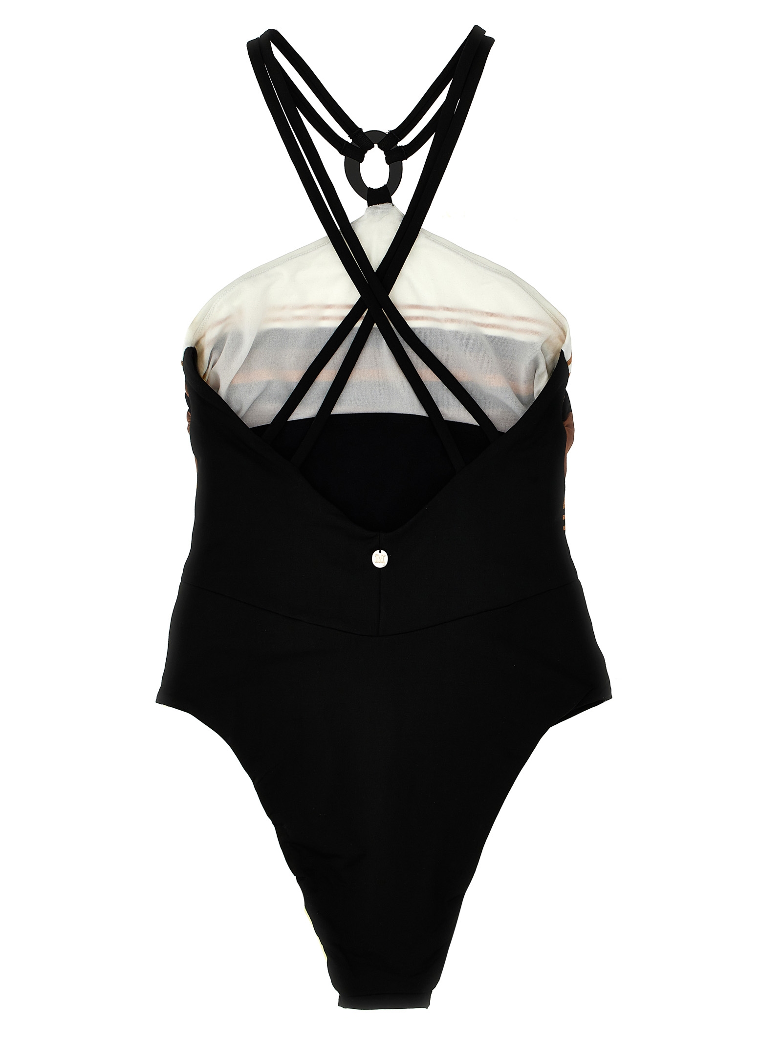 ‘Cathy’ one-piece swimsuit in stretch fabric with striped detail, halter neck tie.