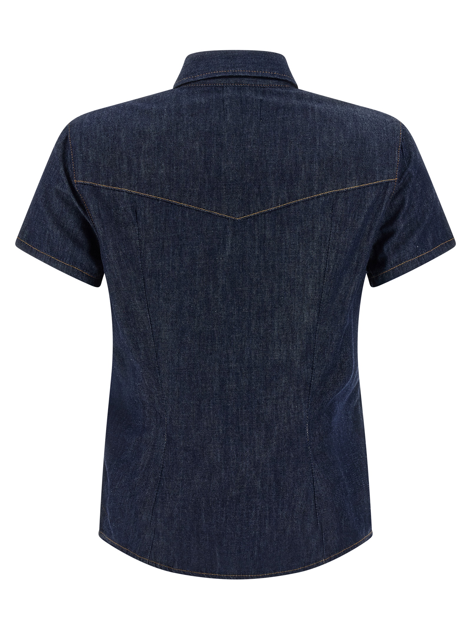 Classic ‘Cavazos’ cotton denim shirt with collar, front closure with snap buttons, front flap pocket, legegrmente flared at the waist, short sleeves.