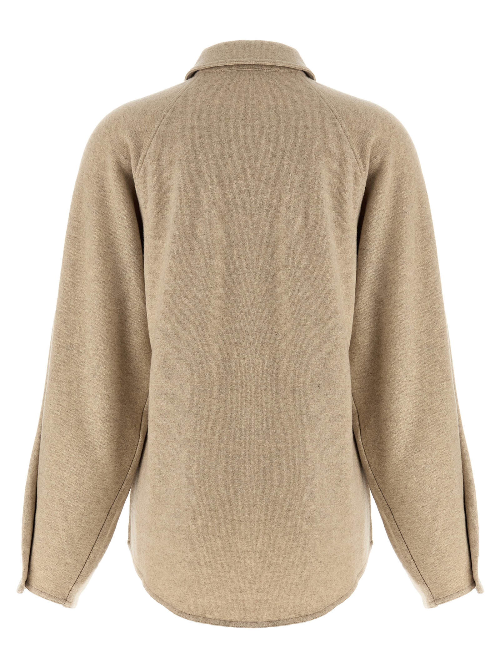 ‘Ceci’ mélange stretch cashmere flannel overshirt, tone-on-tone logo embroidery and front button closure, long raglan sleeves with button and counter pleat on the hem, and asymmetric hem.