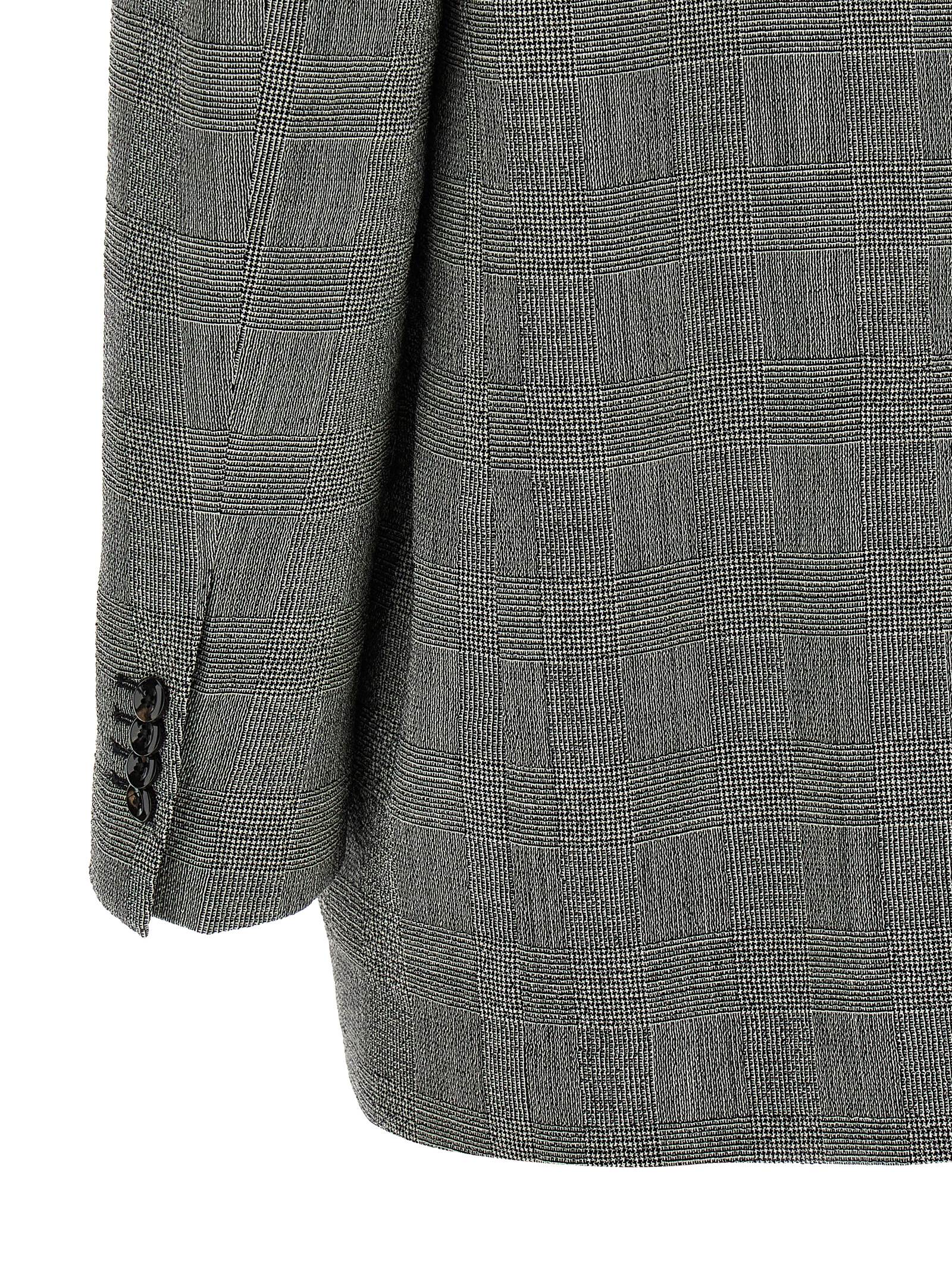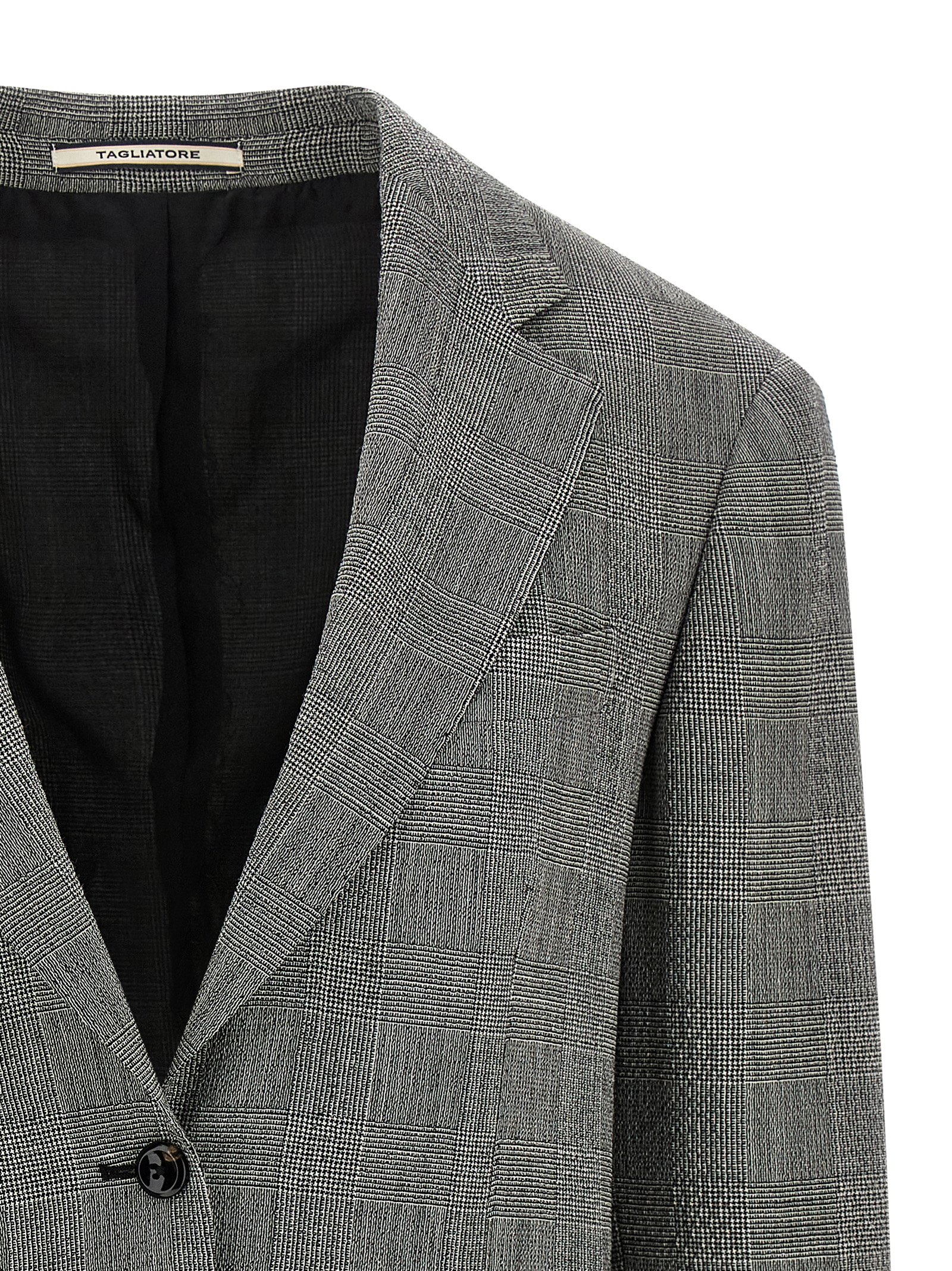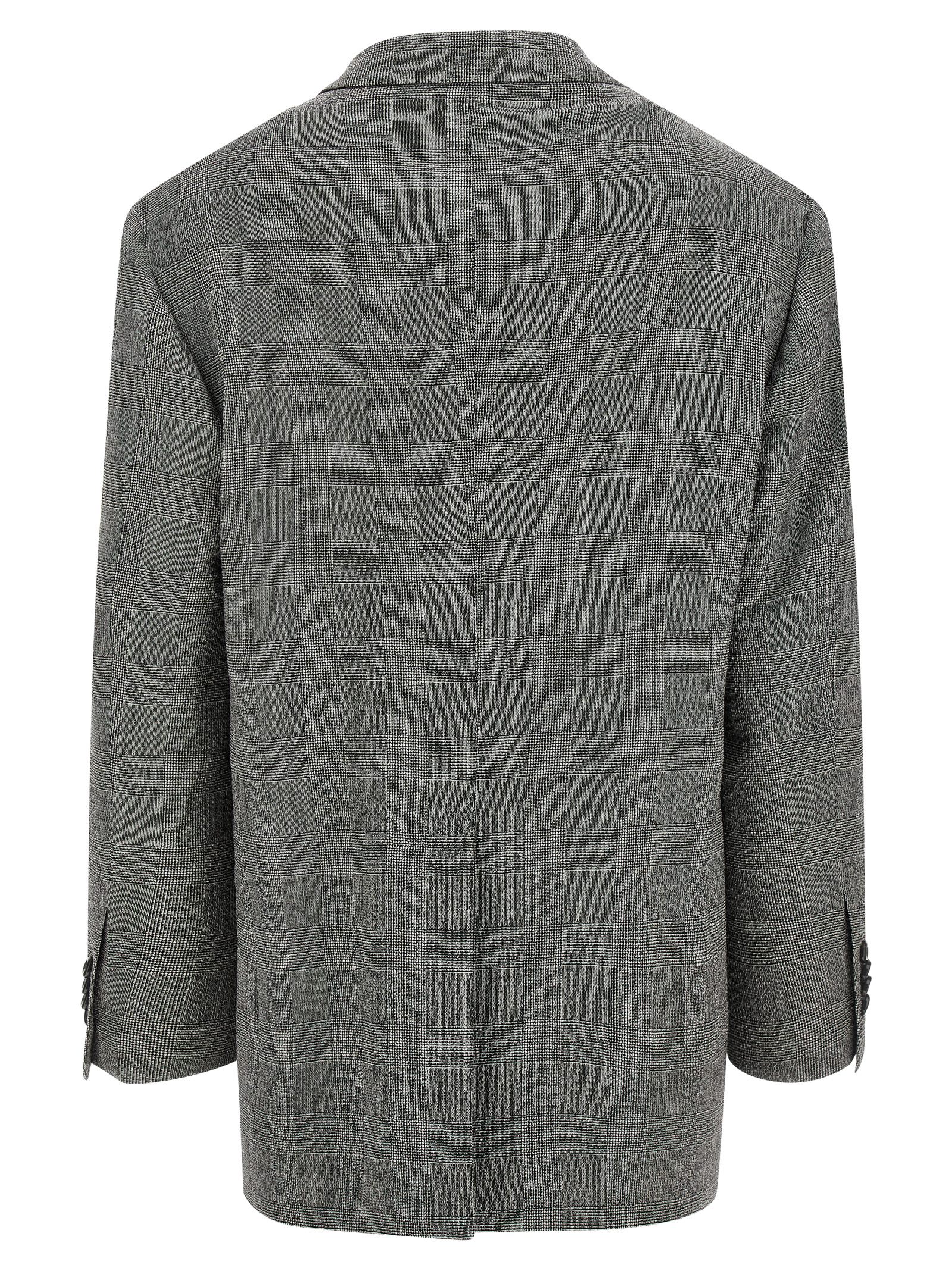 ‘Cecily’ Prince of Wales patterned virgin wool single-breasted blazer with front horn button closure, mirror lapels, breast pocket, flap pockets, structured shoulder straps, long sleeves, back split, cupro lining.