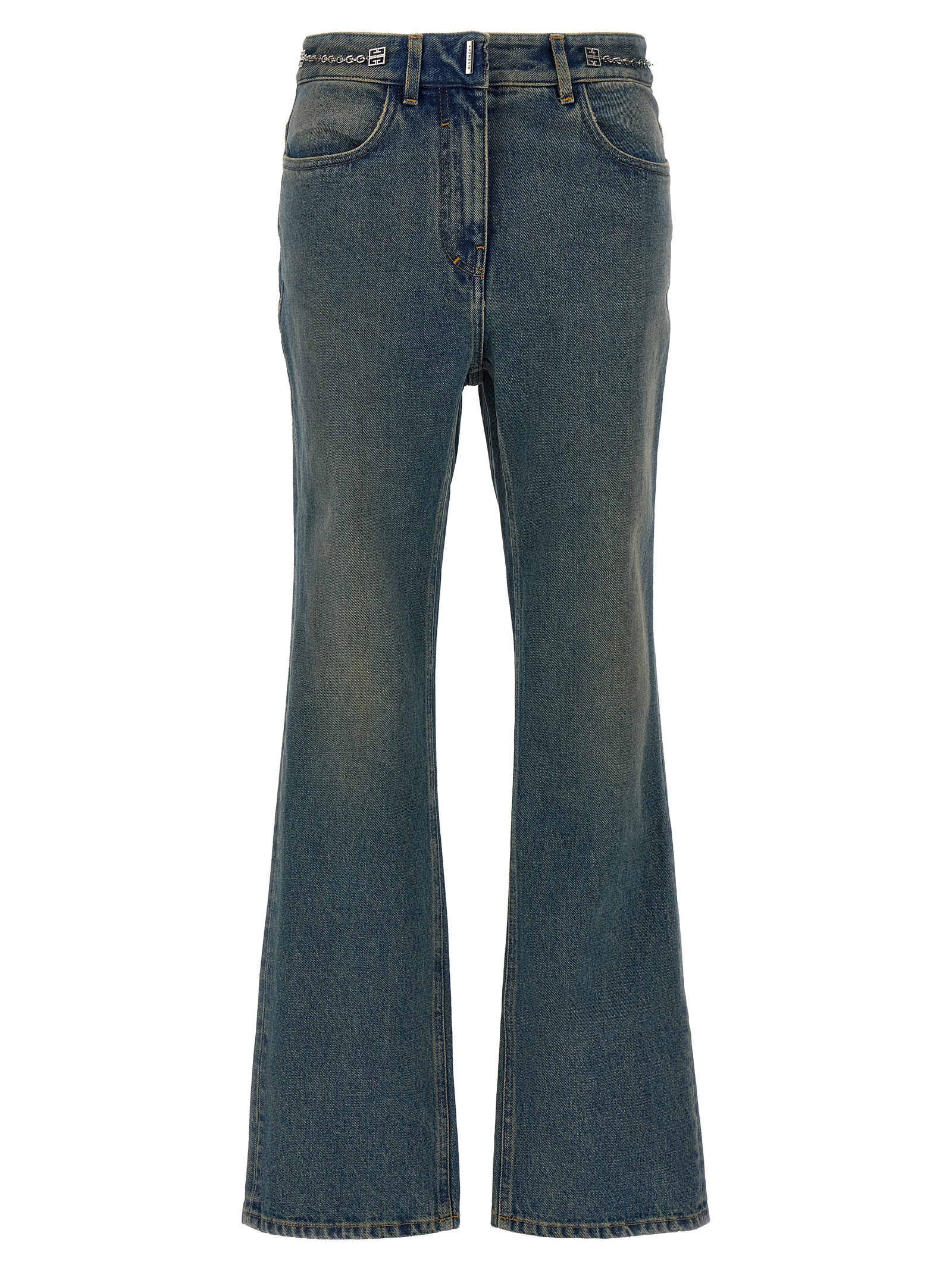 Denim jeans with logo waist detail with metal chain, slightly bootcut leg, medium waist with zip and button closure.