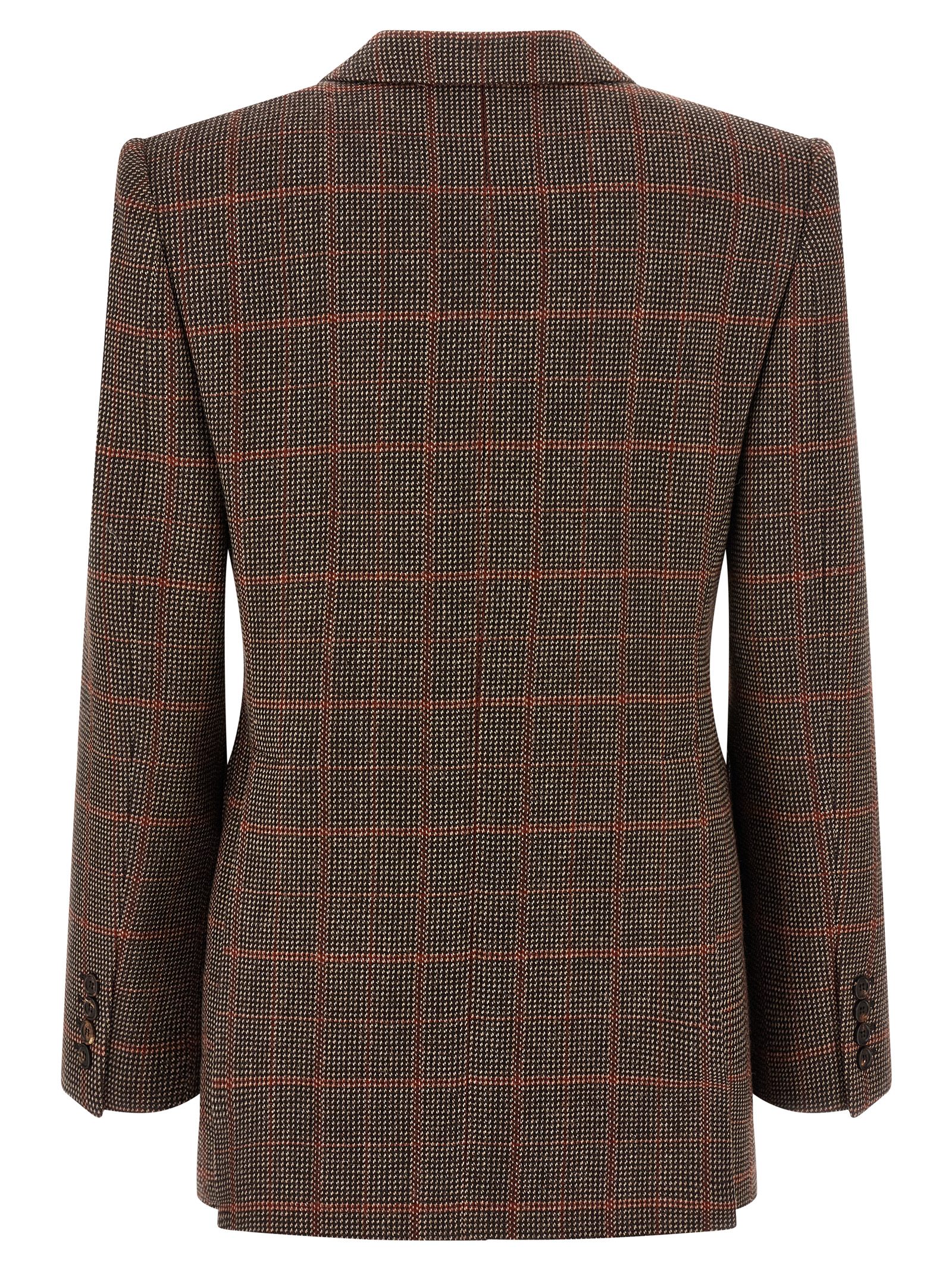 Single-breasted patterned wool blazer with front button closure, oversized patch pockets, structured shoulder strap with light toe, mirror lapels, back vents, lining.