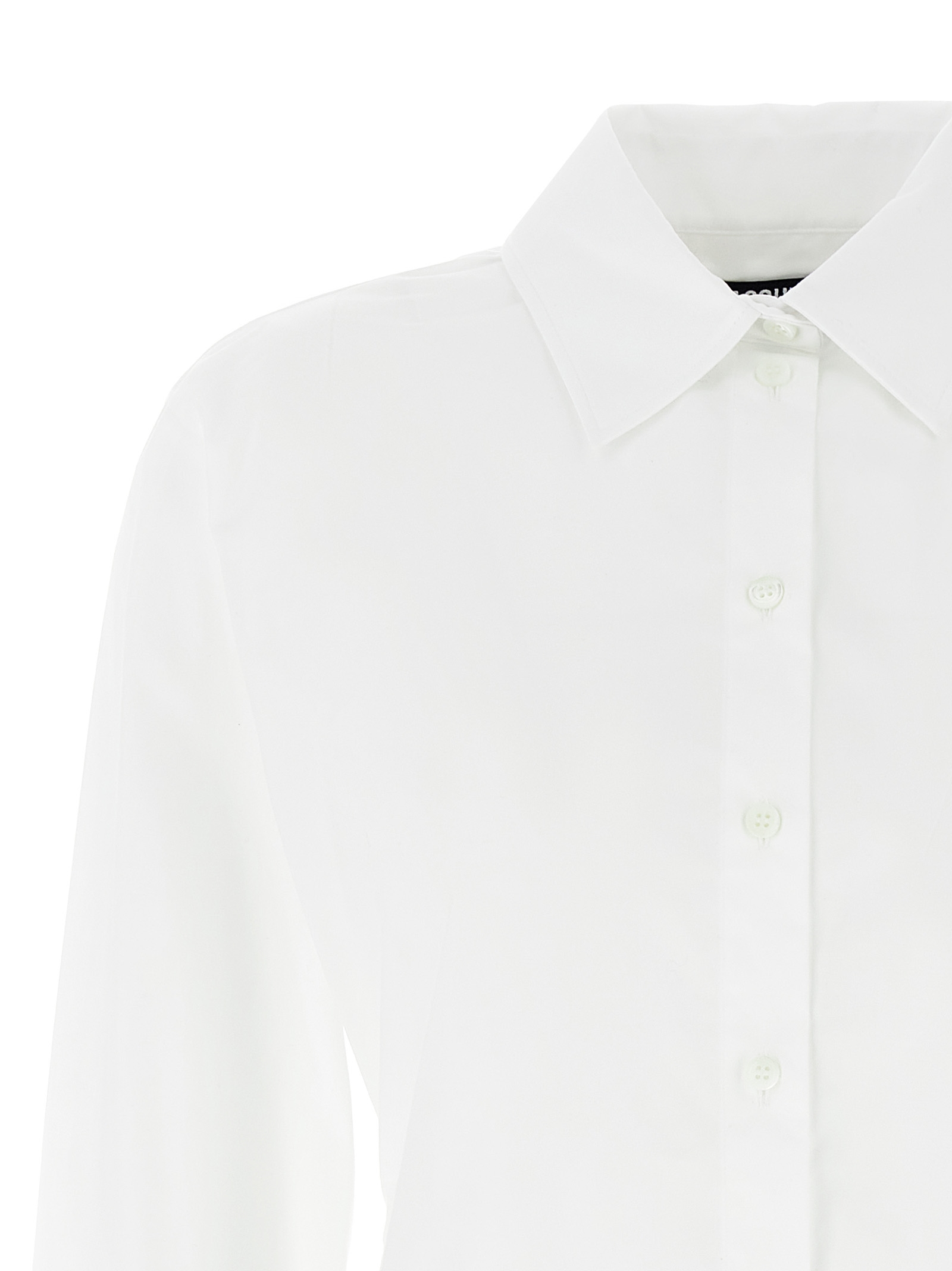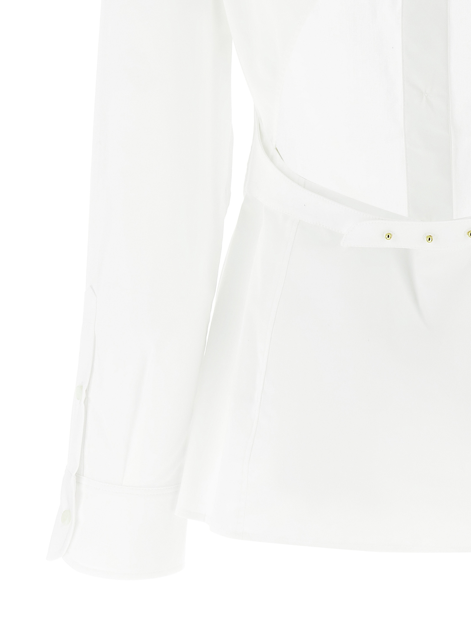 ‘Chemise De Costume’ stretch cotton poplin shirt with front button closure, long cuffed sleeves, back cut-out detail and adjustable strap.
