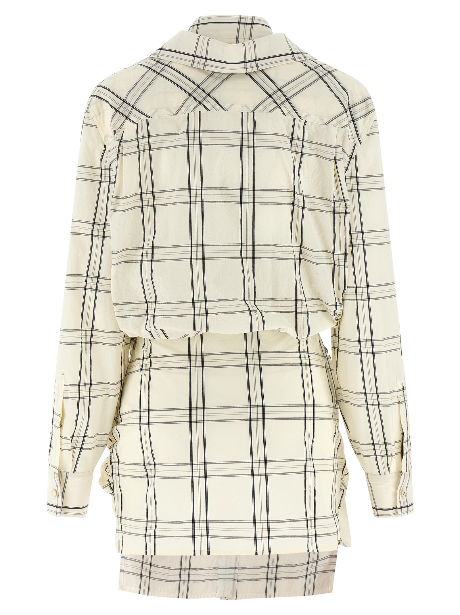 Check-print cotton poplin mini dress with wallet shirt style, logo embroidery and front button closure, long cuffed sleeves, and asymmetrical hem.
