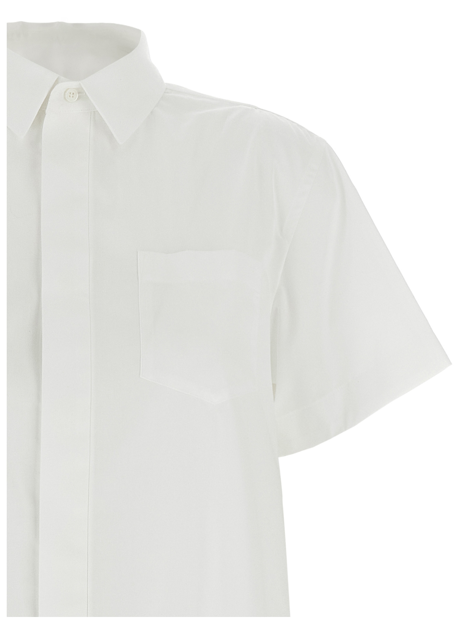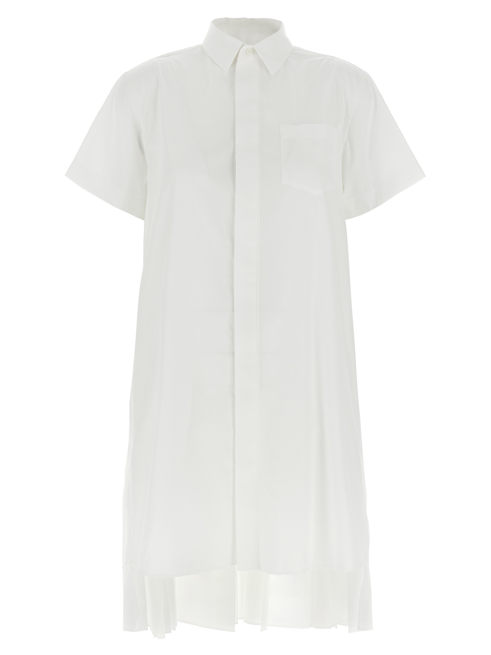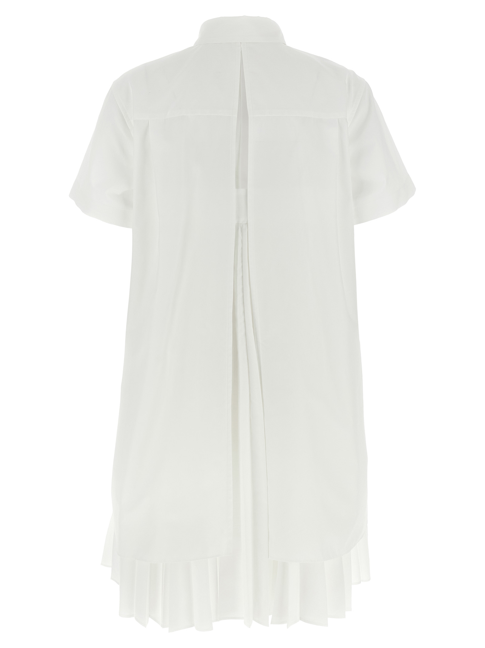 Mini dress in cotton poplin, shirt model with pleated fabric inserted, short sleeves, front button closure, pockets.