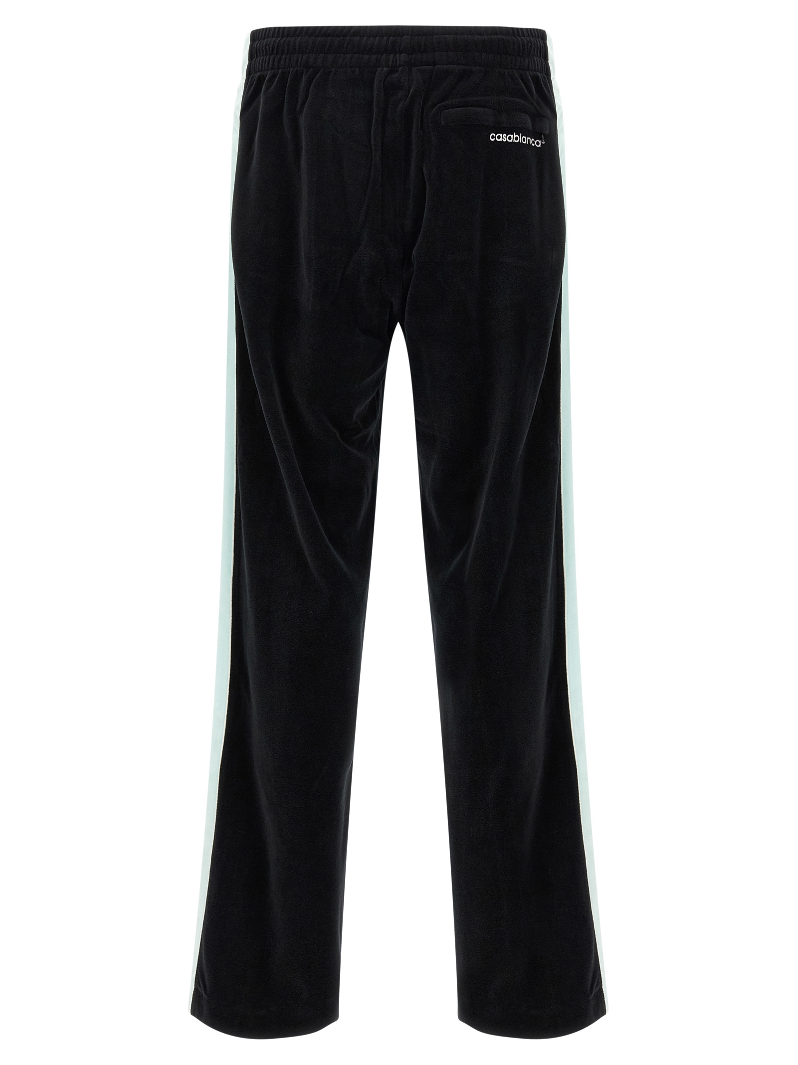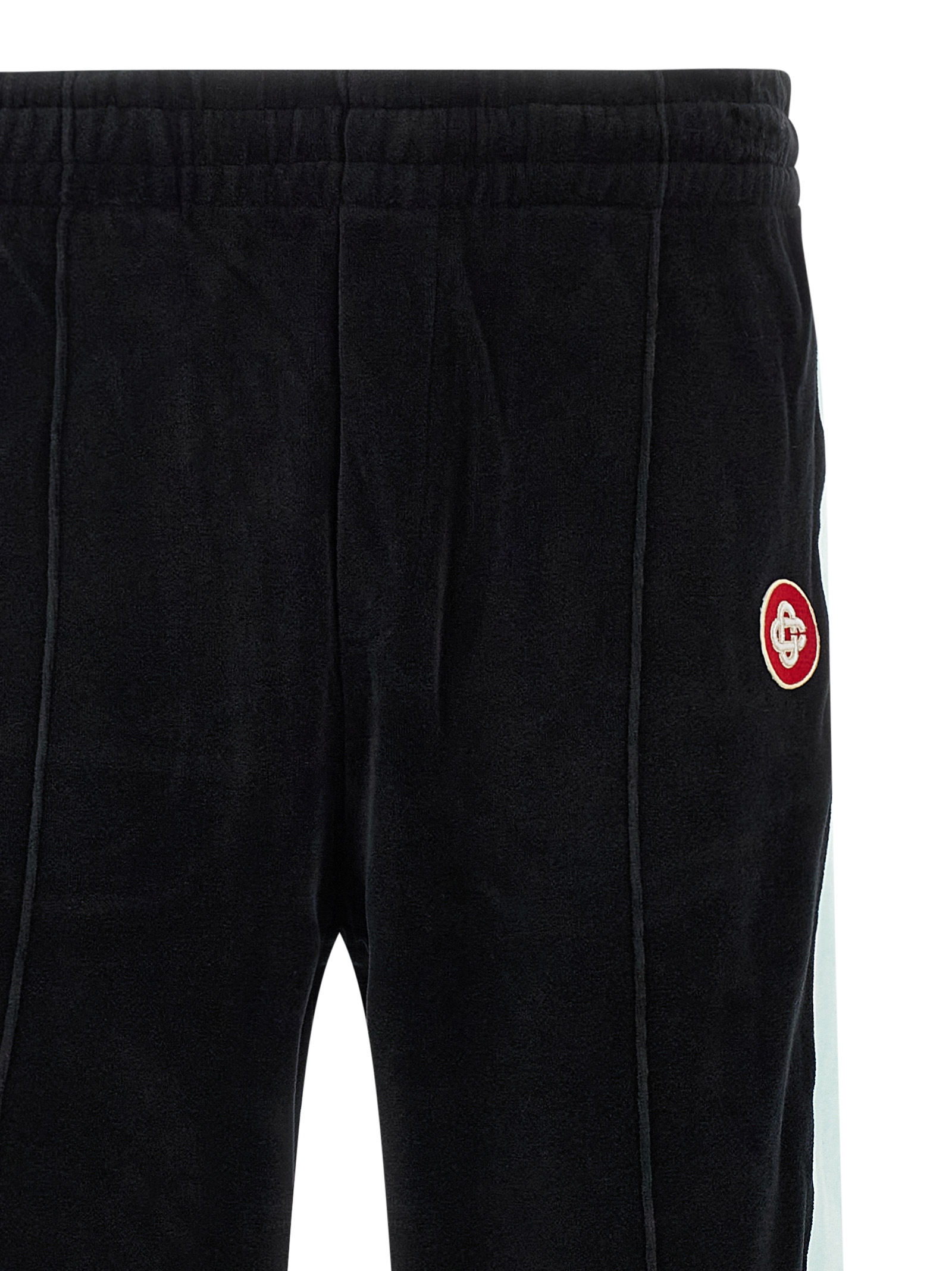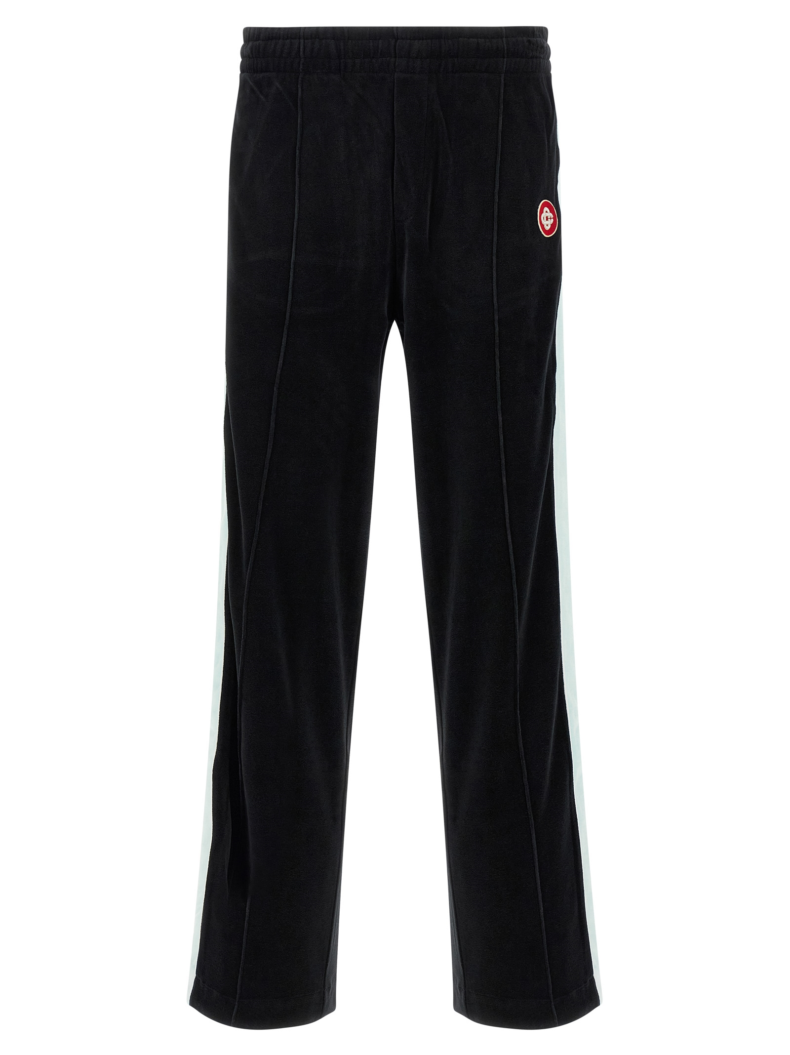 Chenille pants with contrast details, front logo patch, adjustable drawstring elastic waistband, pockets, straight leg, back logo embroidery.