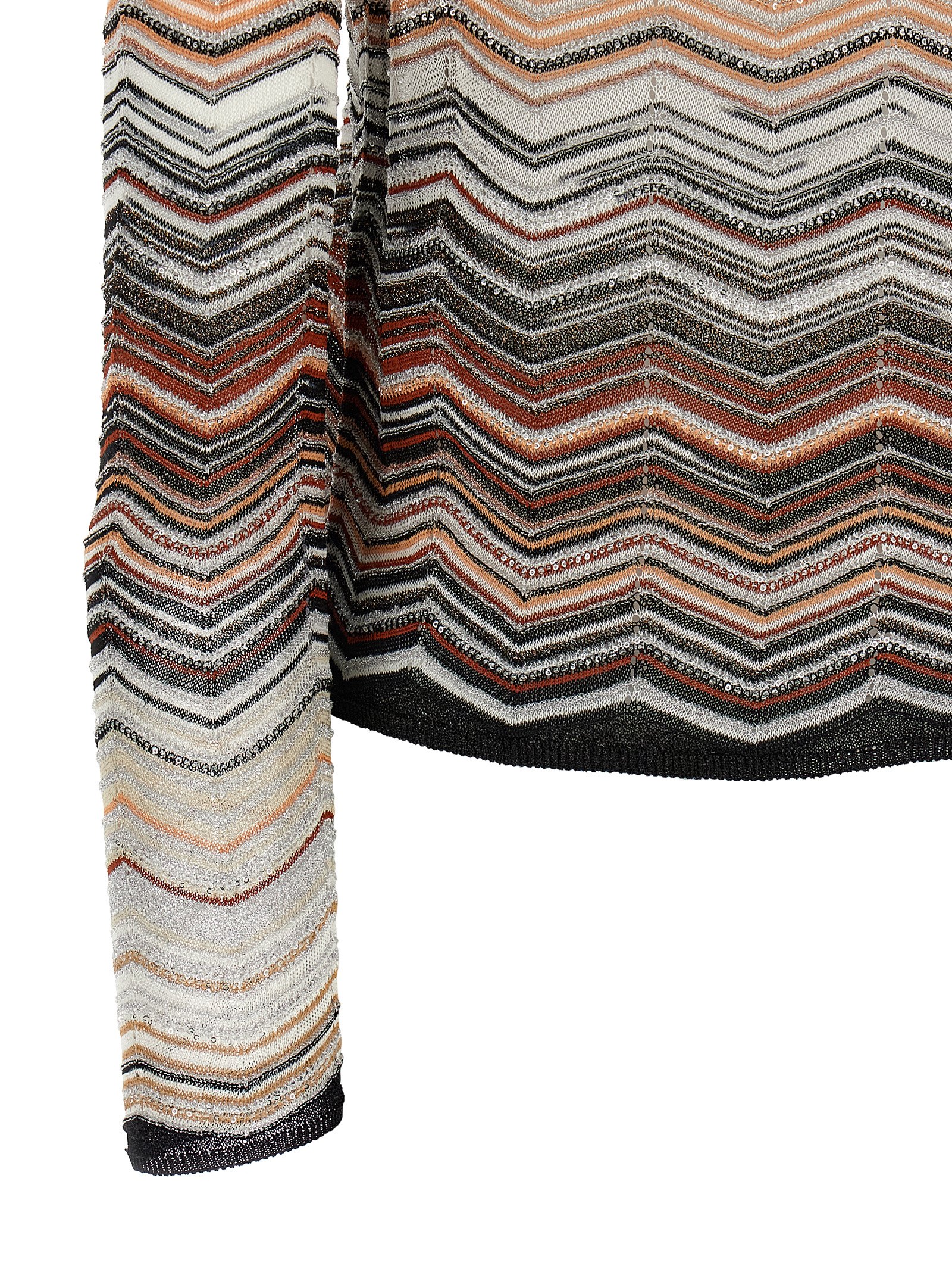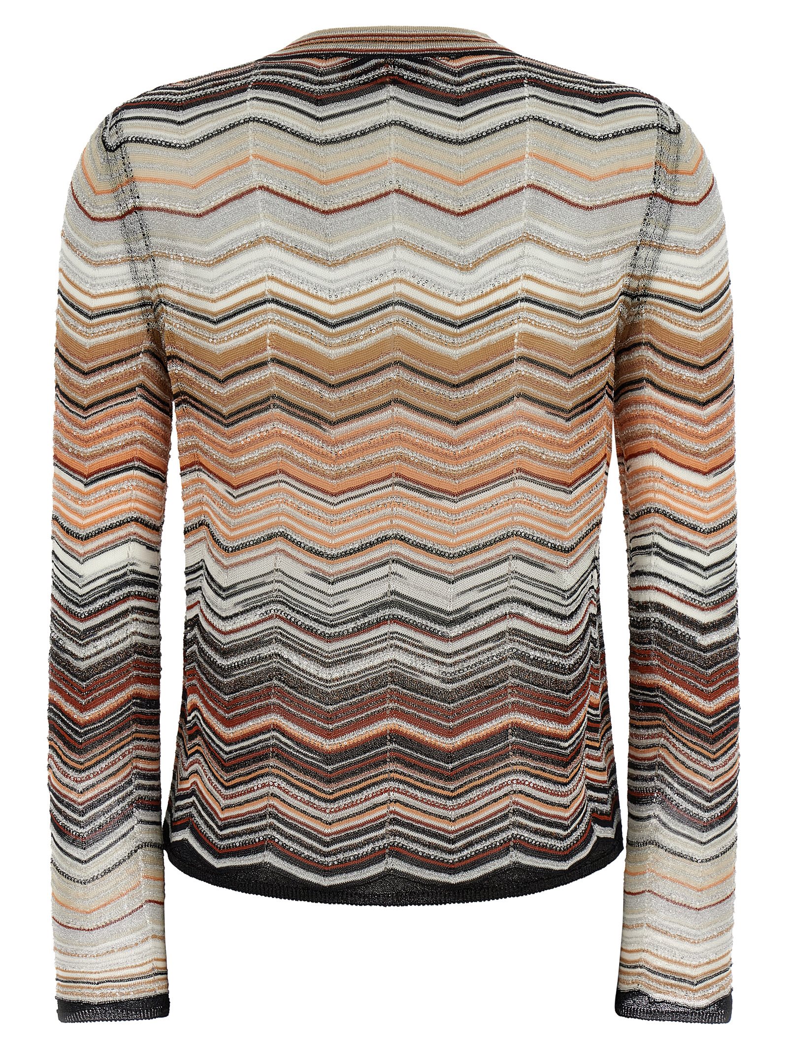 Chevron lamé viscose cardigan with all-over sequin appliqué, V-neck, front button closure, and long sleeves.